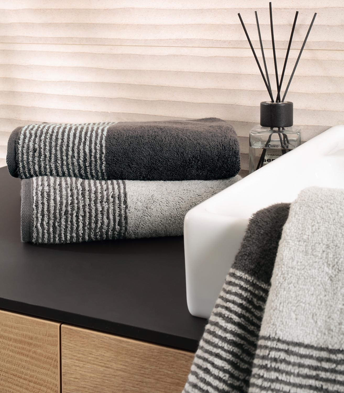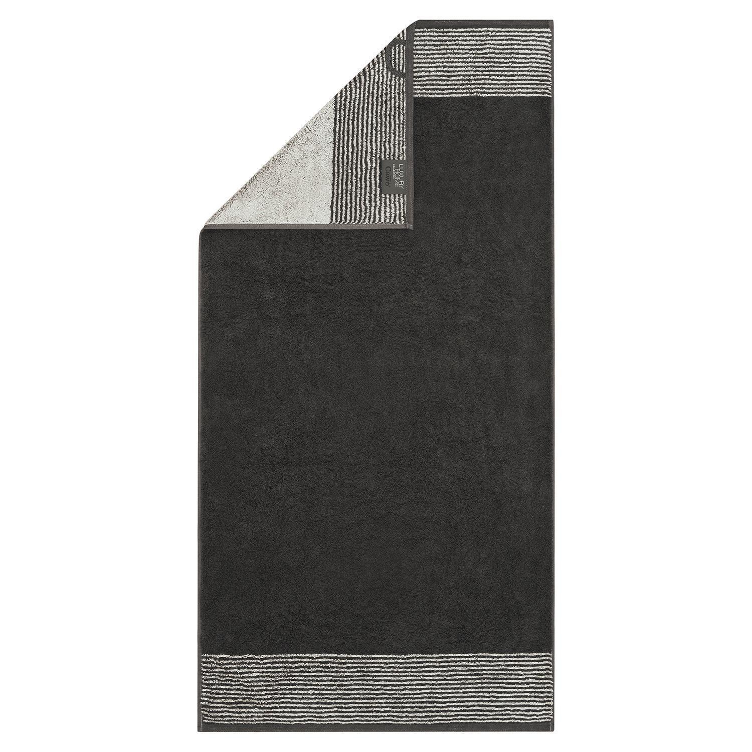 Das Cawö Duschtuch TWO TONE in Schwarz und Grau überzeugt mit seinem eleganten Streifendesign. Es misst 80 x 150 cm und besteht aus weicher Baumwolle. Die Vorderseite zeigt feine Streifen in Grau auf schwarzfarbenem Grund, während die Rückseite das Muster farblich umgekehrt darstellt. Das Duschtuch ist waschbar bis 60 °C, trocknergeeignet und mit einer praktischen Aufhängeschlaufe ausgestattet.