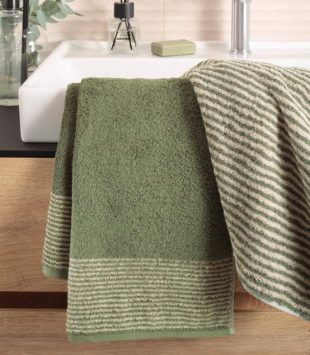 Das Cawö Duschtuch TWO TONE in Grün und Creme überzeugt mit seinem eleganten Streifendesign. Es misst 80 x 150 cm und besteht aus weicher Baumwolle. Die Vorderseite zeigt feine Streifen in Creme auf grünfarbenem Grund, während die Rückseite das Muster farblich umgekehrt darstellt. Das Duschtuch ist waschbar bis 60 °C, trocknergeeignet und mit einer praktischen Aufhängeschlaufe ausgestattet.