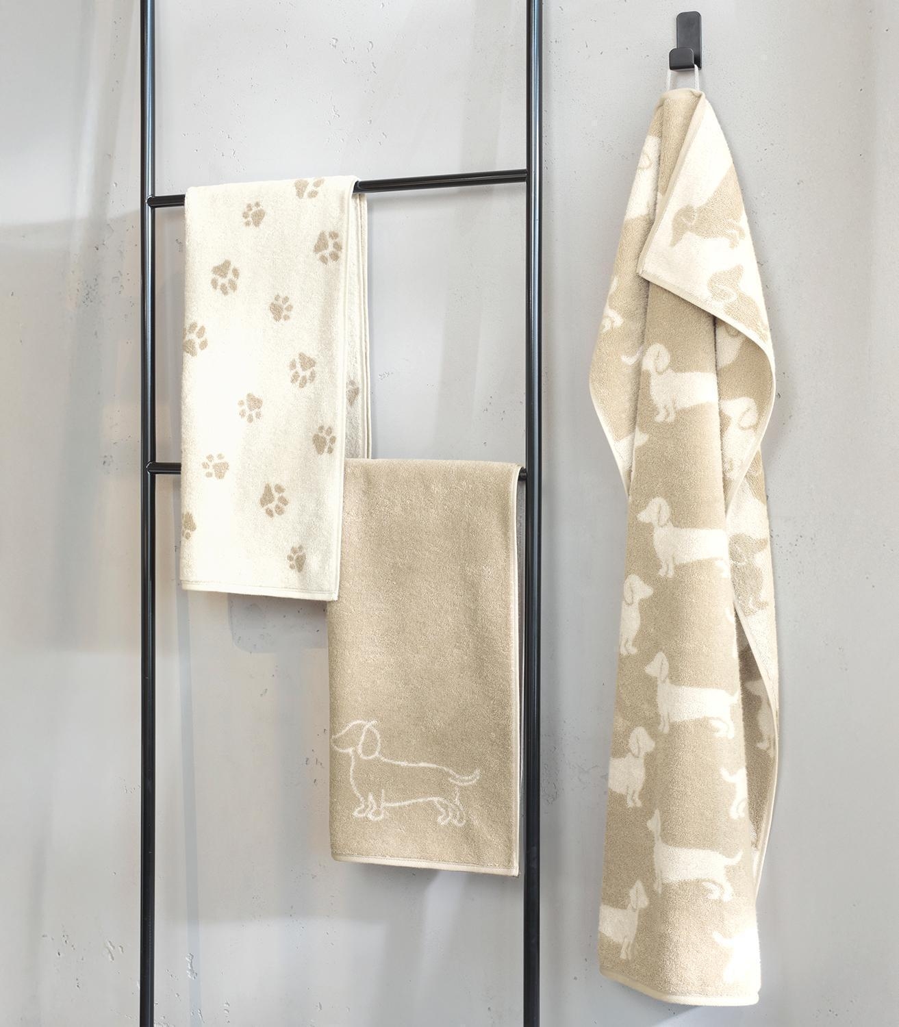 Das Duschtuch WE LOVE DOGS stammt von der Marke Cawö und besteht aus Baumwolle in den Farben Beige und Braun. Es ist beidseitig mit Dackelmotiven versehen. Zum Aufhängen ist eine Öse integriert. Das Duschtuch kann bei bis zu 60 °C gewaschen werden und ist für den Trockner geeignet. Gefertigt wird es in Deutschland. Das Flächengewicht beträgt 500 g/m². Die Maße liegen bei 150 cm in der Länge und 80 cm in der Breite.