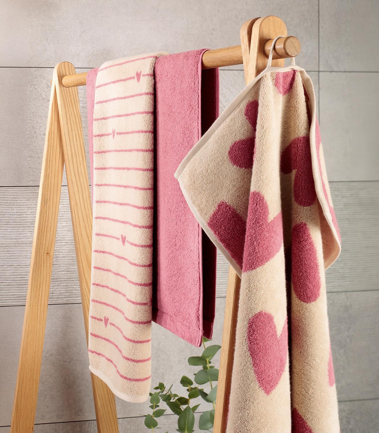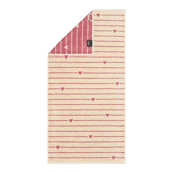 Das Handtuch HEART BEATS von Cawö überzeugt mit seinem liebevollen Design in Beige und Rosa. Die Vorderseite ist beige und mit rosa Herzmotiven und Streifen versehen, während die Rückseite in Rosa mit beigen Herzen und Streifen gestaltet ist. Mit einer Größe von 50 x 100 cm bietet es angenehmen Komfort. Gefertigt aus Baumwolle, ist es saugfähig und weich. Eine praktische Schlaufe erleichtert das Aufhängen. Zudem ist das Handtuch trocknergeeignet und bis 60 °C waschbar.