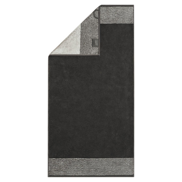 Das Cawö Handtuch TWO TONE in Schwarz und Grau überzeugt mit seinem eleganten Streifendesign. Es misst 50 x 100 cm und besteht aus weicher Baumwolle. Die Vorderseite zeigt feine Streifen in Grau auf schwarzfarbenem Grund, während die Rückseite das Muster farblich umgekehrt darstellt. Das Duschtuch ist waschbar bis 60 °C, trocknergeeignet und mit einer praktischen Aufhängeschlaufe ausgestattet.