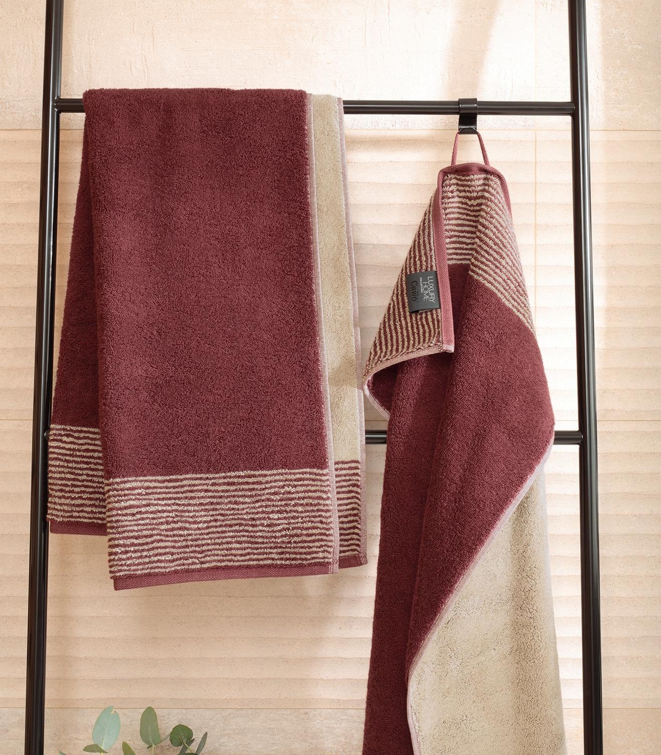Das Cawö Handtuch TWO TONE in Bordeaux und Creme überzeugt mit seinem eleganten Streifendesign. Es misst 50 x 100 cm und besteht aus weicher Baumwolle. Die Vorderseite zeigt feine Streifen in Creme auf bordeauxfarbenem Grund, während die Rückseite das Muster farblich umgekehrt darstellt. Das Duschtuch ist waschbar bis 60 °C, trocknergeeignet und mit einer praktischen Aufhängeschlaufe ausgestattet.
