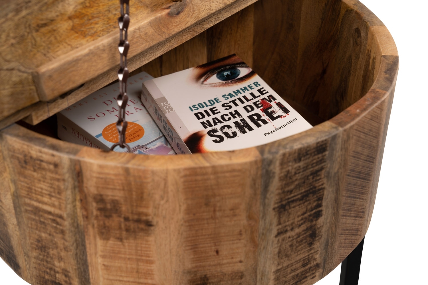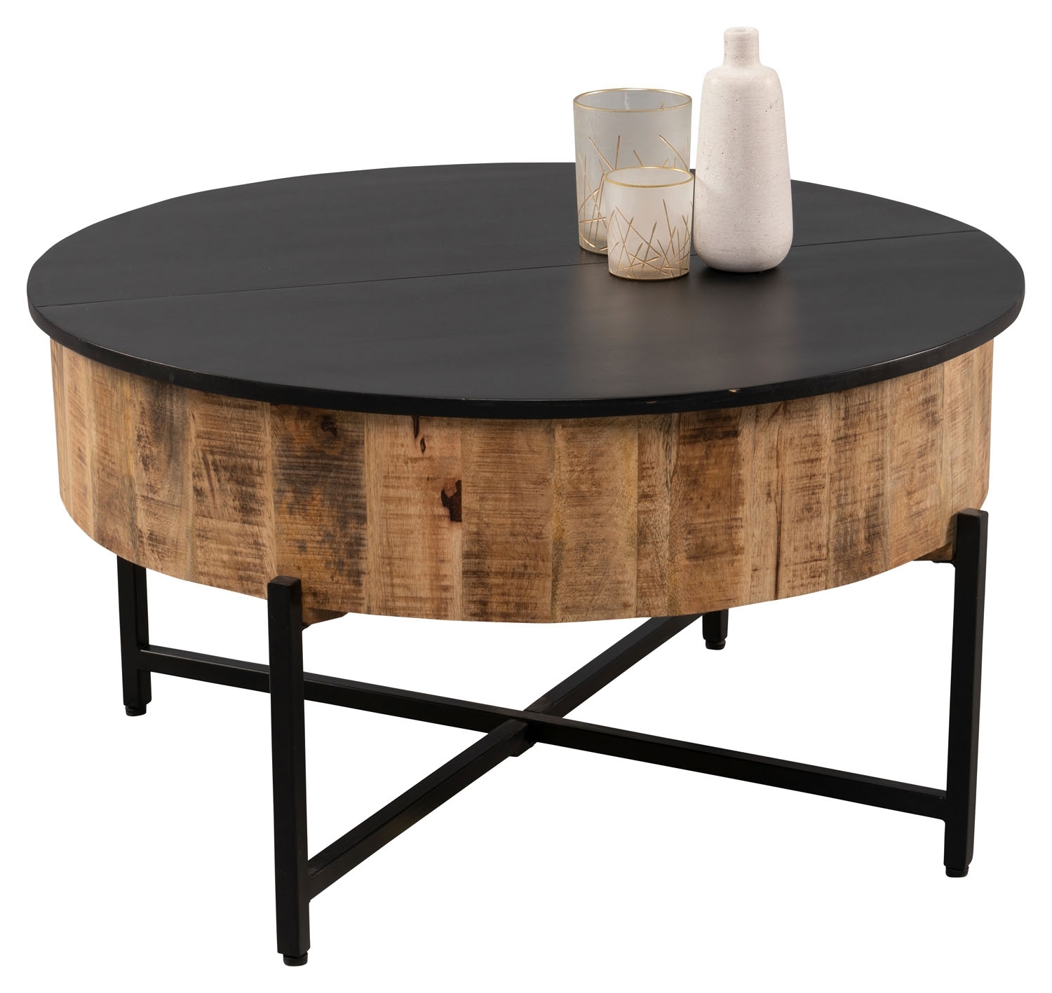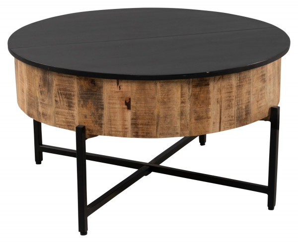 Der Couchtisch FEMKE ist ein attraktives Möbelstück für Ihr Wohnzimmer. Hergestellt aus Mangoholz in Braun mit einer hochklappbaren Tischplatte in Schwarz bietet er einen interessanten Kontrast. Das Metallgestell in Schwarz sorgt für Stabilität und modernes Flair. Mit integriertem Stauraum bietet der Tisch Platz für Zeitschriften, Fernbedienungen und andere Gegenstände. Mit einem Durchmesser von 80 cm und einer Höhe von 46 cm passt er perfekt in verschiedenste Wohnbereiche und bietet ausreichend Platz für Getränke und Snacks während gemütlicher Abende auf der Couch.