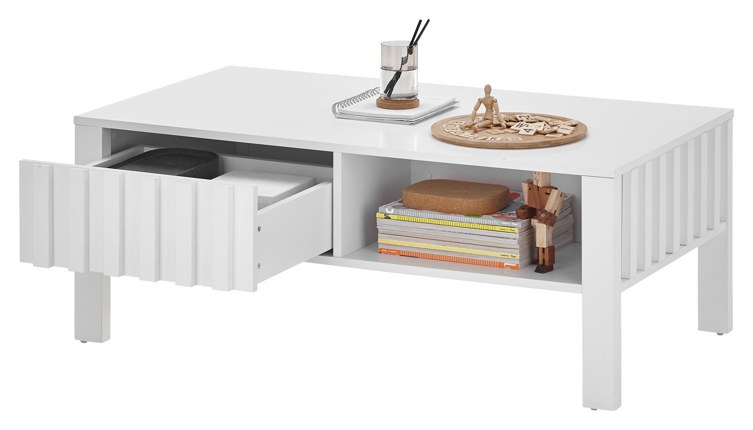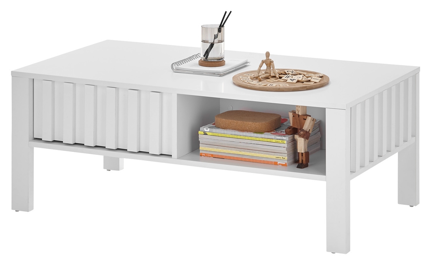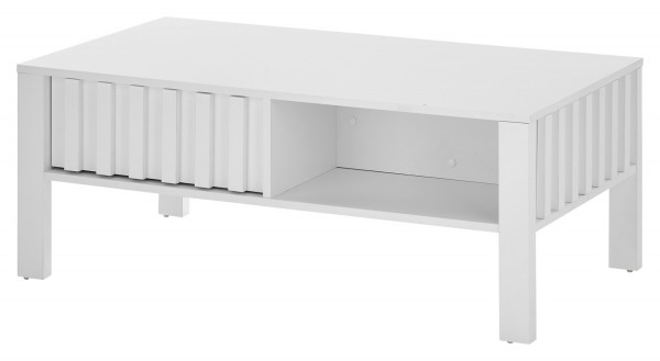Der Couchtisch MENNA ist eine praktische und stilvolle Ergänzung für Ihr Wohnzimmer. In strahlendem Weiß gehalten, verleiht er Ihrem Raum eine moderne Note. Ausgestattet mit einer Schublade und einem Ablagefach bietet er ausreichend Stauraum für Fernbedienungen, Zeitschriften und andere Wohnaccessoires. Mit einer Breite von 107 cm, einer Höhe von 42 cm und einer Tiefe von 60 cm bietet der Tisch genügend Platz für Ihre Bedürfnisse. Die Tischplatte und das Gestell bestehen aus Holzwerkstoff, was für Stabilität und Langlebigkeit sorgt.