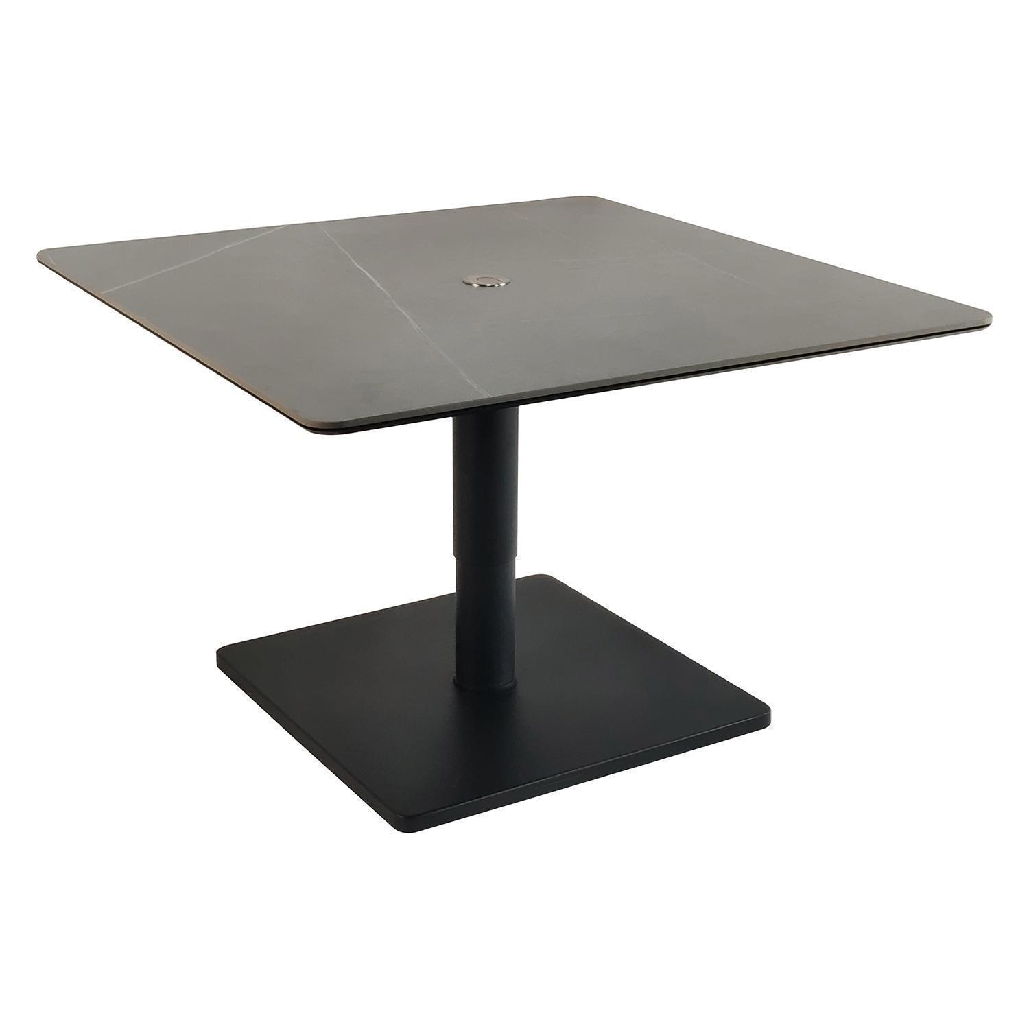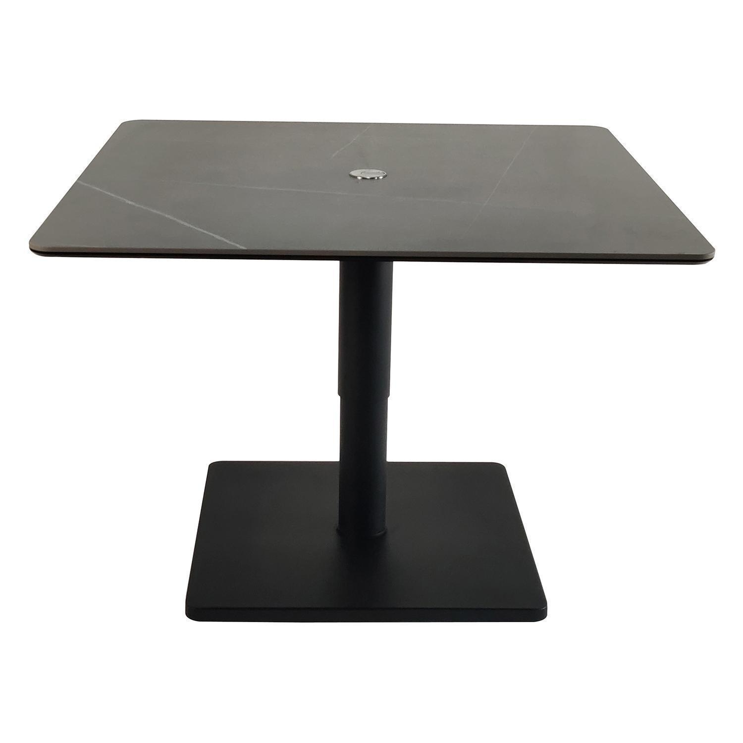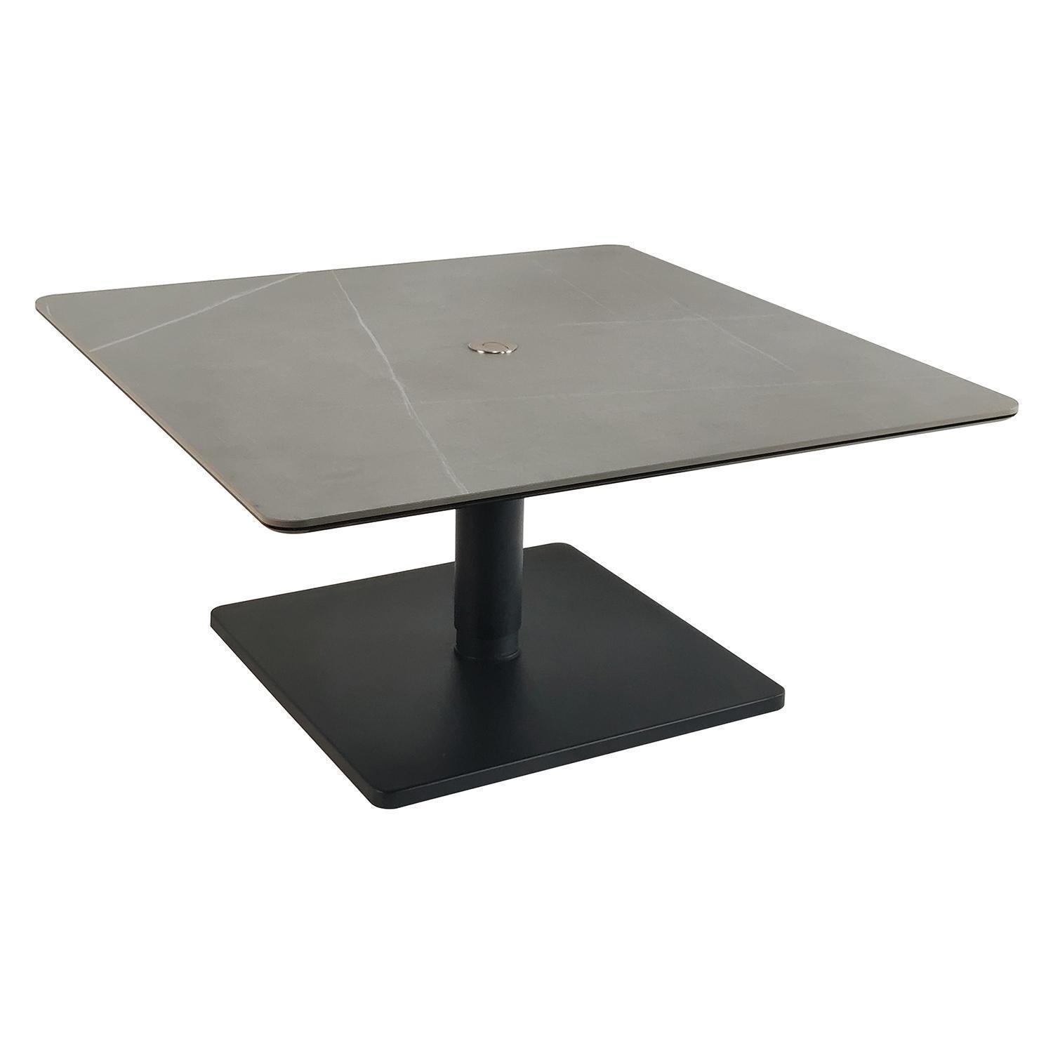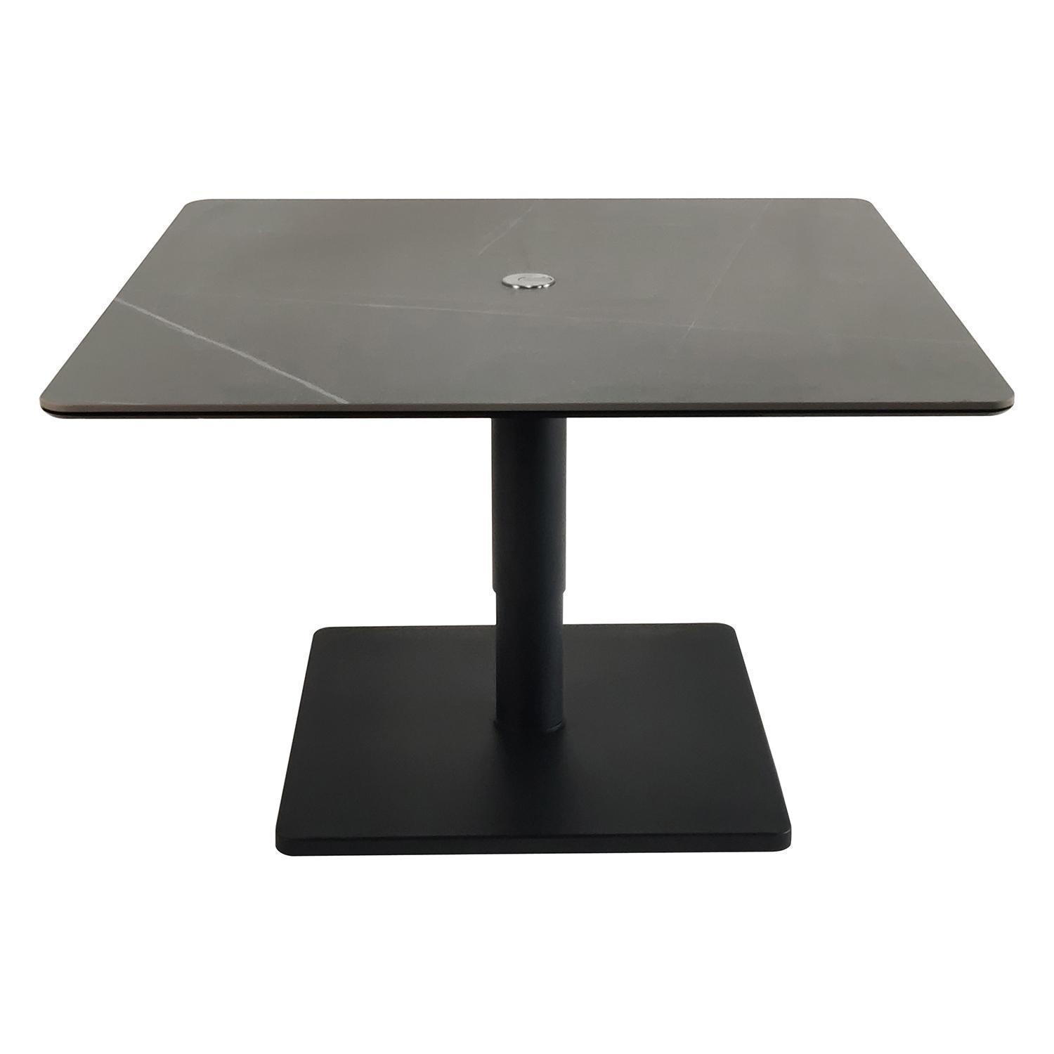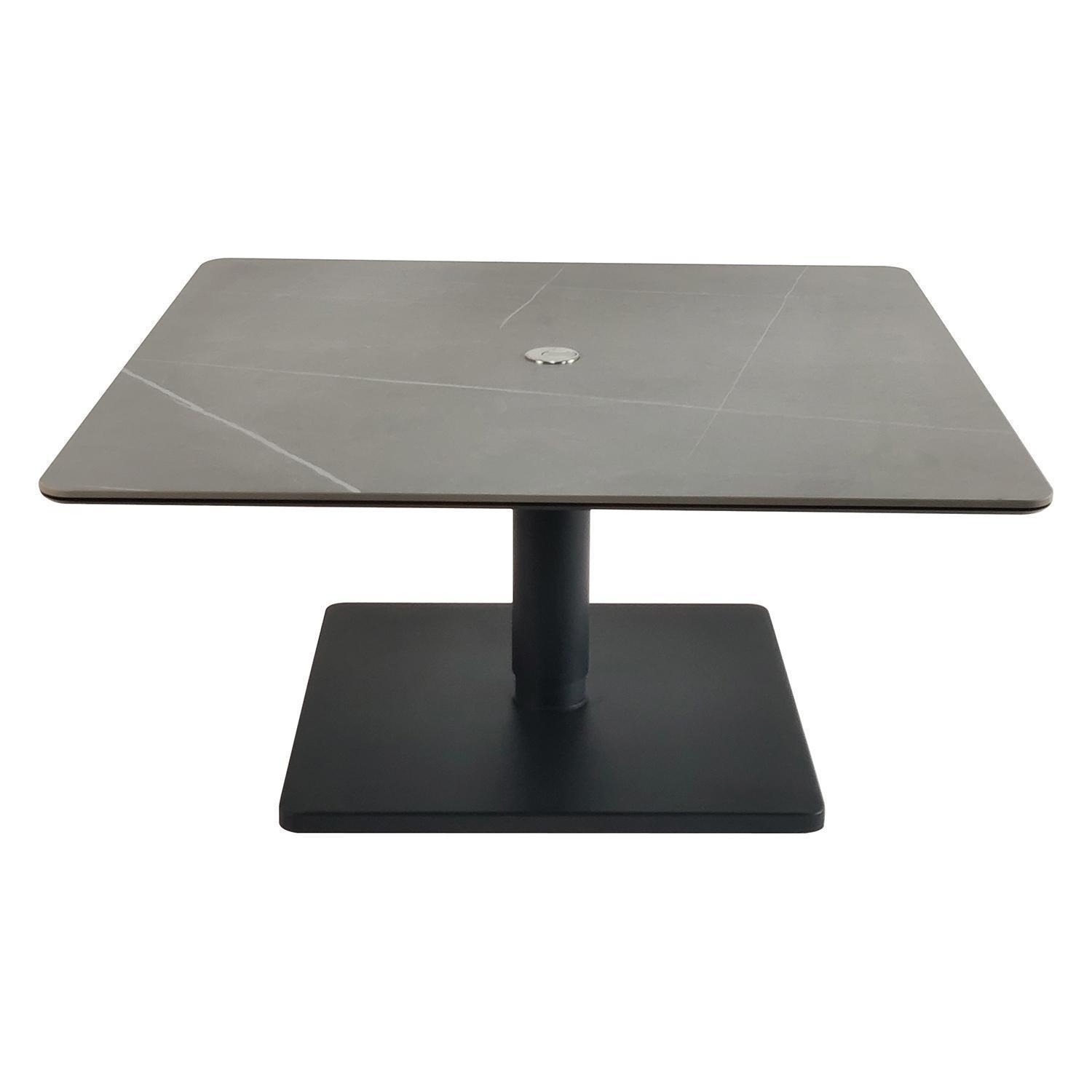 Der Couchtisch OLLAND verfügt über eine 6 mm starke Tischplatte aus grauer Keramik auf einer 8 mm starken Platte aus Glas. Gestell und Unterplatte sind aus schwarzem Metall gefertigt. Die Höhe lässt sich stufenlos von 40 cm bis 58 cm verstellen. Der Tisch bietet Ablagefläche für Gegenstände wie Fernbedienungen und Zeitschriften. Die Breite beträgt 80 cm und die Tiefe ebenfalls 80 cm.