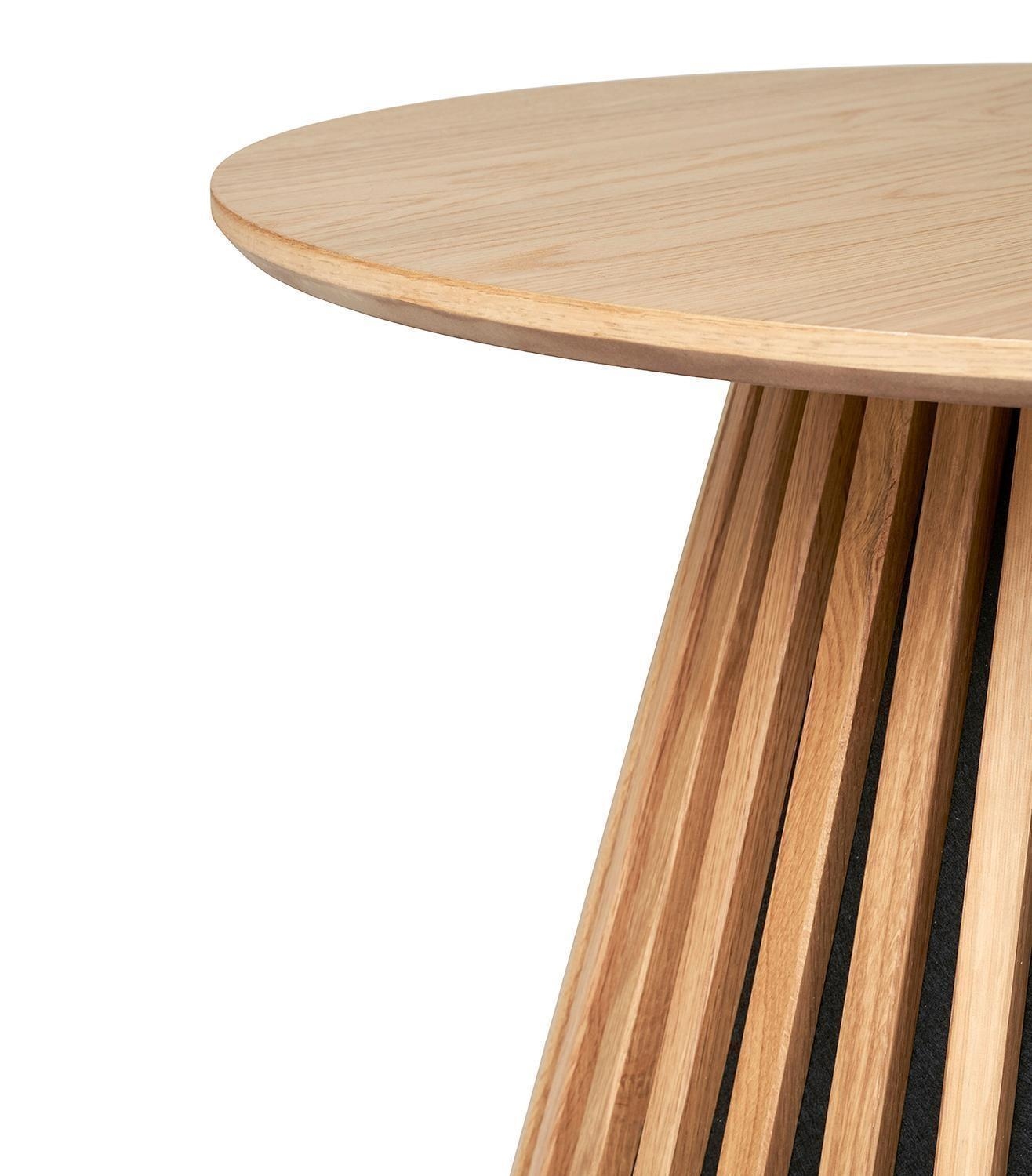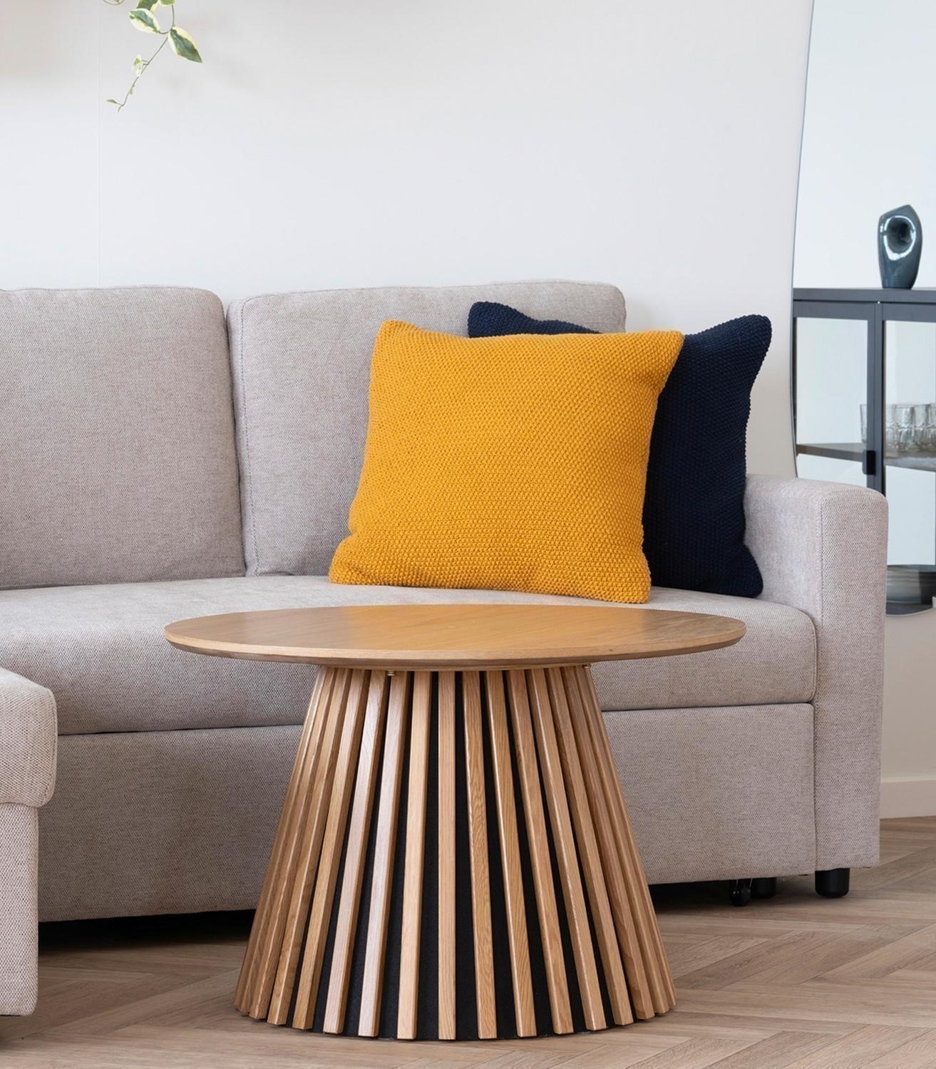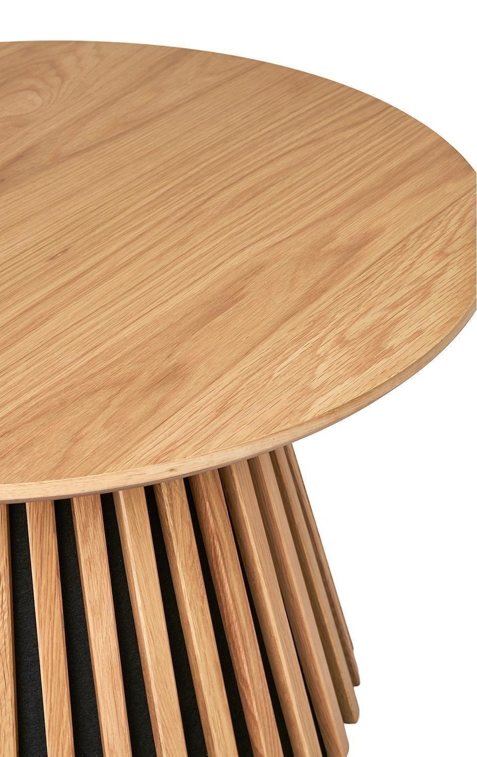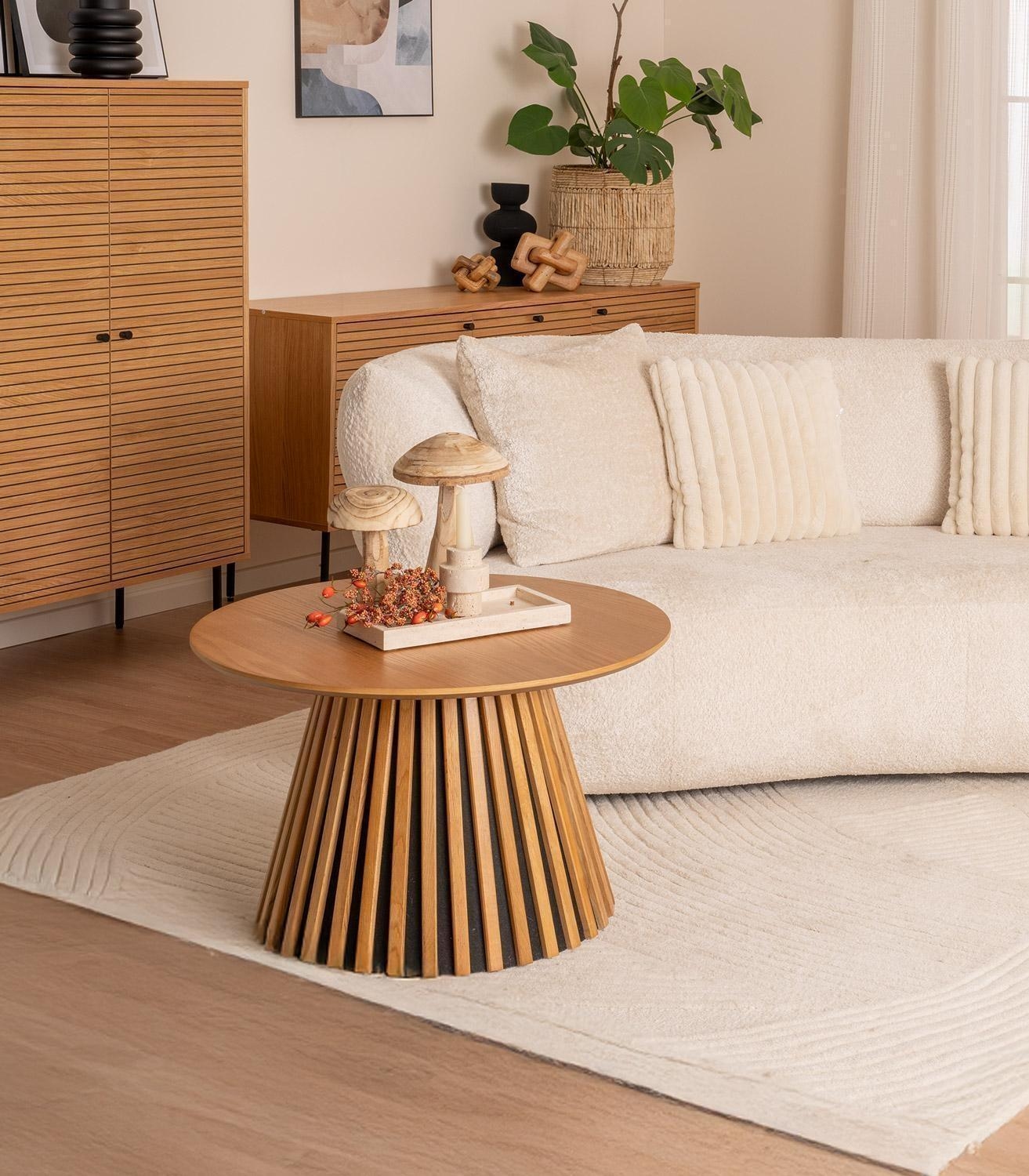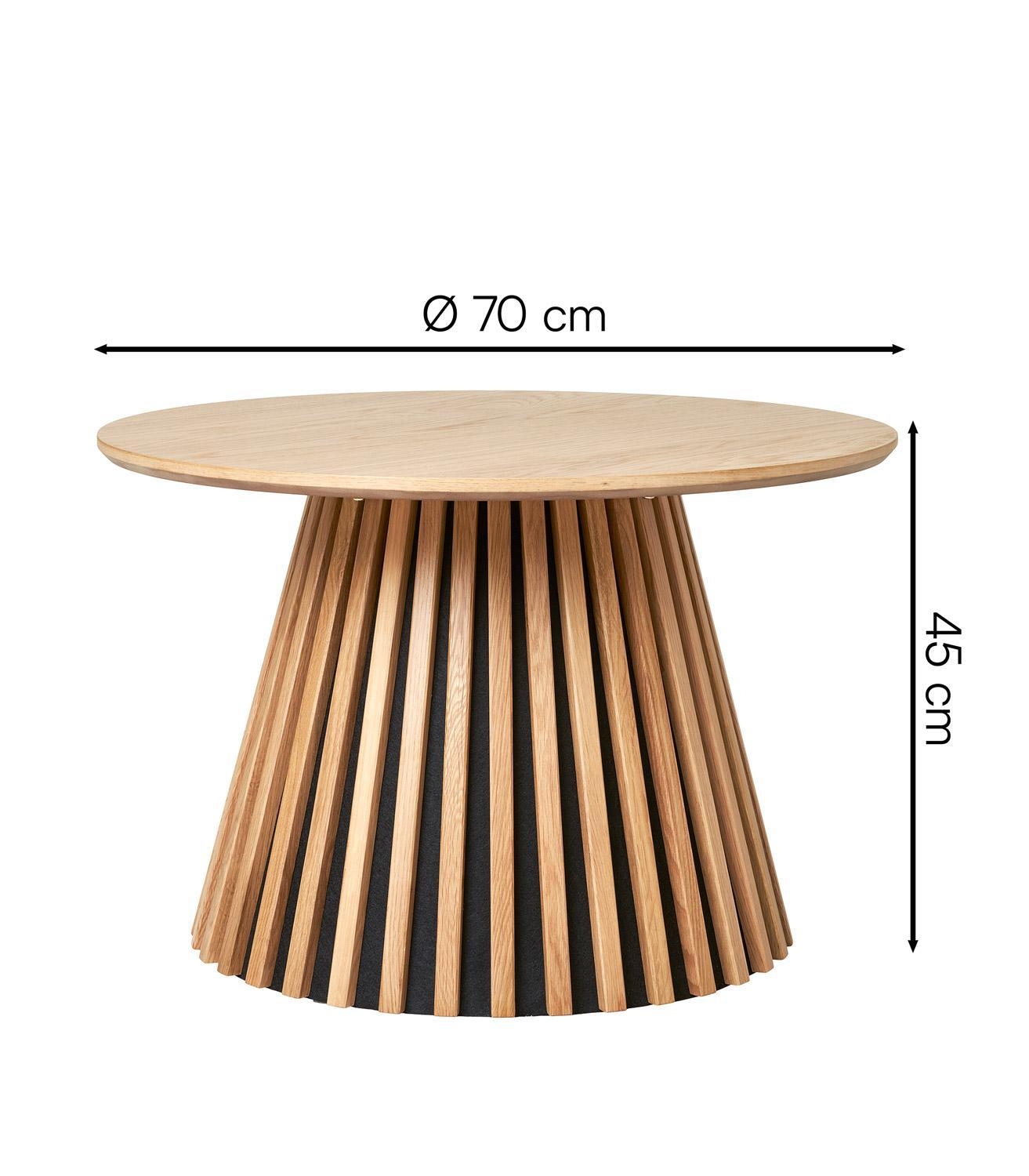 Der Couchtisch ORKAN verfügt über eine runde Tischplatte aus furniertem Eichenholz. Das Gestell besteht aus braunem MDF und sorgt für eine stabile Konstruktion. Mit einem Durchmesser von 70 cm und einer Höhe von 45 cm bietet der Tisch eine großzügige Ablagefläche. Diese eignet sich zur Aufbewahrung von Gegenständen wie Fernbedienungen oder Zeitschriften und trägt zur Ordnung im Wohnbereich bei.