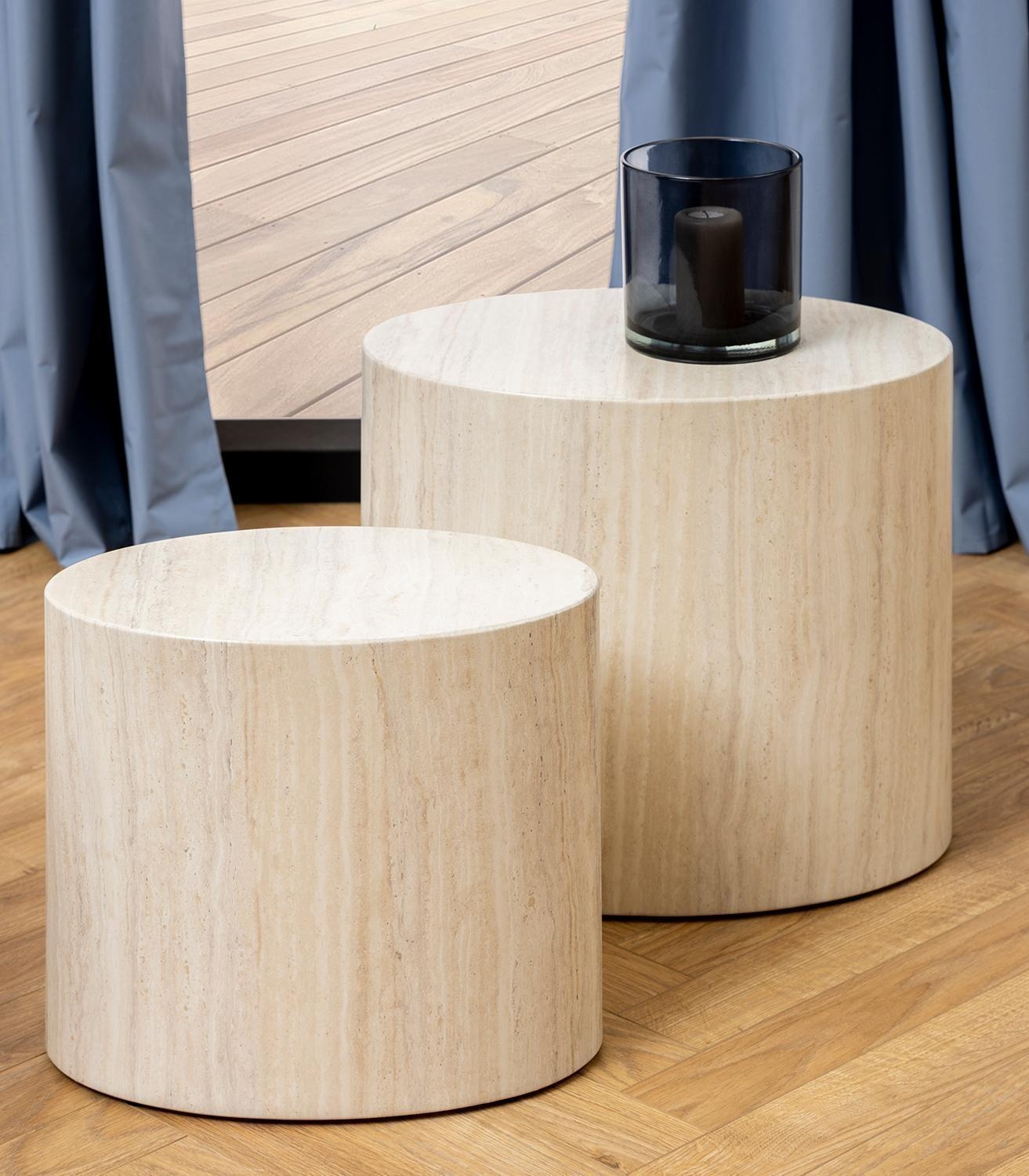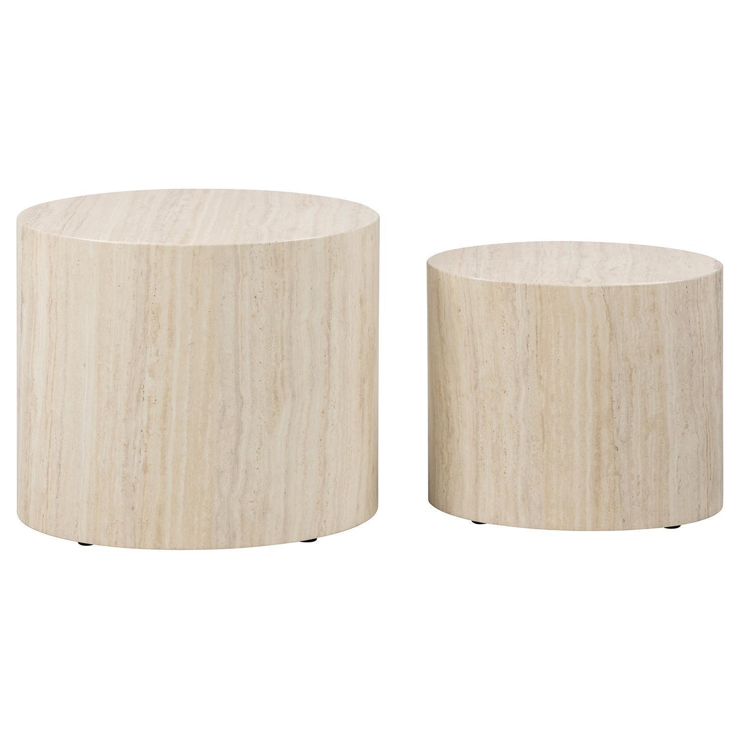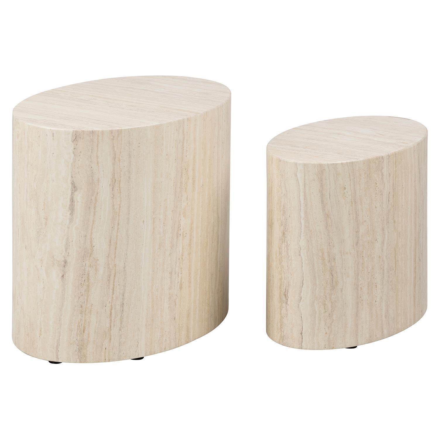 Das Couchtisch-Set MARNY besteht aus zwei Tischen in unterschiedlichen Größen. Die Tische sind aus MDF gefertigt und verfügen über eine Travertinoptik in der Farbe Beige. Das Set bietet vielseitige Einsatzmöglichkeiten im Wohnbereich und lässt sich flexibel arrangieren.