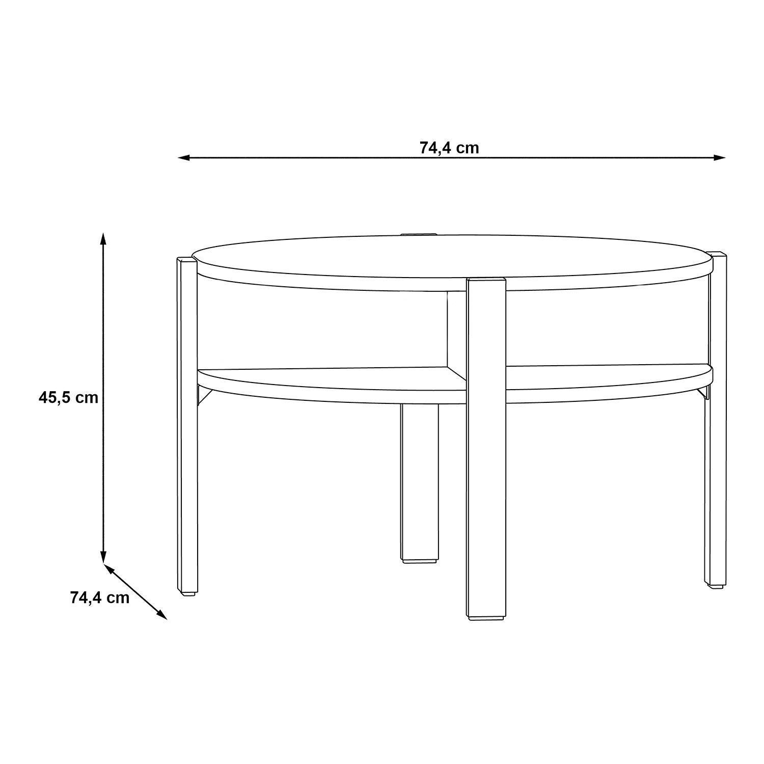 Der Couchtisch bereichert Ihr Wohnzimmer mit zeitlosem Design und praktischer Funktionalität. Im Lieferumfang enthalten ist ein Tisch mit einem Durchmesser von 75 cm und einer Höhe von 45,5 cm. Die Tischplatte besteht aus Holzwerkstoff, während auch das Gestell aus Holzwerkstoff gefertigt ist. Das Dekor in Salbeigrün matt verleiht dem Tisch eine ansprechende Optik. Als besonderes Extra verfügt der Couchtisch über Ablageflächen, die zusätzlichen Stauraum bieten und die Funktionalität des Möbelstücks erhöhen.