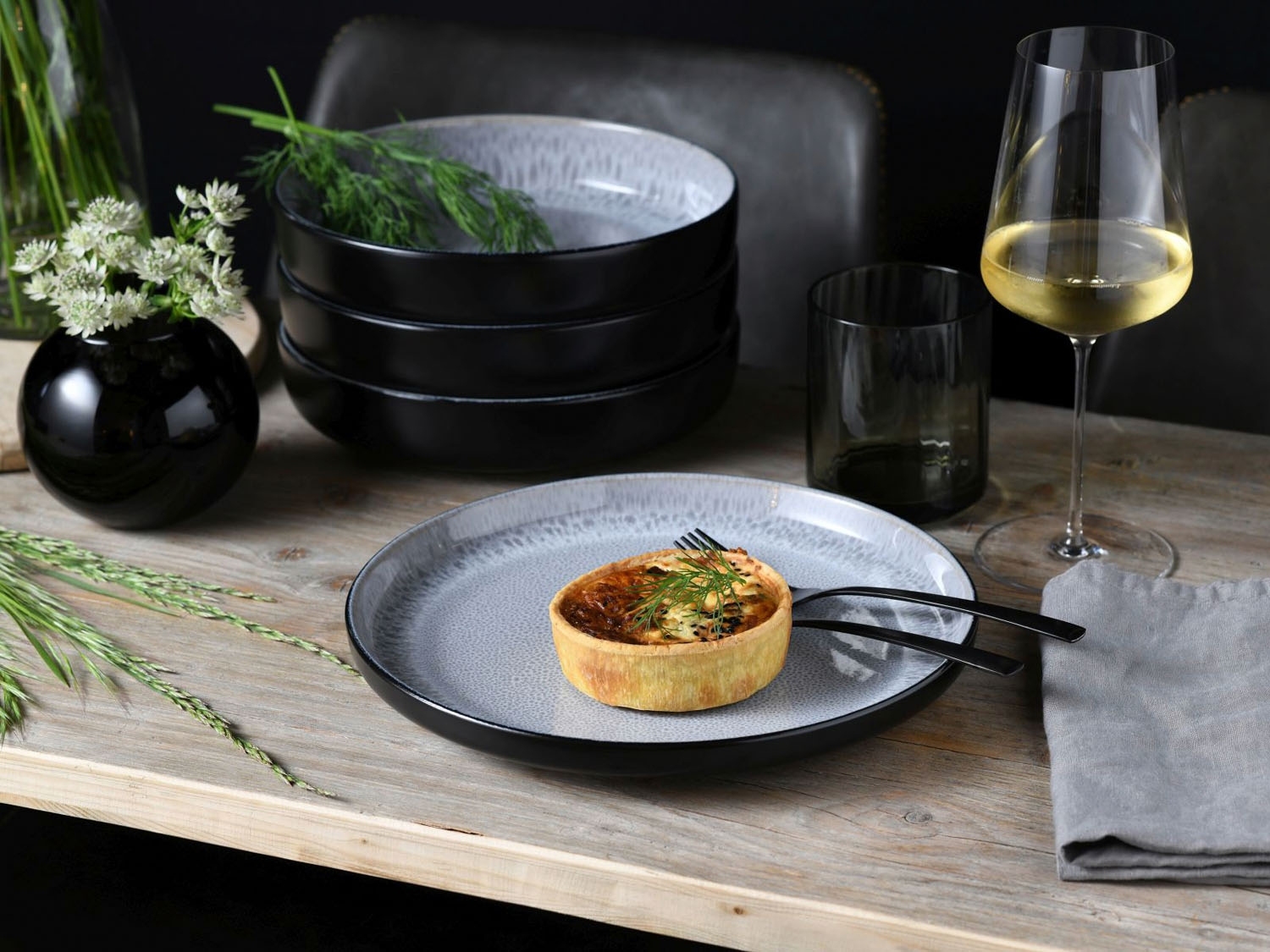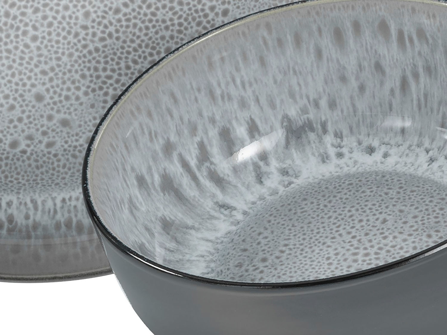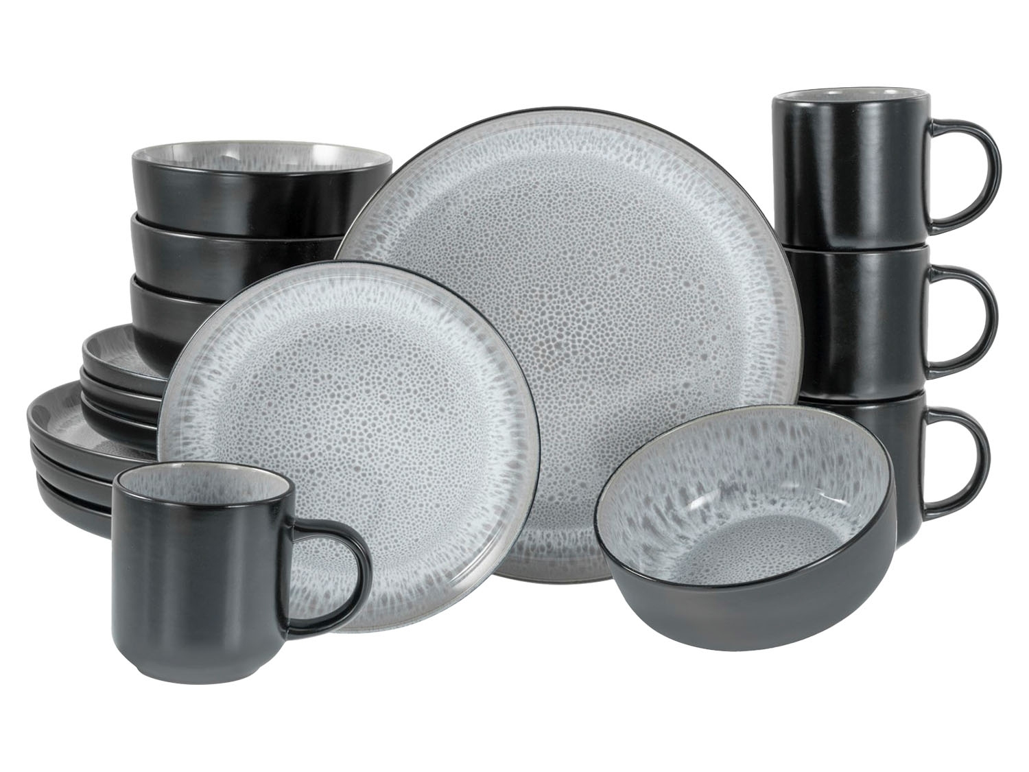- Kombiservice aus Steinzeug in grau und schwarz mit Reaktivglasur