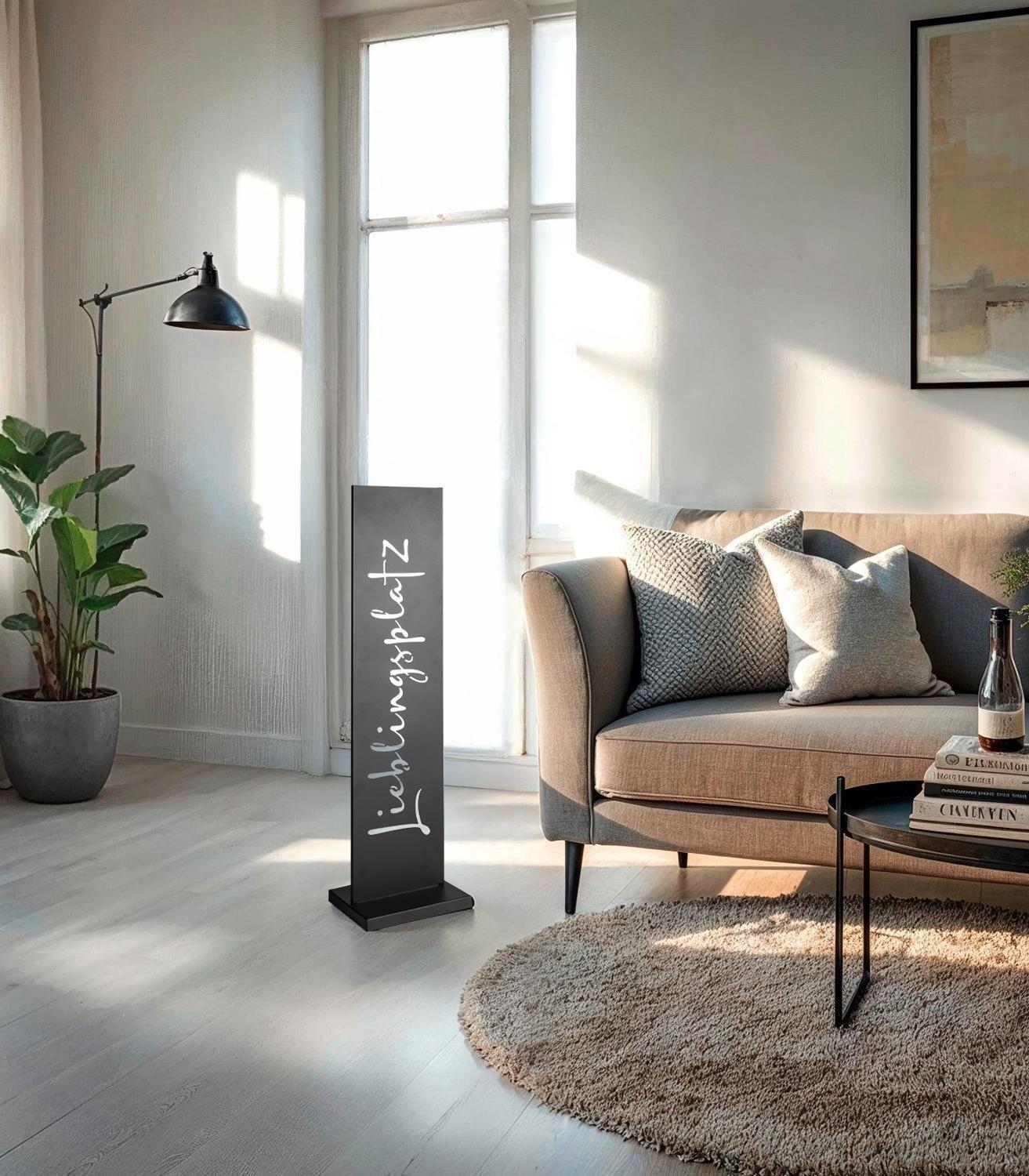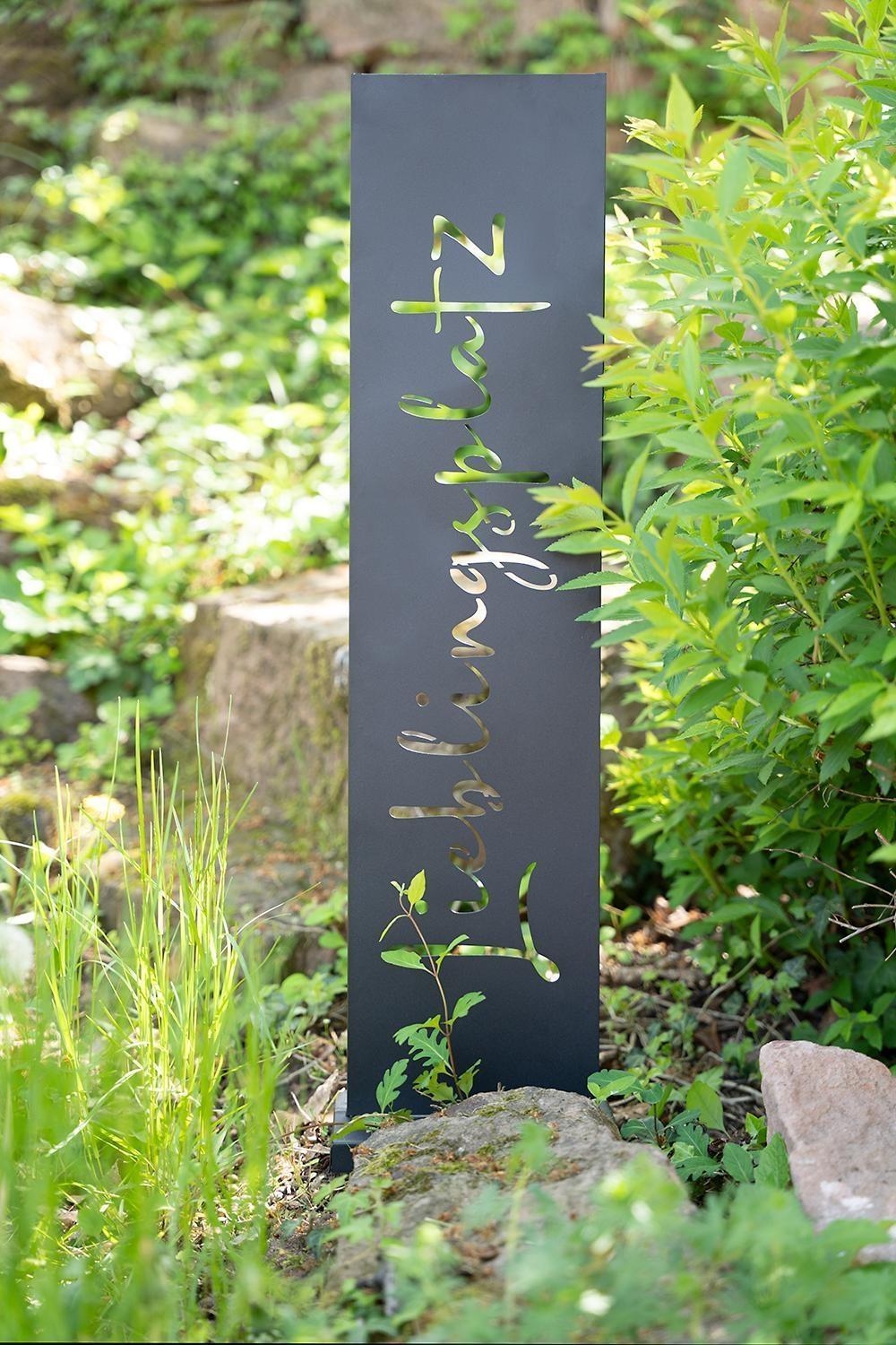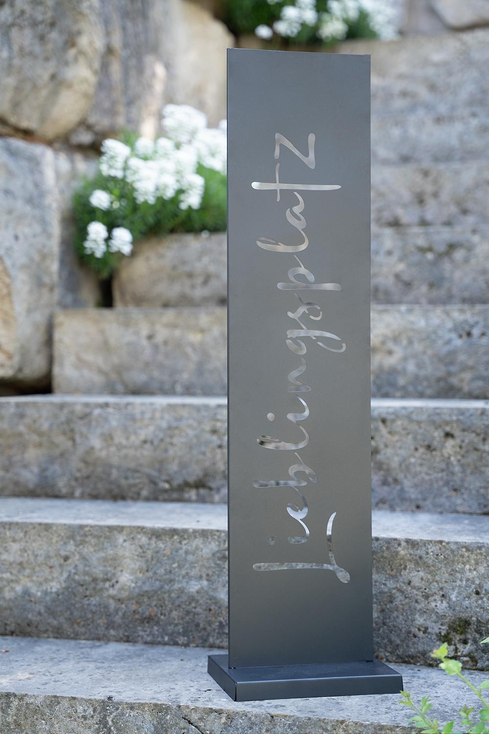 Der Deko-Aufsteller CARTELLO bringt mit seinem stilvollen „Lieblingsplatz“-Schriftzug Charme in Ihren Eingangsbereich. Gefertigt aus pulverbeschichtetem Metall in Schwarz, ist es wetterfest und für den Außenbereich geeignet. Mit einer Größe von 20 x 77 cm und sicherem Stand durch den 20 x 15 cm Sockel ist er eine robuste und einladende Dekoration für Ihr Zuhause.