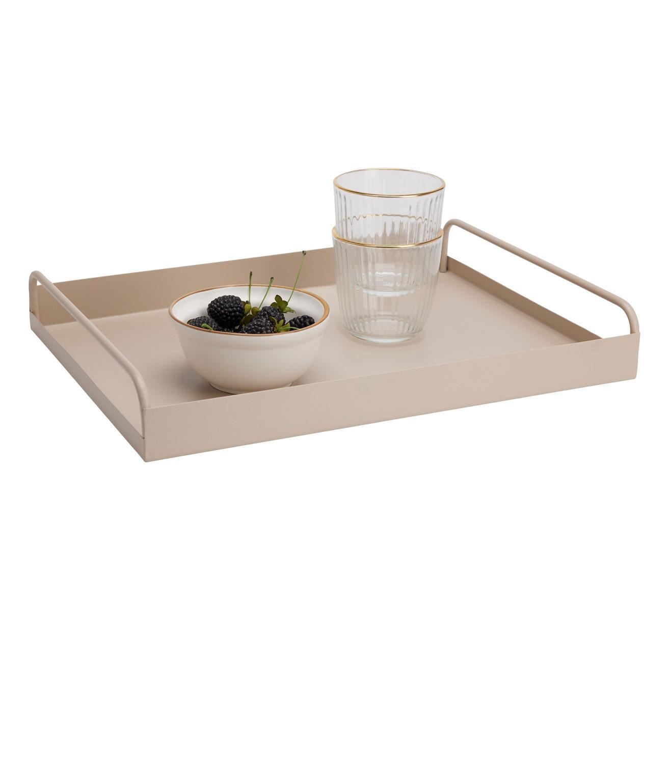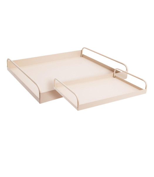 Das Deko-Tablett-Set HARIUS besteht aus zwei Tabletts aus Metall in Sandfarben. Die Tabletts sind in zwei unterschiedlichen Größen gefertigt und verfügen jeweils über seitliche Griffe, die den Transport erleichtern. Sie eignen sich ideal zum Arrangieren von Geschirr, Dekoration oder verschiedenen Accessoires und können vielseitig im Wohnbereich eingesetzt werden.