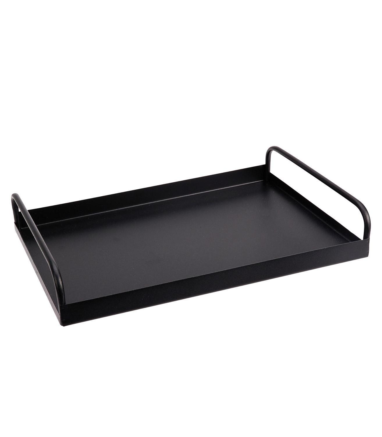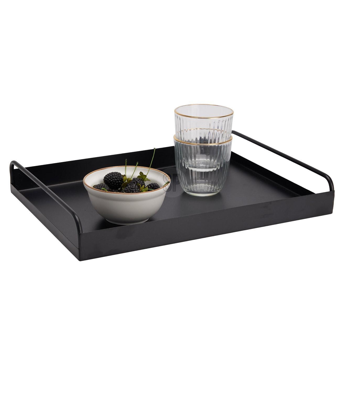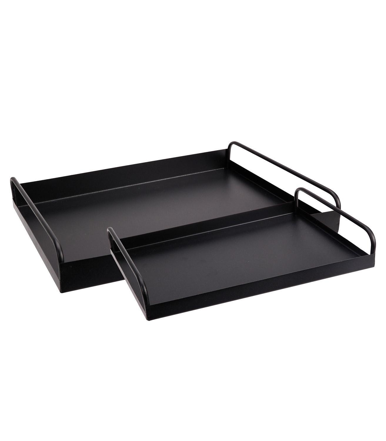 Das Deko-Tablett-Set HARIUS besteht aus zwei Tabletts aus Metall in Schwarz. Die Tabletts sind in zwei unterschiedlichen Größen gefertigt und verfügen jeweils über seitliche Griffe, die den Transport erleichtern. Sie eignen sich ideal zum Arrangieren von Geschirr, Dekoration oder verschiedenen Accessoires und können vielseitig im Wohnbereich eingesetzt werden.