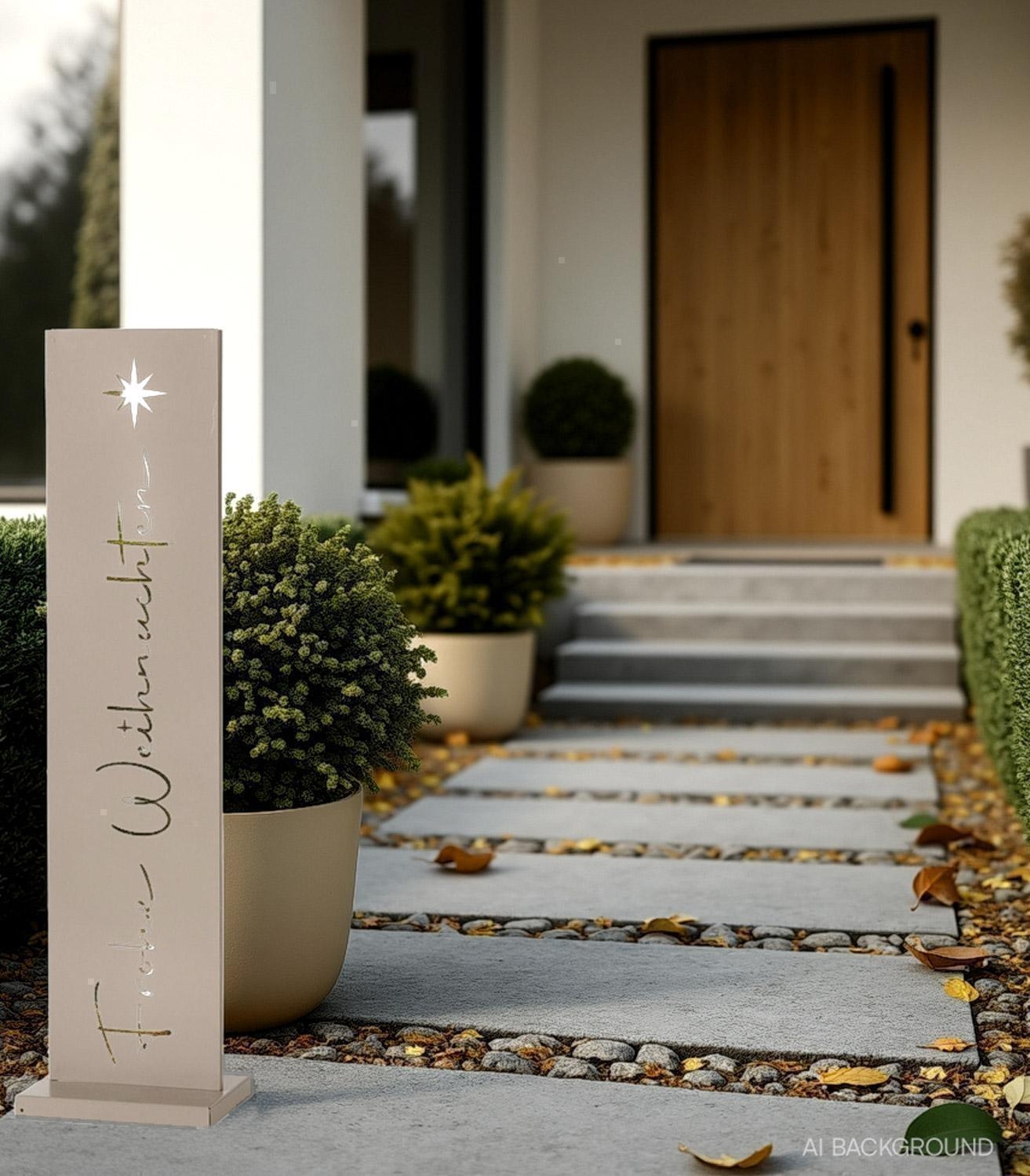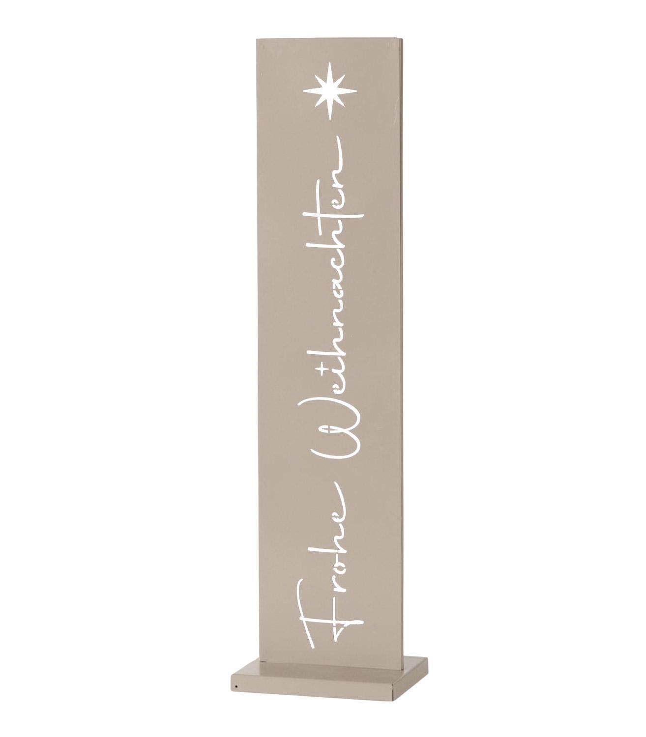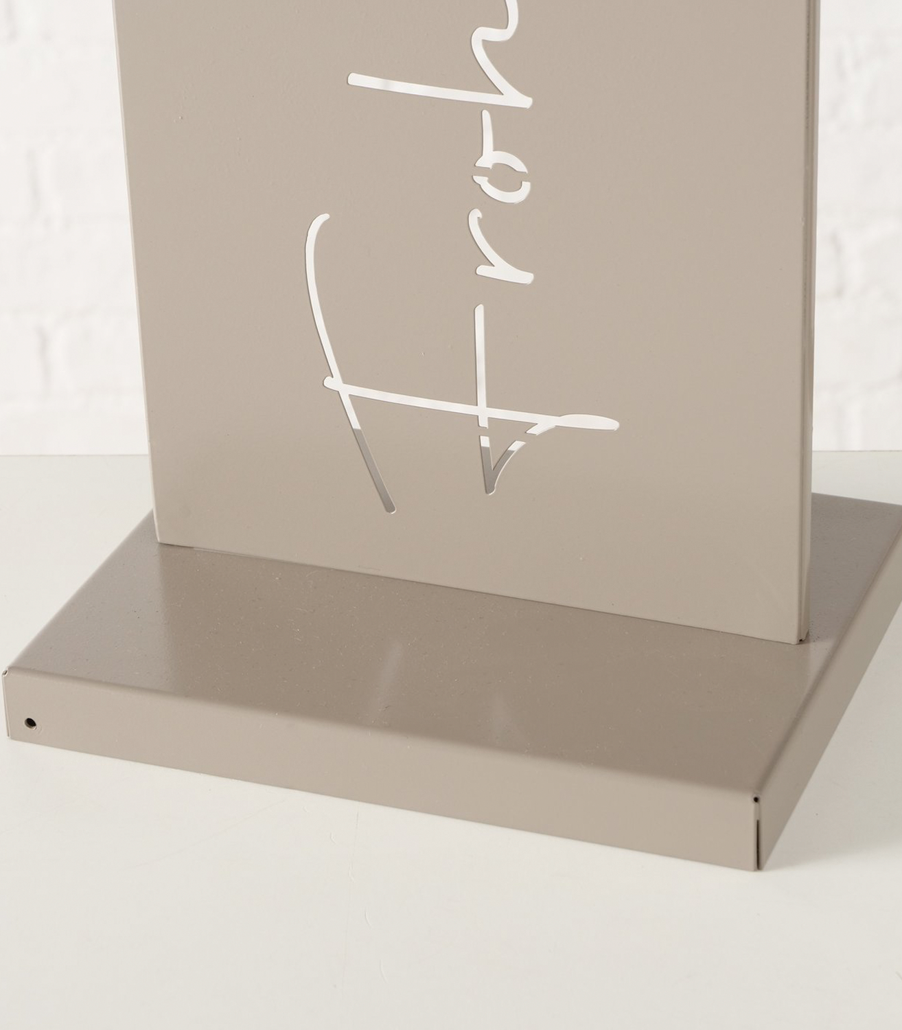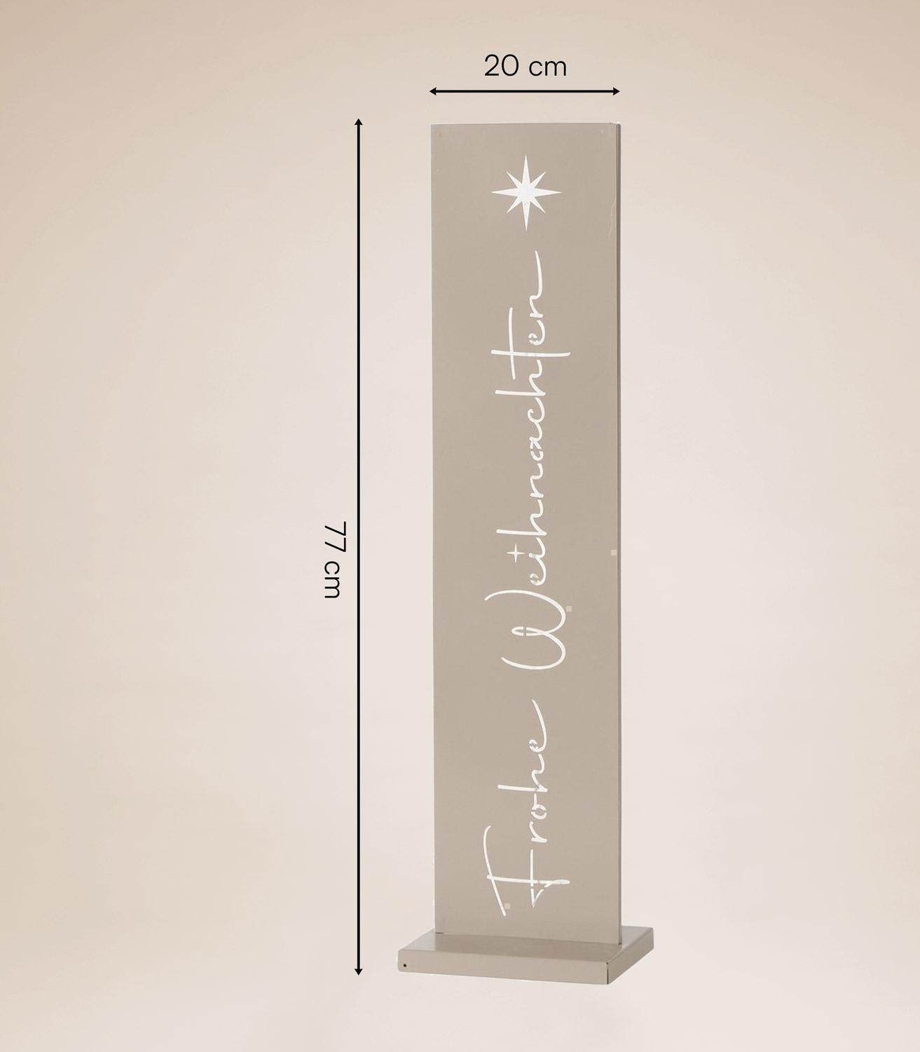 Der Dekoaufsteller WALDAN in elegantem Beige ist ein stilvoller Blickfang für die Weihnachtszeit. Mit einer Höhe von 77 cm und gefertigt aus robustem Metall überzeugt er durch seine hochwertige Verarbeitung. Der Schriftzug „Frohe Weihnachten“ ist kunstvoll in das Metall ausgestanzt und sorgt für einen festlichen Akzent. Ob im Eingangsbereich, Wohnzimmer oder auf der Terrasse – dieser Aufsteller bringt weihnachtliche Stimmung in jeden Raum.