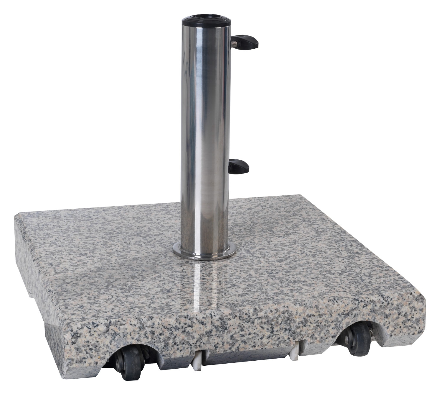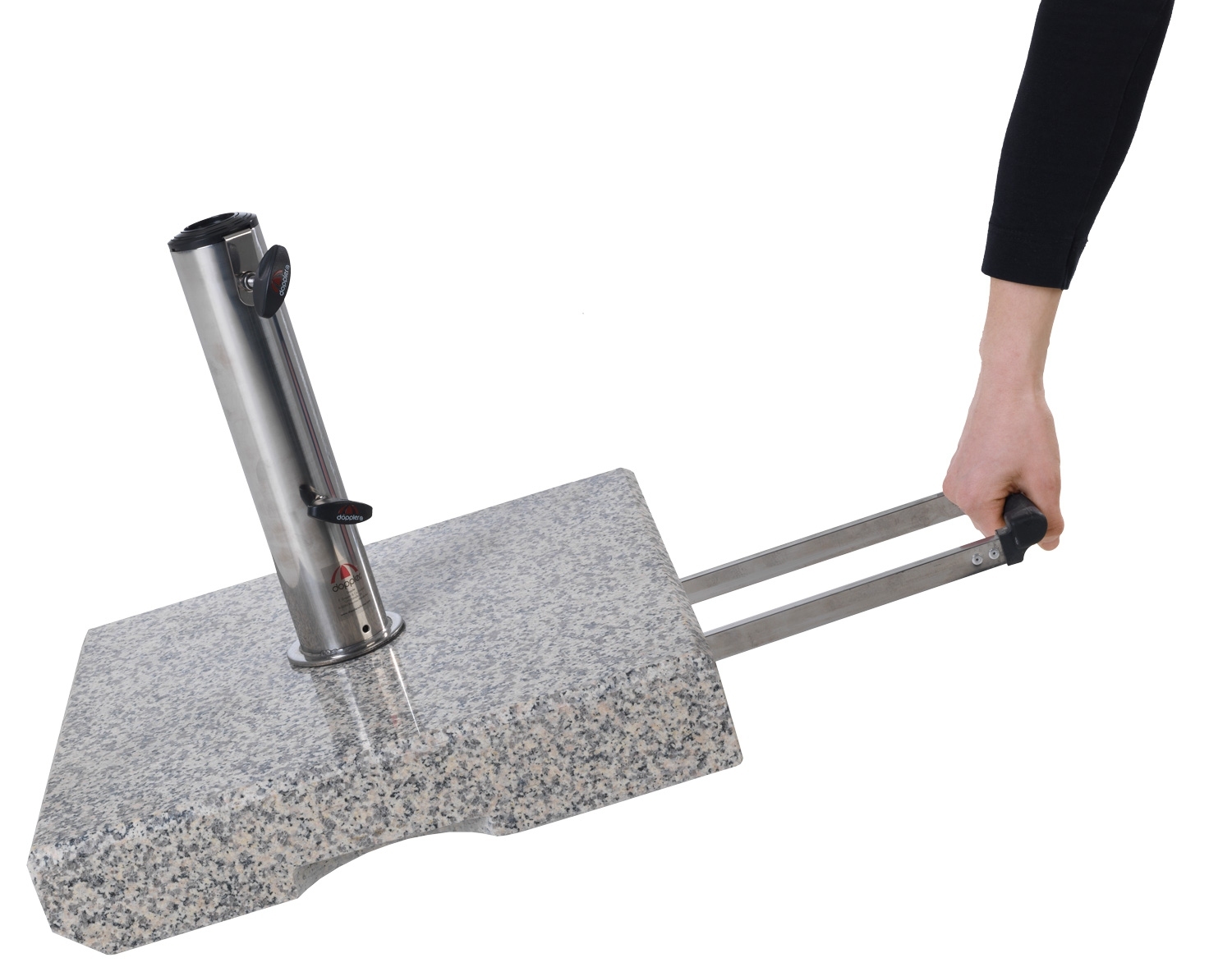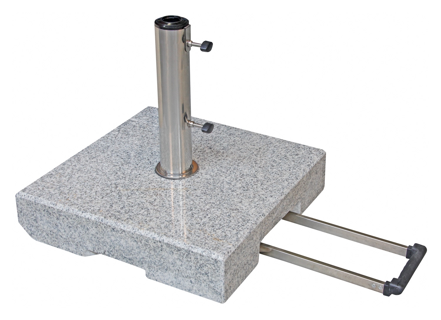 Der Schirmständer aus poliertem Granit in hellgrau und einem Aufsatzrohr aus rostfreiem Edelstahl verfügt über 2 Feststellschrauben und einen ausziehbaren Trolley-Griff. Granit ist von Natur aus sehr wetterbeständig und kann deswegen ganzjährig draußen gelagert werden. Im Aufsatzrohr befinden sich 5 Reduzierringe in verschiedenen Größen. Mit diesen Reduzierringen passt selbst ein kleinerer Sonnenschirm ideal in einen größeren Schirmständer. Sie stapeln die Reduziereinsätze einfach ineinander, bis Ihr Sonnenschirmständer perfekten Halt hat. Für eine einfache Handhabung des Schirmständers sind 2 Rollen aus Kunststoff angebracht, so können Sie den Schirmständer einfach und rückenschonend fortbewegen. Der Schirmständer hat ein Gewicht von 40 kg.