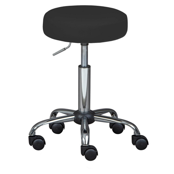 Der Drehhocker ARNO ist mit einem schwarzen Kunstlederbezug ausgestattet und verfügt über ein Gestell aus Metall in Chromfarben. Die Sitzhöhe kann mithilfe eines Gaslifts stufenlos von 52 cm bis 66 cm verstellt werden. Der Hocker ist mit fünf gebremsten Sicherheitsrollen versehen, die für einen sicheren Stand und flexible Beweglichkeit sorgen. Der Sitz hat einen Durchmesser von 35 cm und die Gesamthöhe beträgt 52 cm.