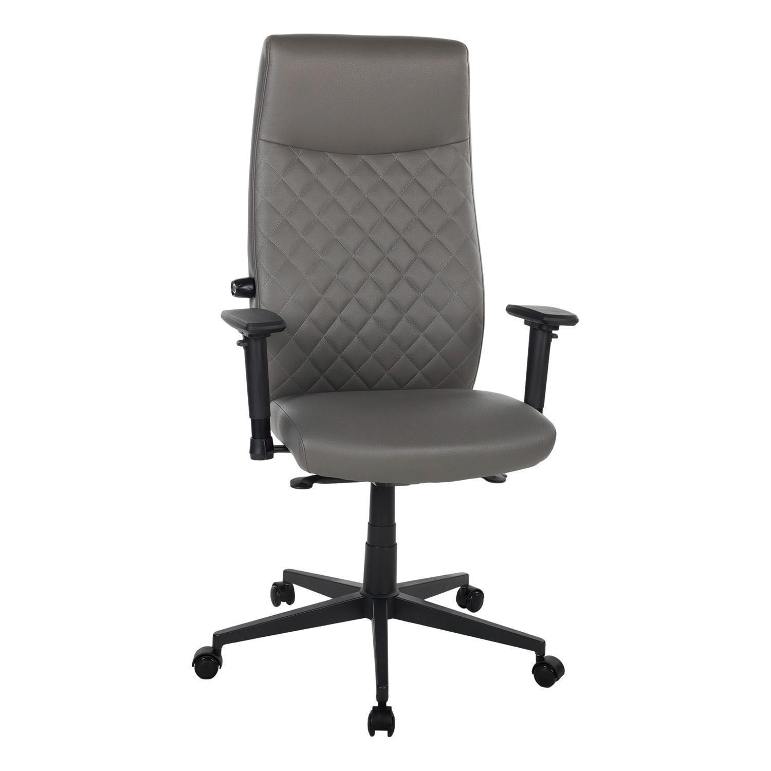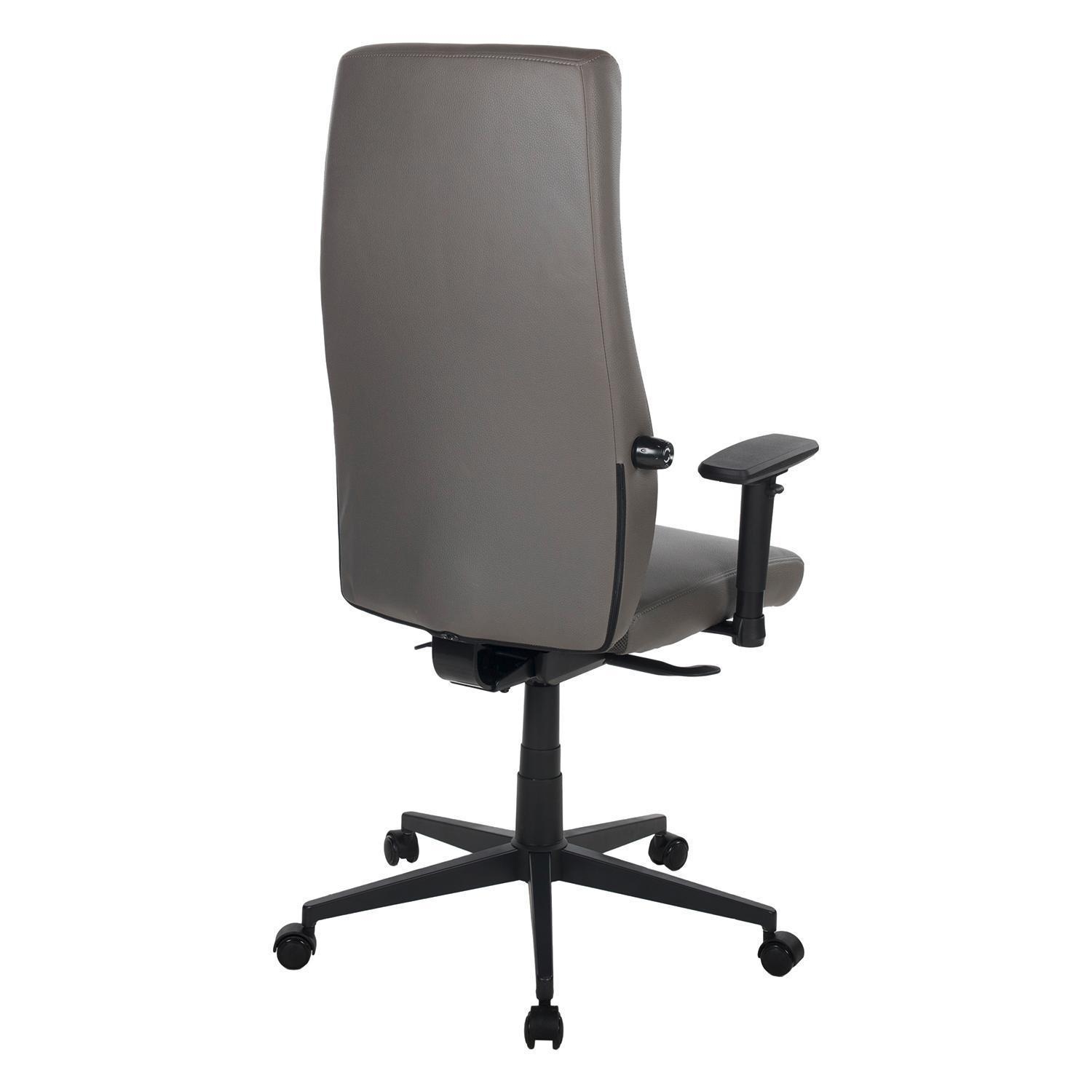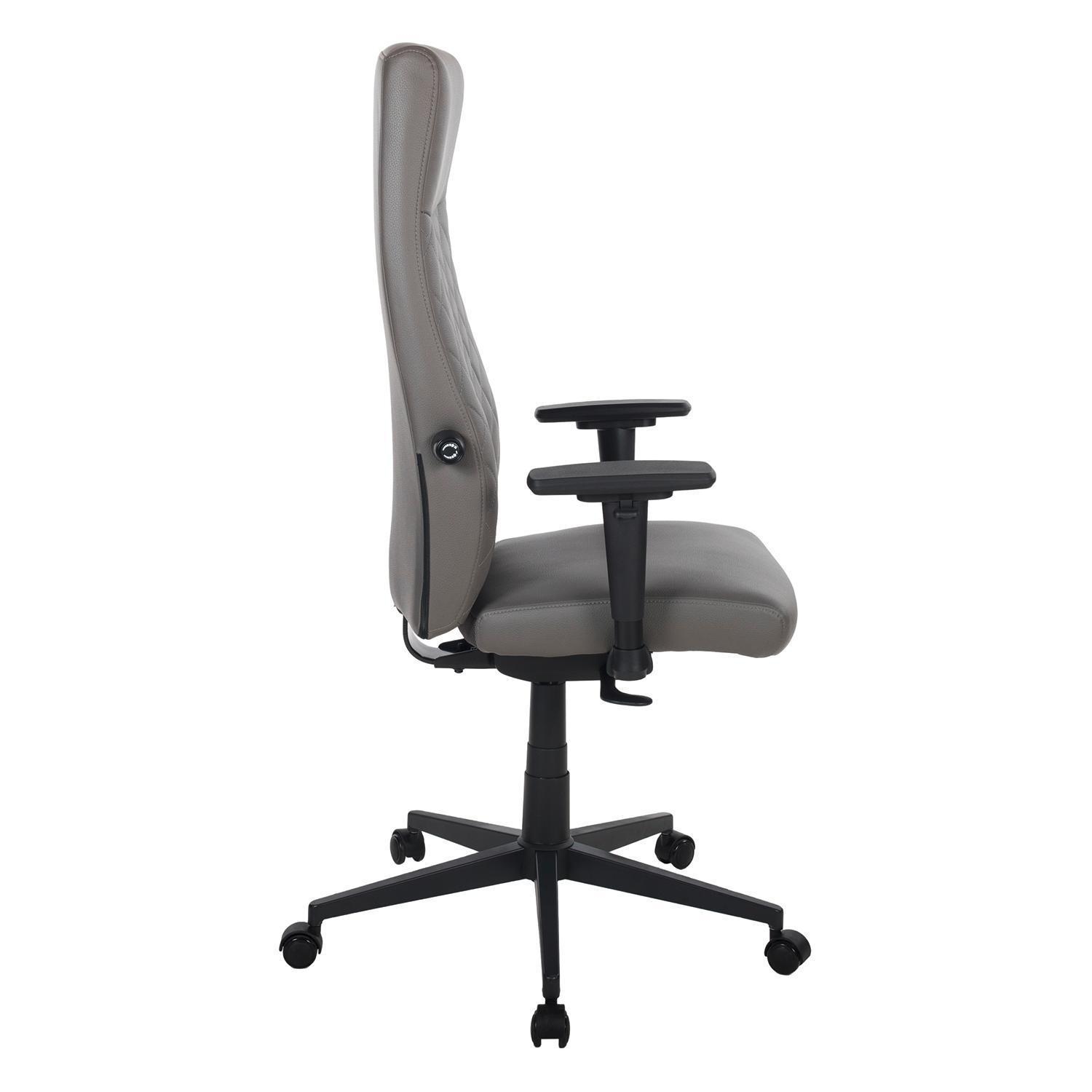 Der Drehstuhl ZUTERA ist mit einem dunkelgrauen Mikrofaserbezug in Lederoptik ausgestattet. Das Gestell ist aus schwarzem Metall gefertigt. Die verstellbaren 3-D-Armlehnen lassen sich nur in der Höhe anpassen. Die Sitzhöhe kann mithilfe einer Sicherheitsgasdruckfeder verstellt werden.