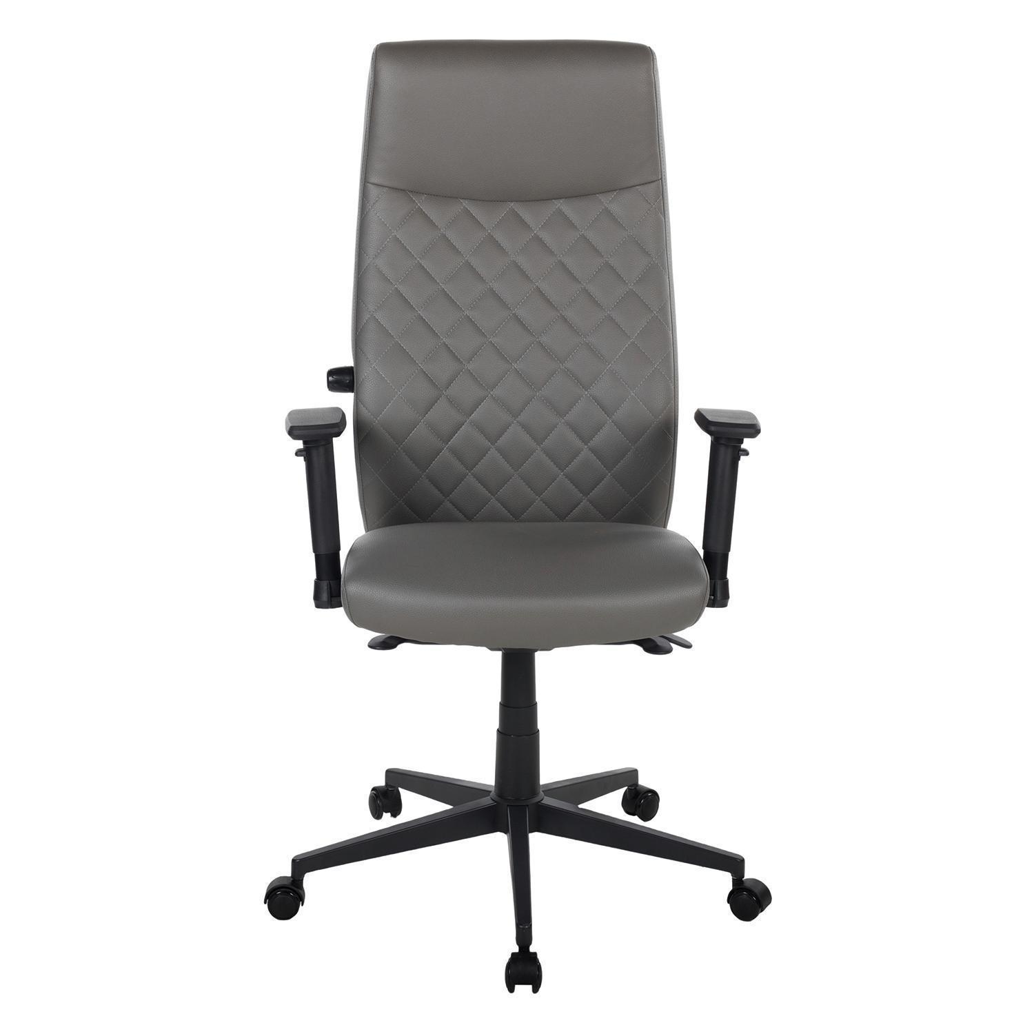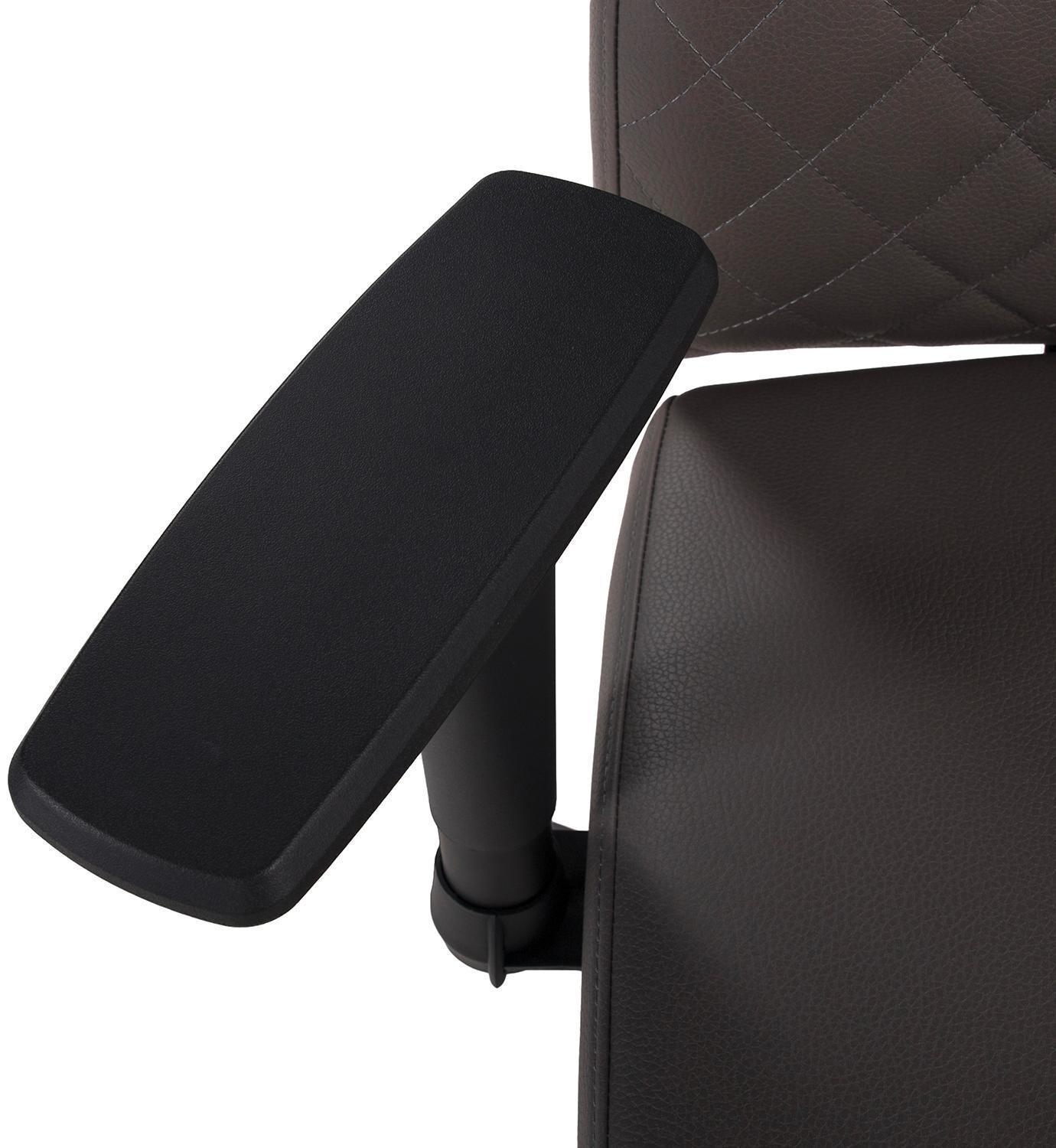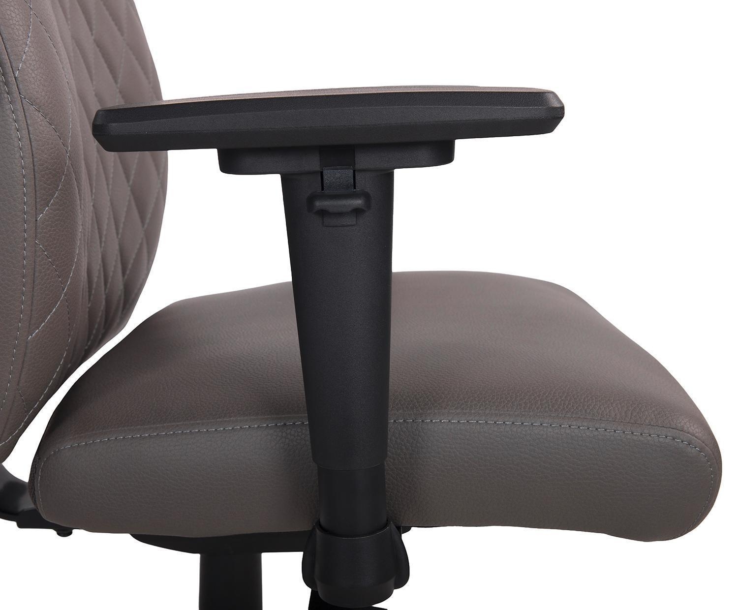 Der Drehstuhl ZUTERA ist mit einem dunkelgrauen Mikrofaserbezug in Lederoptik ausgestattet. Das Gestell ist aus schwarzem Metall gefertigt. Die verstellbaren 3-D-Armlehnen lassen sich nur in der Höhe anpassen. Die Sitzhöhe kann mithilfe einer Sicherheitsgasdruckfeder verstellt werden.