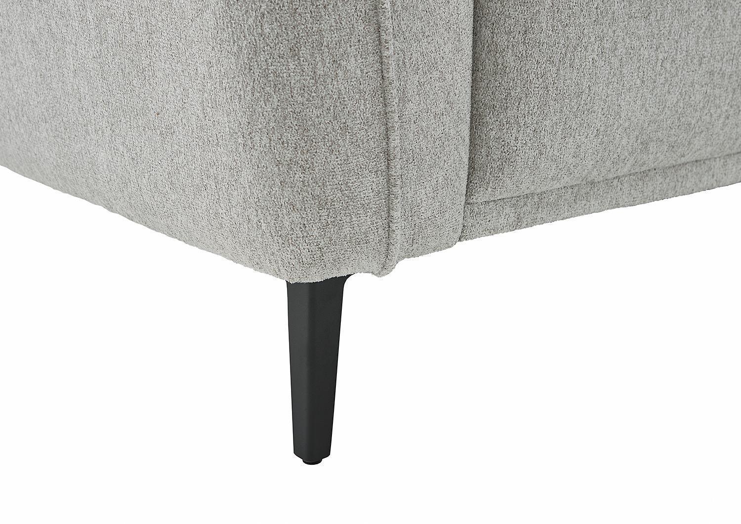 Das Ecksofa CONERO ist mit einem Stoffbezug in Hellgrau ausgestattet und verfügt über eine Kaltschaumpolsterung in Kombination mit einer Nosagunterfederung. Die Füße bestehen aus Metall in schwarzer Ausführung. Zum Lieferumfang gehören zwei Zierkissen. Die Ottomane kann nur rechtsseitig montiert werden und ermöglicht eine flexible Raumgestaltung. Das Sofa hat eine Breite von 288 cm, eine Höhe von 85 cm und eine Tiefe von 178 cm. Die Sitzhöhe beträgt 46 cm.