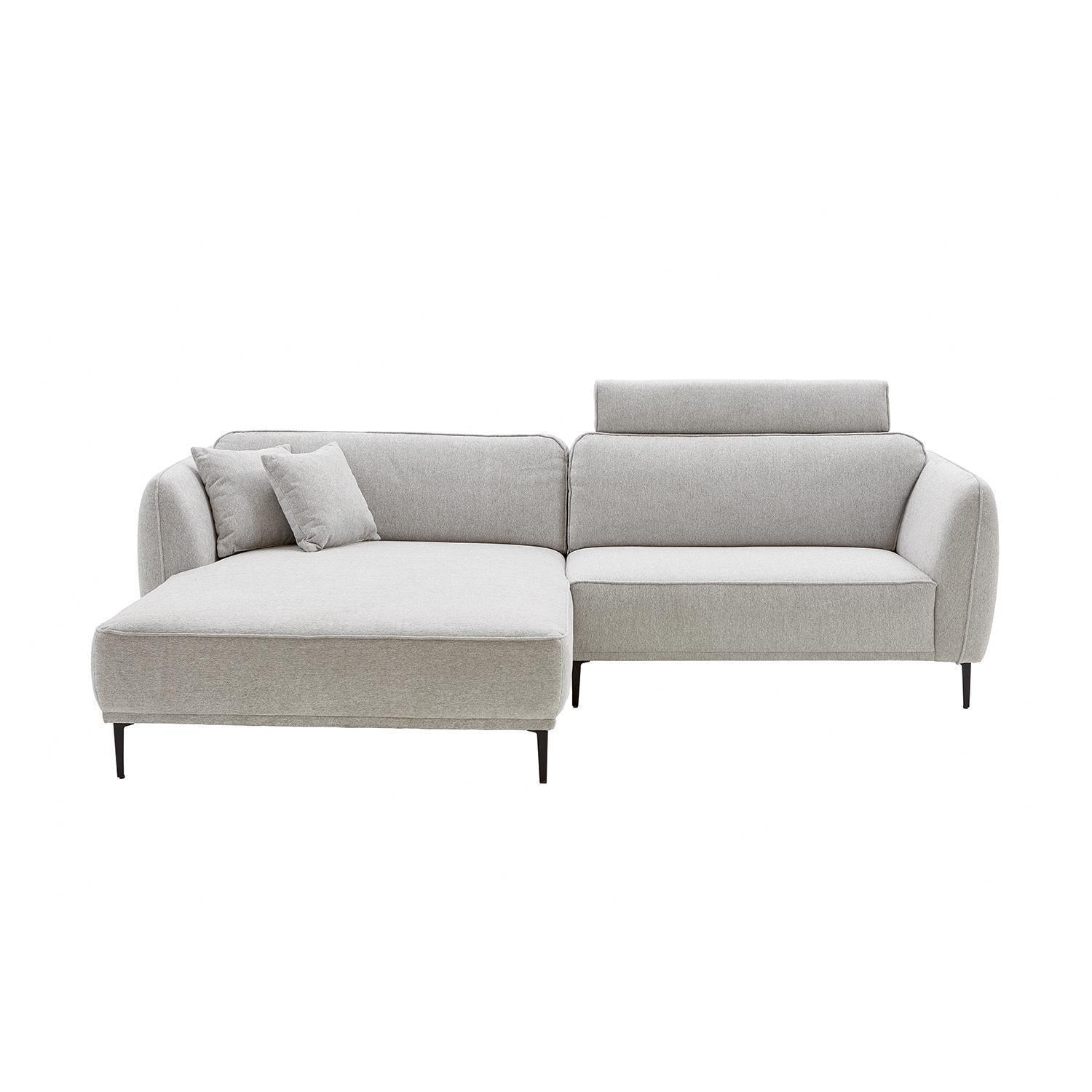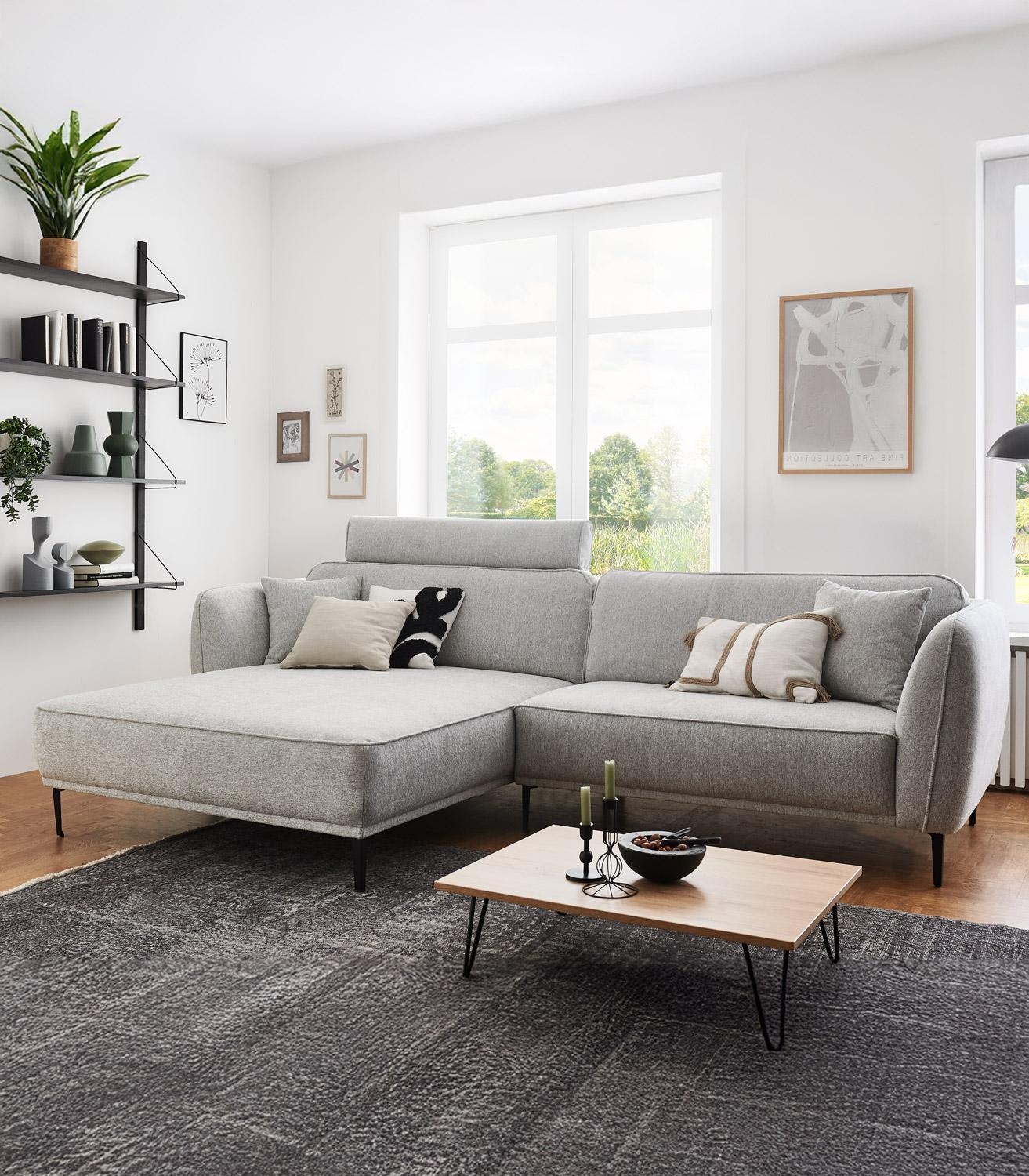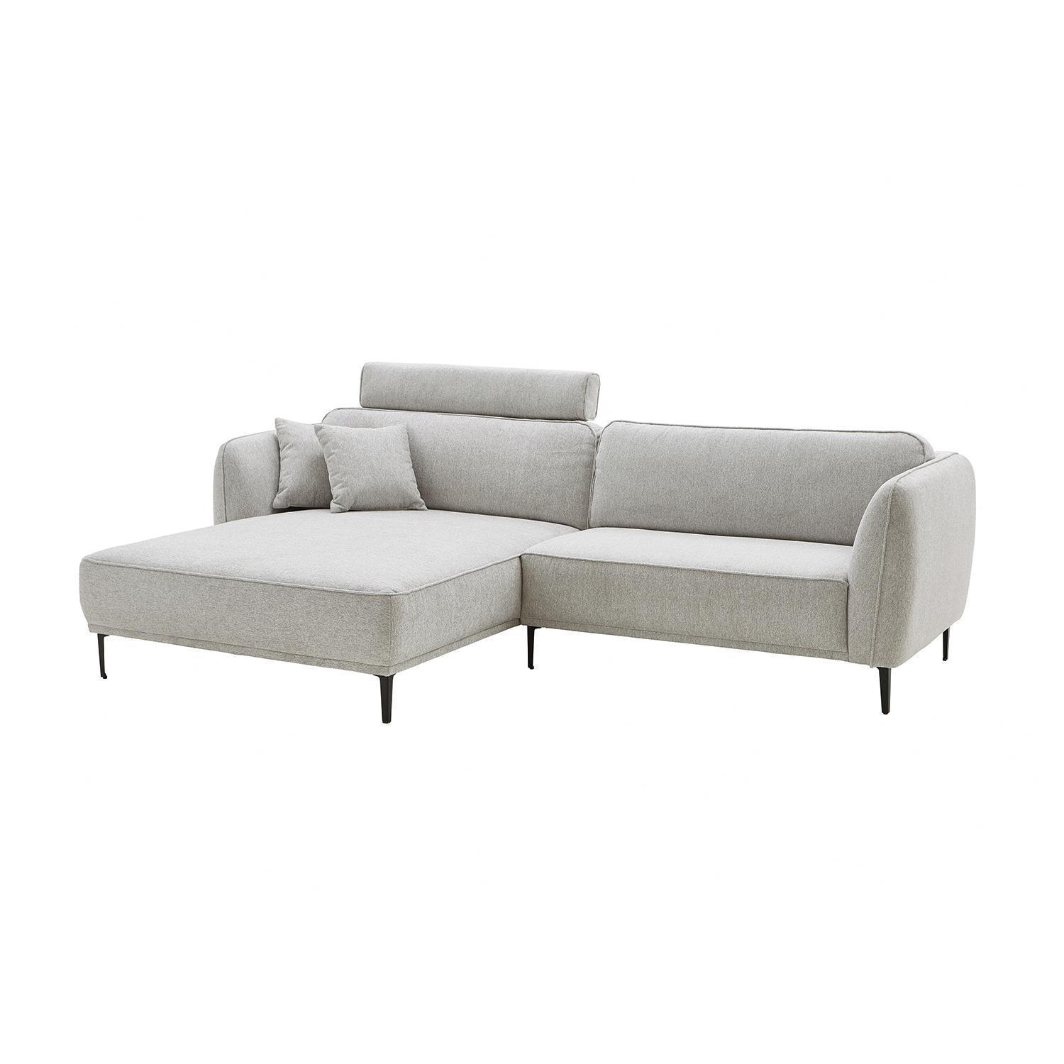 Das Ecksofa CONERO ist mit einem Stoffbezug in Hellgrau ausgestattet und verfügt über eine Kaltschaumpolsterung in Kombination mit einer Nosagunterfederung. Die Füße bestehen aus Metall in schwarzer Ausführung. Zum Lieferumfang gehören zwei Zierkissen und eine Kopfstütze. Die Ottomane kann nur linksseitig montiert werden und ermöglicht eine flexible Raumgestaltung. Das Sofa hat eine Breite von 288 cm, eine Höhe von 85 cm und eine Tiefe von 178 cm. Die Sitzhöhe beträgt 46 cm.