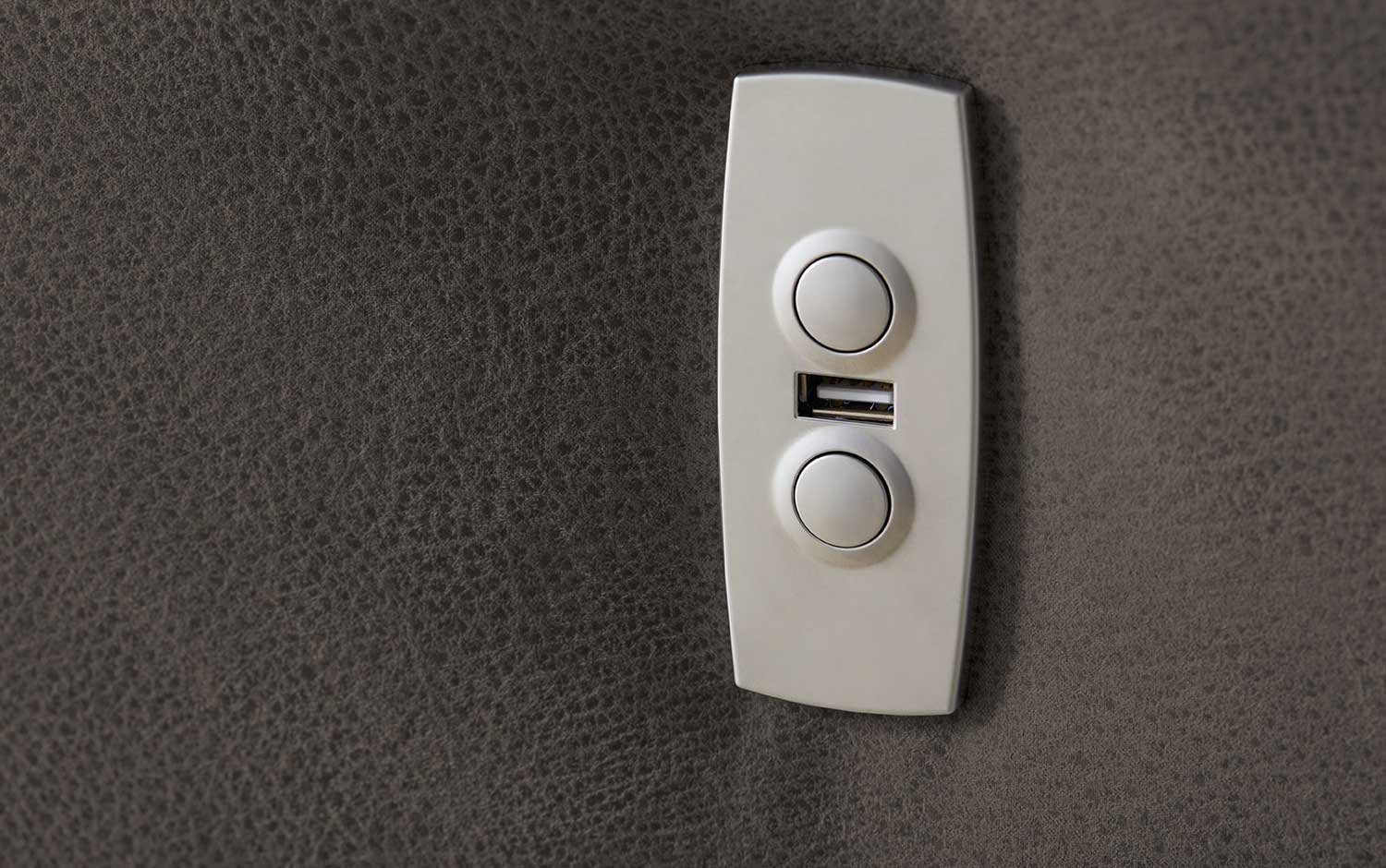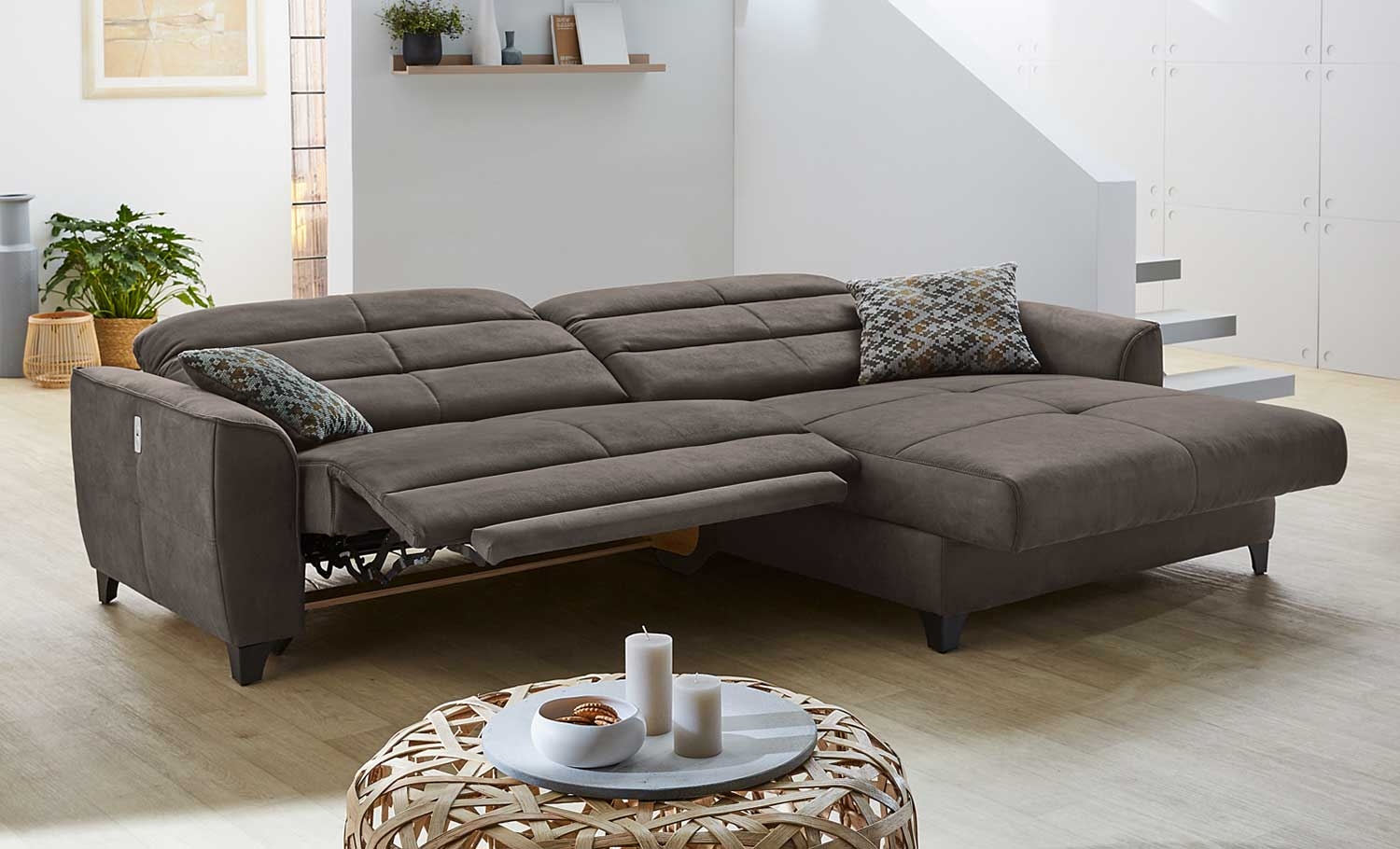 Elektrische Relaxliegefunktion: Per Knopfdruck lässt sich die Sitzfläche in der Ottomane und im Sofateil getrennt voneinander automatisch nach vorne und hinten verstellen. Im Sofateil wird dabei die Fußstütze mit ausgefahren. Bei der Ottomane wird die Liegefläche weiter nach vorne geschoben.