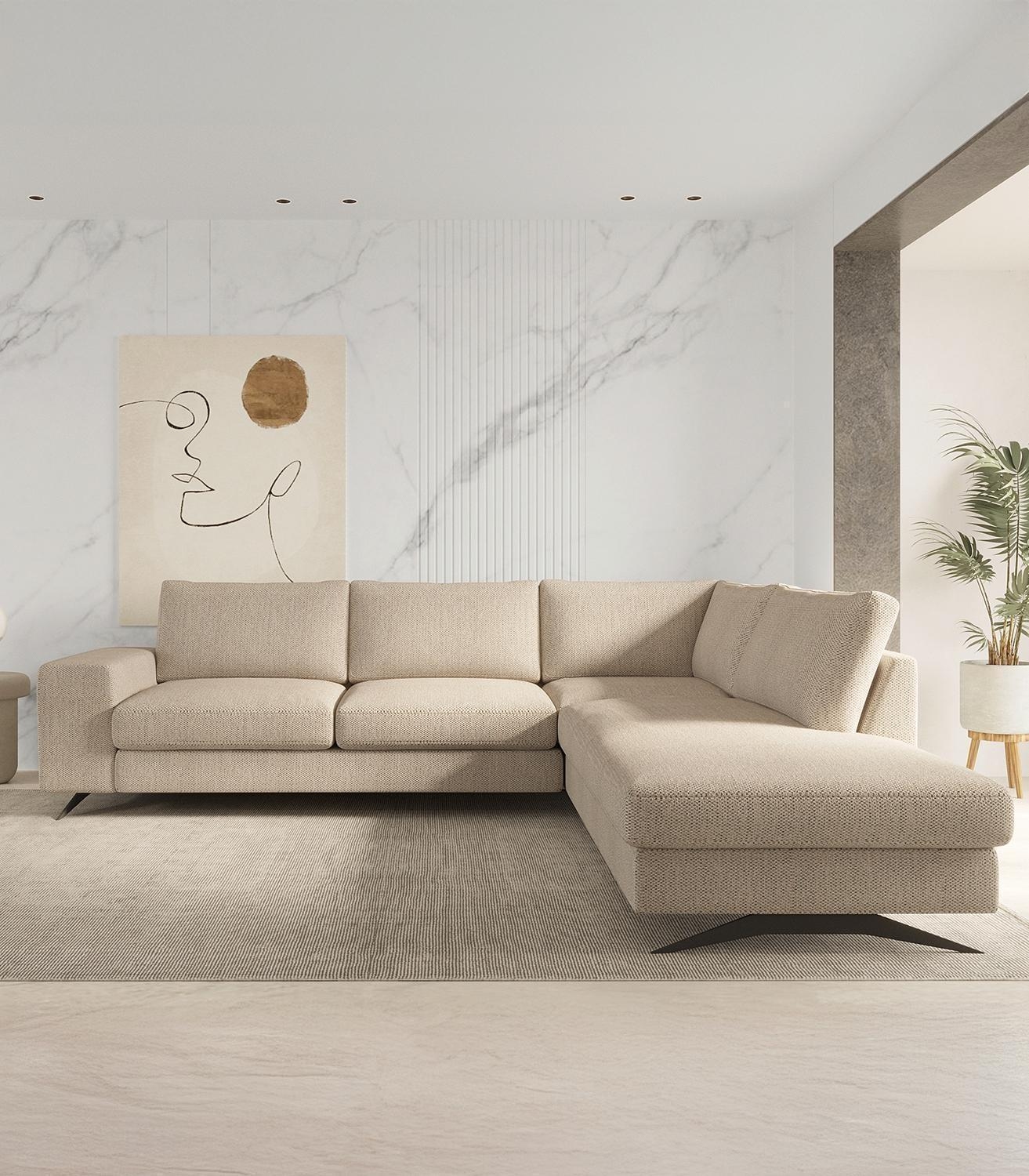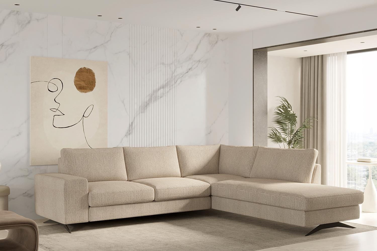 Das Ecksofa HELGA ist mit einem cremefarbenen Webstoff bezogen und hat eine Größe von 285 x 222 cm. Die Polsterung besteht aus Schaumstoff und wird durch eine Wellenunterfederung ergänzt. Fünf Rückenkissen sind im Lieferumfang enthalten. Schwarze Metallfüße sorgen für einen festen Stand und die Ottomane lässt sich nur rechtsseitig montieren.