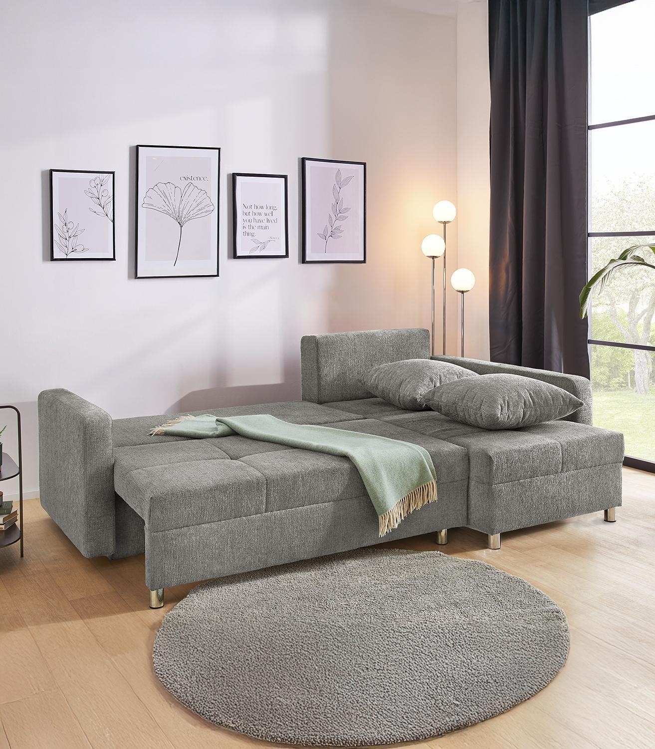 Das Ecksofa KAMI ist mit einem Chenillebezug in Grau ausgestattet. Eine zentrale Funktion des Sofas ist die integrierte Ausziehfunktion, die bei Bedarf eine Liegefläche von 137 x 202 cm bietet. Darüber hinaus verfügt das Modell über einen integrierten Bettkasten, der zusätzlichen Stauraum schafft. Die Ottomane ist flexibel konzipiert und kann beidseitig montiert werden. Im Lieferumfang sind vier Rückenkissen sowie ein Zierkissen enthalten. Das Ecksofa weist eine Breite von 228 cm, eine Höhe von 88 cm und eine Tiefe von 154 cm auf.