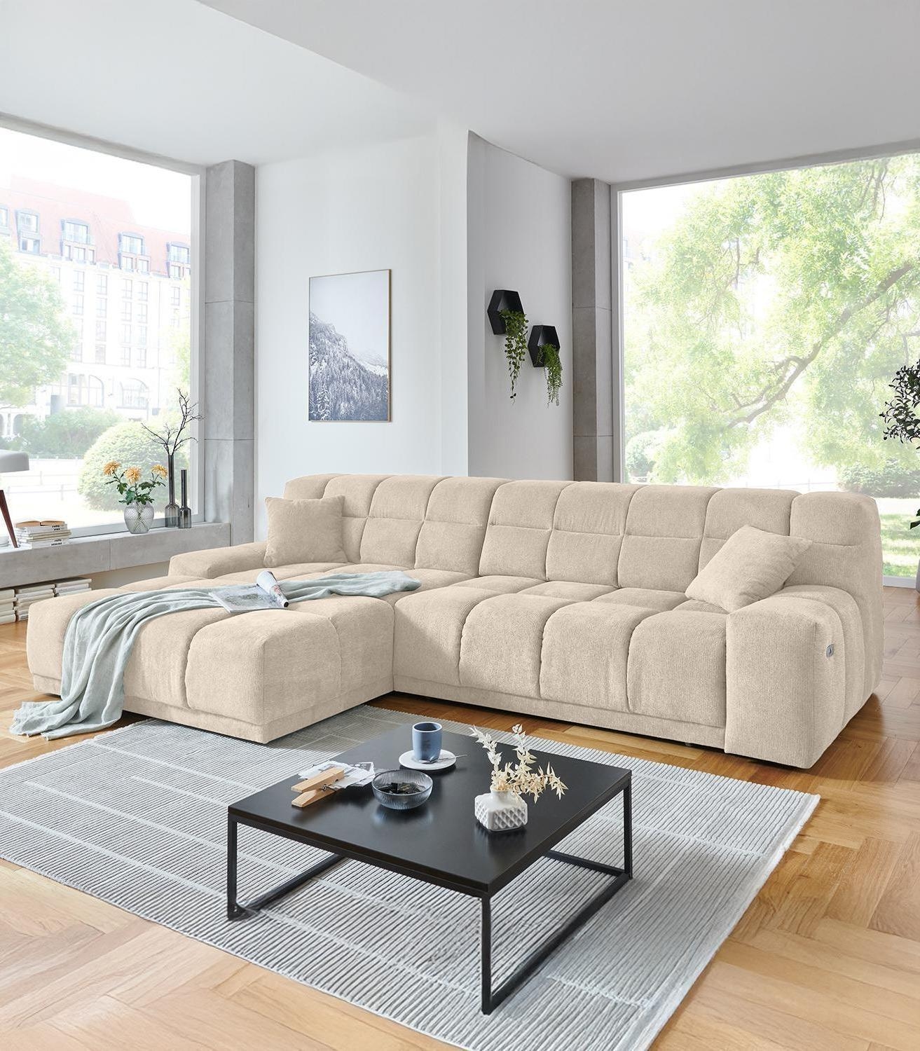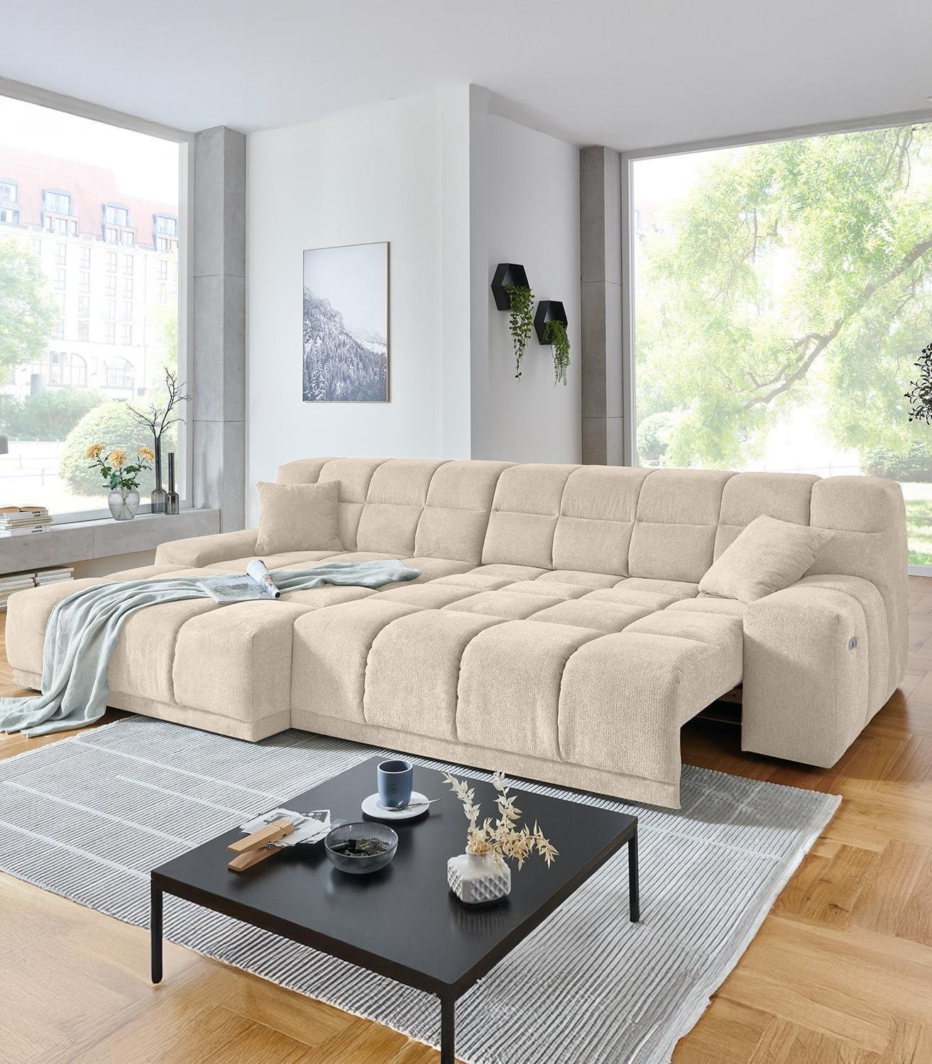 | Lieferumfang: | 1 Ecksofa mit linksseitig montierbarer Ottomane, elektrischer Sitztiefenverstellung und 2 Zierkissen |