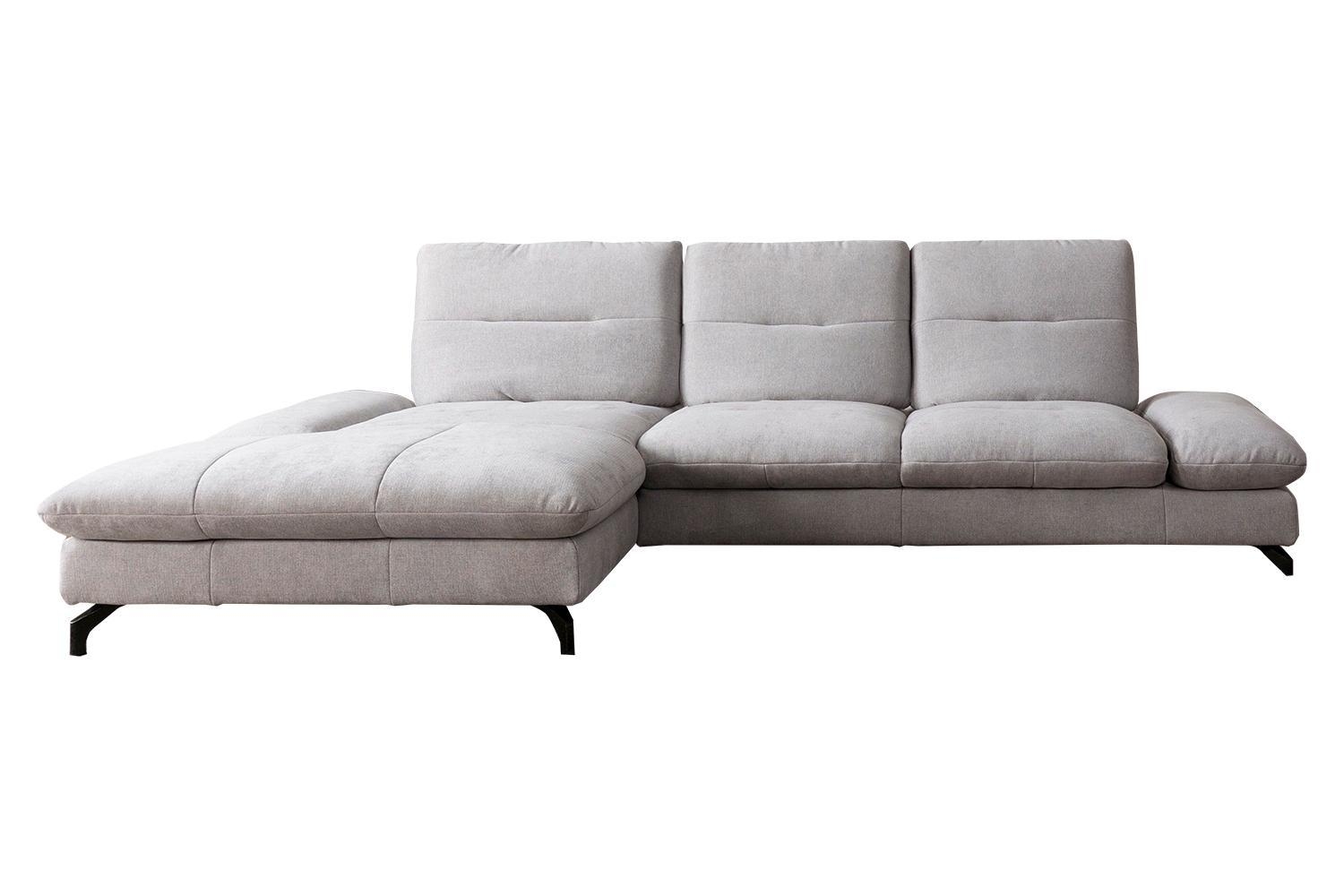 Das Ecksofa POLITO ist mit einem Stoffbezug in Silbergrau ausgestattet und verfügt über eine Sitzfläche mit PUR-Schaumstoff auf Wellenunterfederung. Die Rückenlehne ist ebenfalls mit PUR-Schaumstoff versehen und auf einer Gummigurtung gearbeitet. Zudem besitzt das Sofa drei verstellbare Schwenkrücken, während verstellbare Armlehnen nicht enthalten sind. Die Ottomane lässt sich ausschließlich linksseitig montieren. Ergänzt wird die Konstruktion durch Stellfüße aus Metall in Schwarz. Die Maße betragen 284 cm in der Breite, 90 cm in der Höhe und 176 cm in der Tiefe. Die Sitzhöhe liegt bei 48 cm.