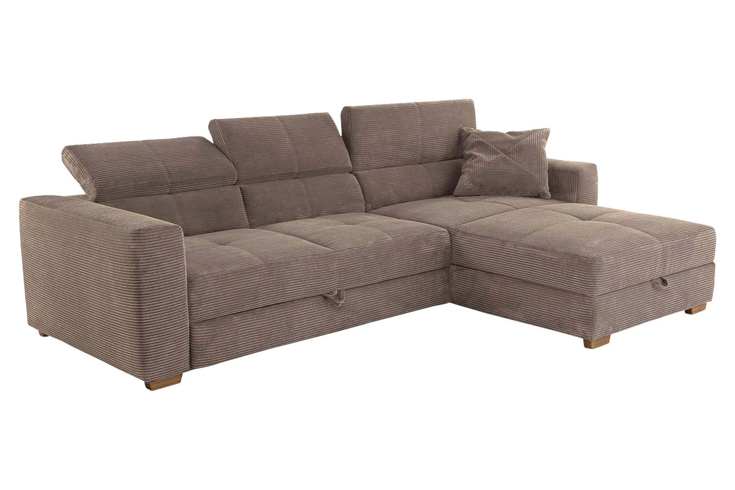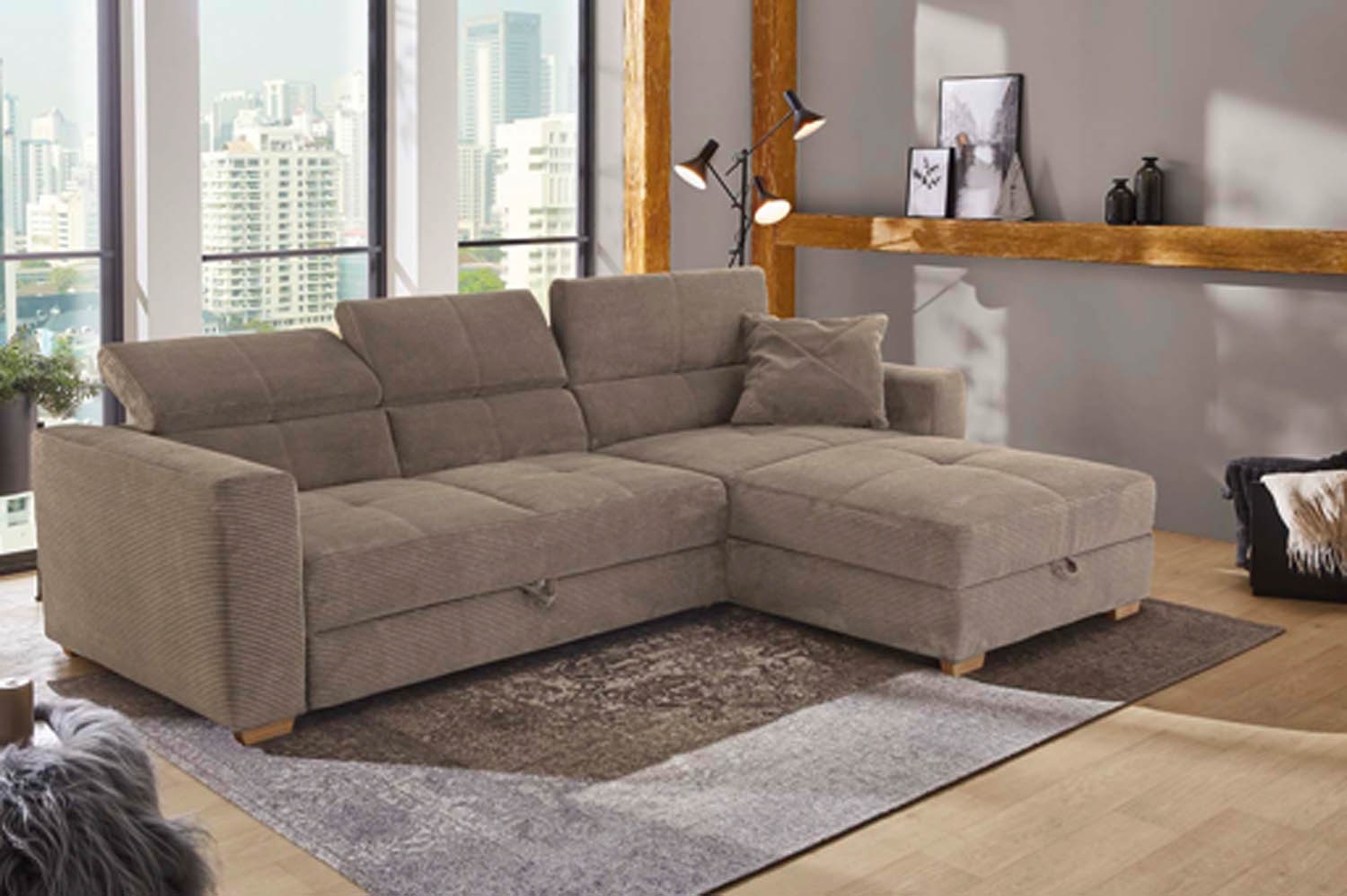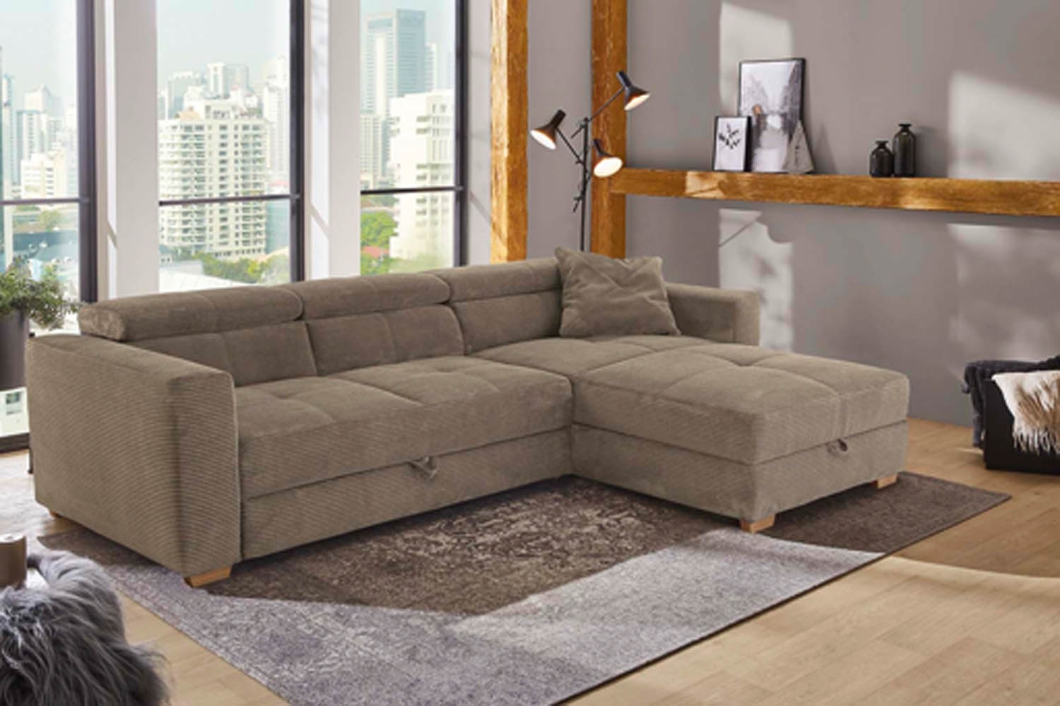 Das ausziehbare Ecksofa in Taupe überzeugt nicht nur durch seine moderne Optik, sondern auch durch vielseitige Funktionen. Der Lieferumfang umfasst 1 Sofa mit ausziehbarer Bettfunktion, einem Bettkasten, beidseitig montierbarer Ottomane, 3 verstellbaren Kopfstützen und 1 Zierkissen. Die großzügige Liegefläche von 134 x 251 cm bietet ausreichend Platz für entspannte Momente. Der Cord-Bezug verleiht dem Sofa eine angenehme Haptik. Mit der Möglichkeit zur Auszieh- und Bettfunktion sowie der Bettkastenfunktion wird das Sofa zur idealen Lösung für Gäste. Die verstellbaren Kopfstützen ermöglichen eine individuelle Anpassung und tragen zum Komfort bei.