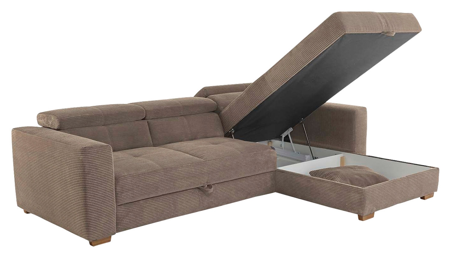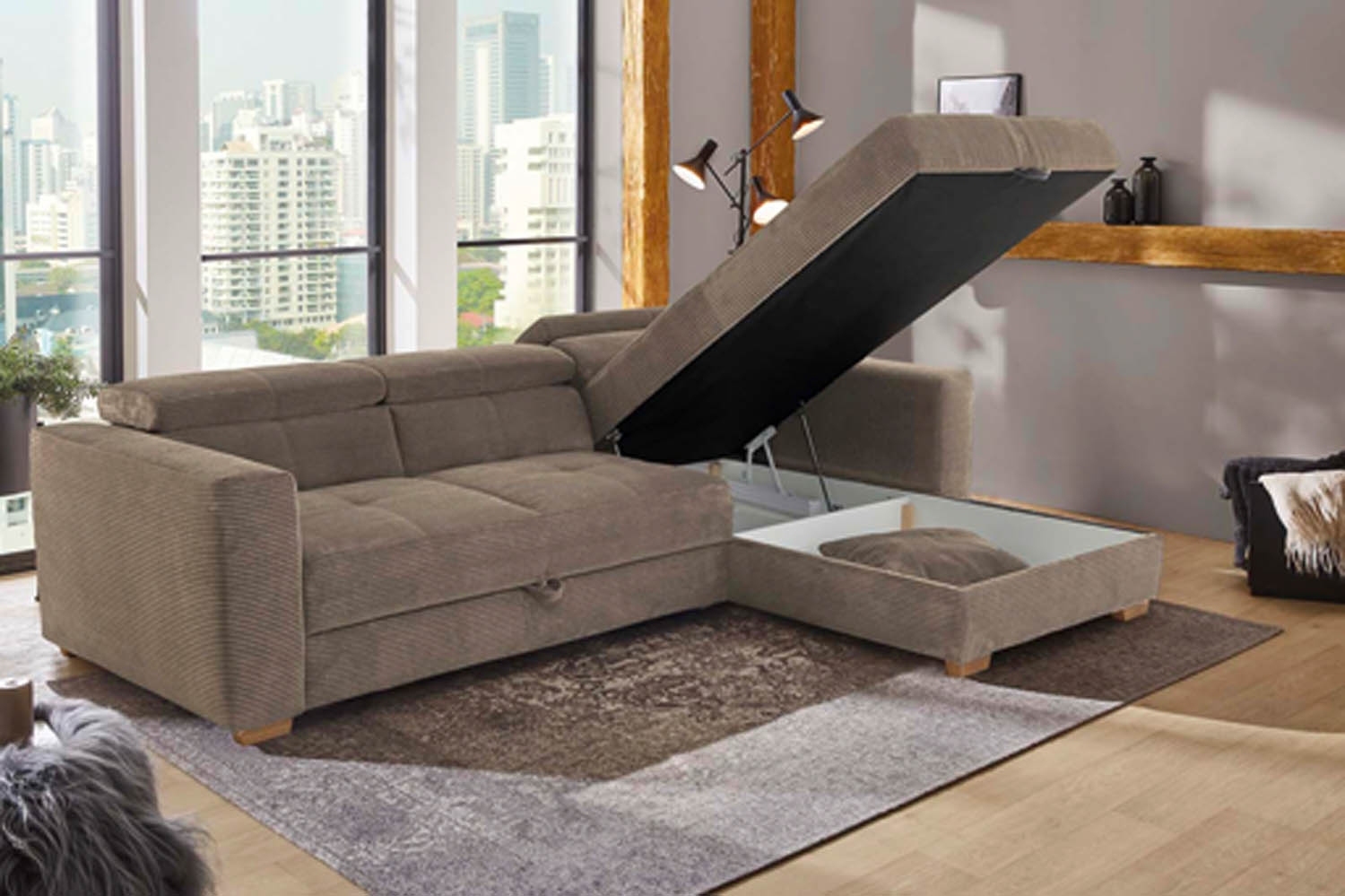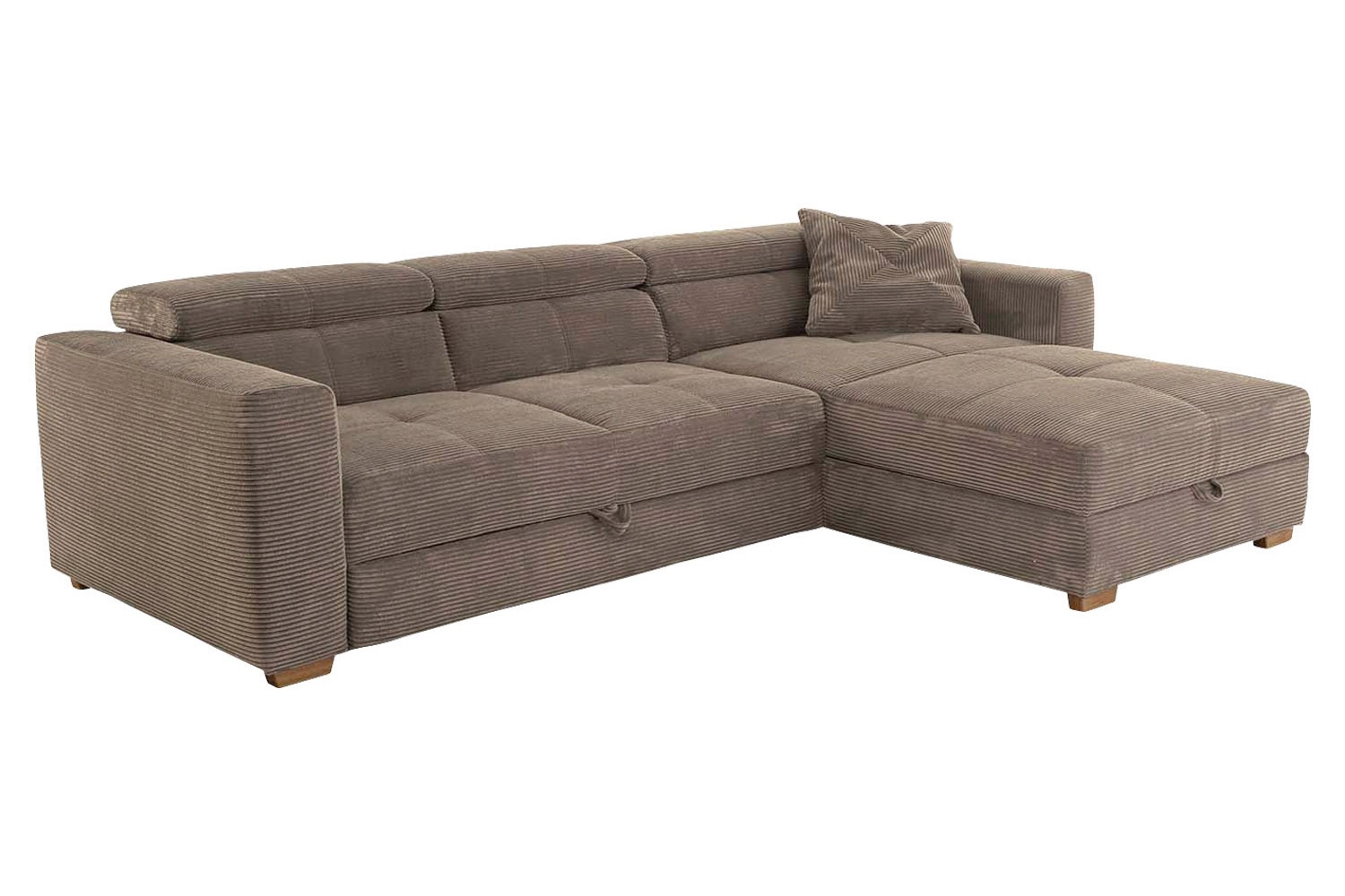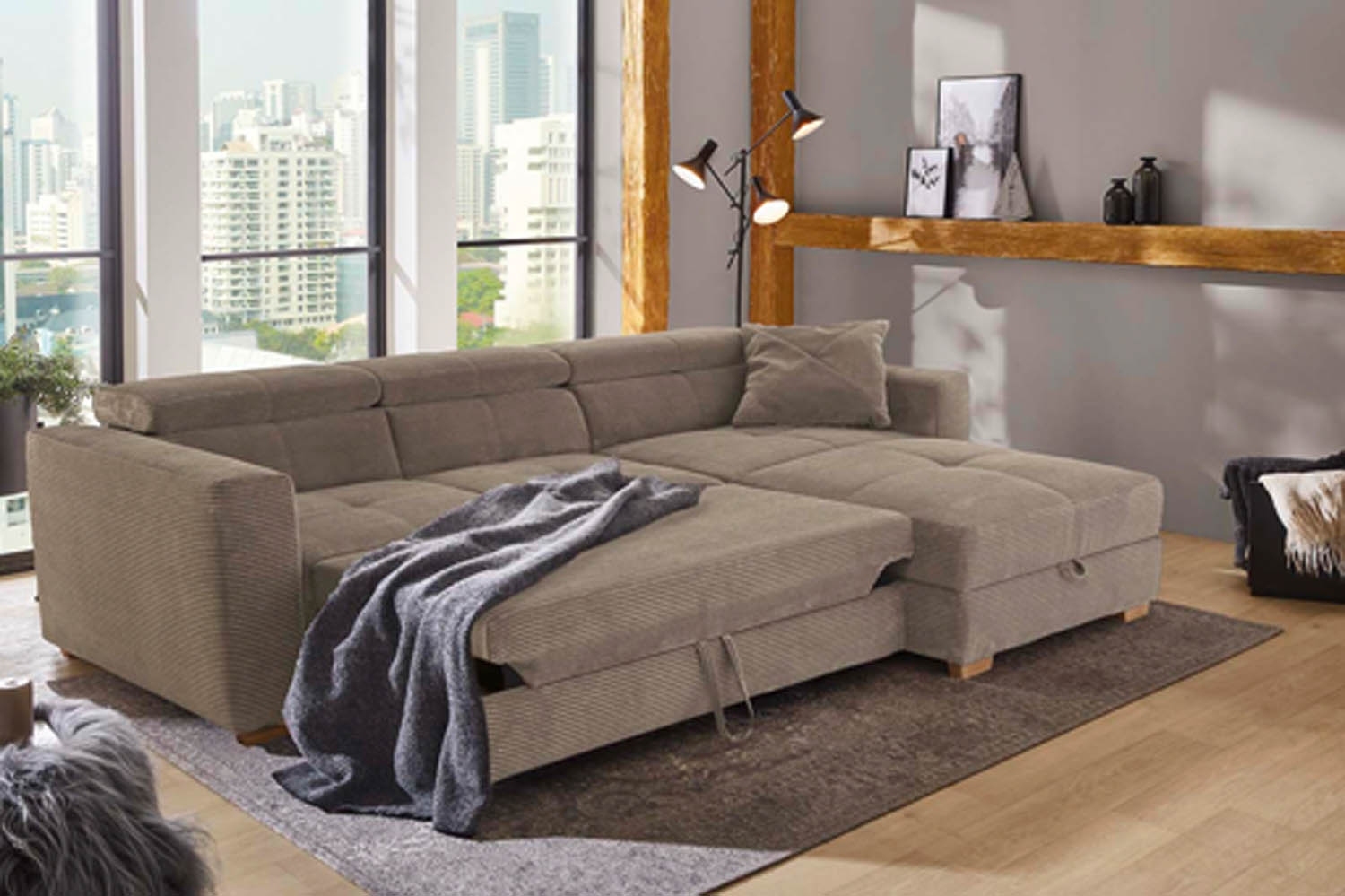 Das ausziehbare Ecksofa in Taupe überzeugt nicht nur durch seine moderne Optik, sondern auch durch vielseitige Funktionen. Der Lieferumfang umfasst 1 Sofa mit ausziehbarer Bettfunktion, einem Bettkasten, beidseitig montierbarer Ottomane, 3 verstellbaren Kopfstützen und 1 Zierkissen. Die großzügige Liegefläche von 134 x 251 cm bietet ausreichend Platz für entspannte Momente. Der Cord-Bezug verleiht dem Sofa eine angenehme Haptik. Mit der Möglichkeit zur Auszieh- und Bettfunktion sowie der Bettkastenfunktion wird das Sofa zur idealen Lösung für Gäste. Die verstellbaren Kopfstützen ermöglichen eine individuelle Anpassung und tragen zum Komfort bei.