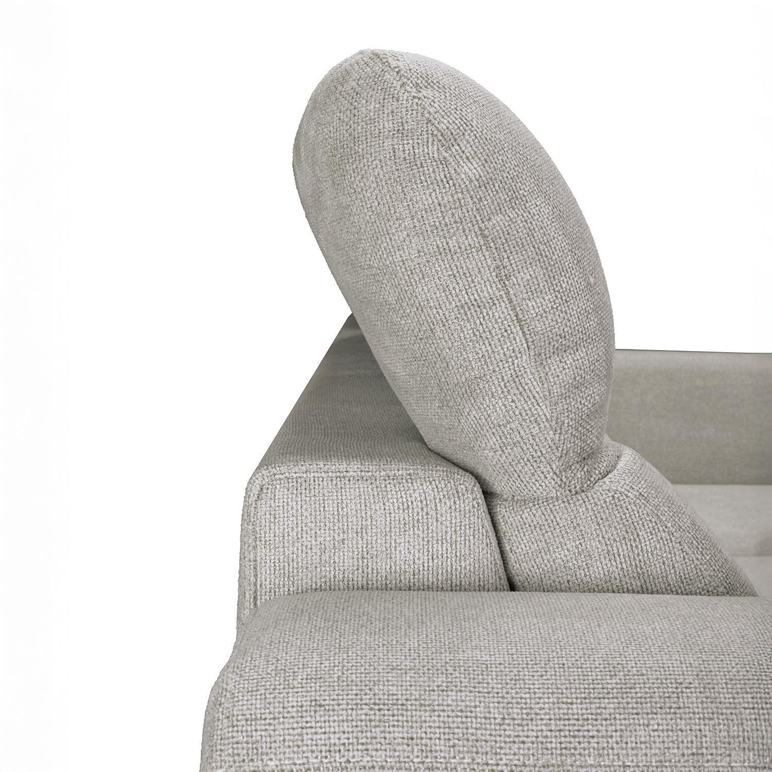 Das Ecksofa TAHIRA verfügt über einen hellgrauen Webstoffbezug und steht auf schwarzen Stellfüßen aus Metall. Diese Polsterecke ist mit drei Kopfteilverstellungen sowie einer Ausziehfunktion und einem Bettkasten ausgestattet. Die Montage der Ottomane erfolgt bei diesem Modell auf der rechten Seite. In der Breite misst dieses Sofa 266 cm, während die Tiefe 185 cm beträgt.