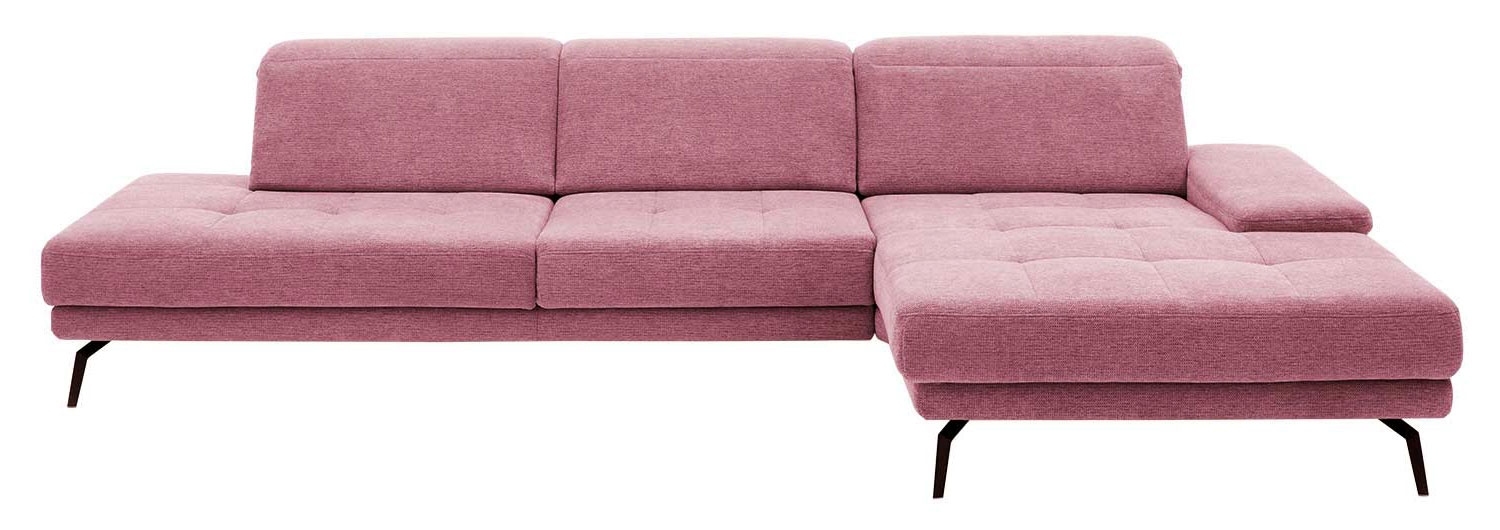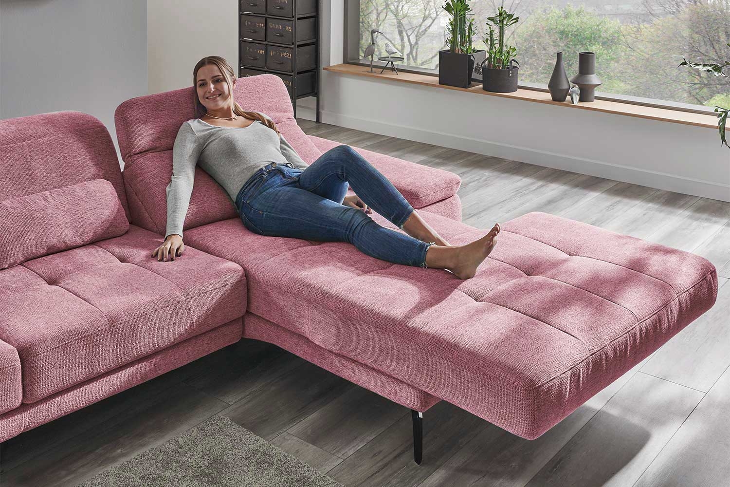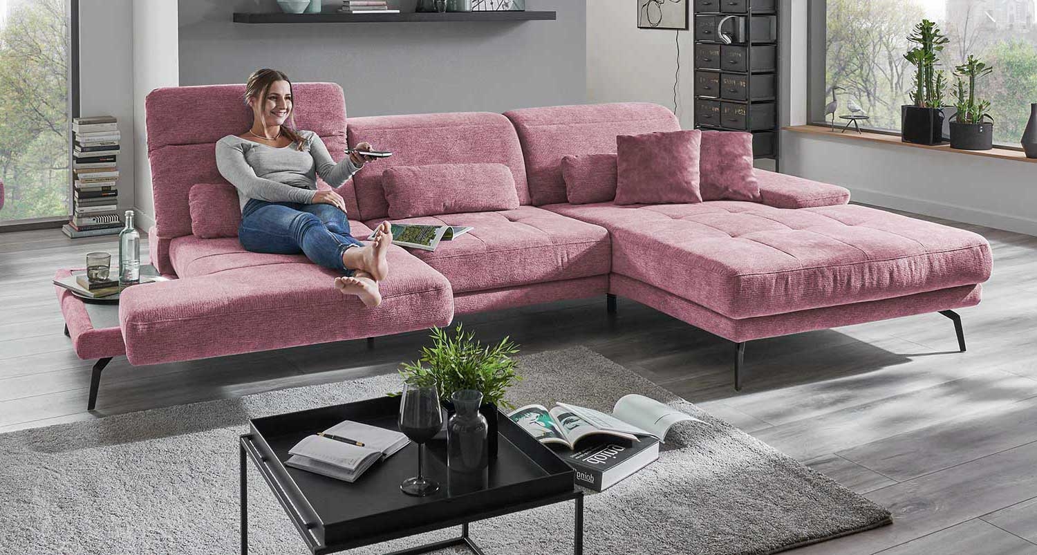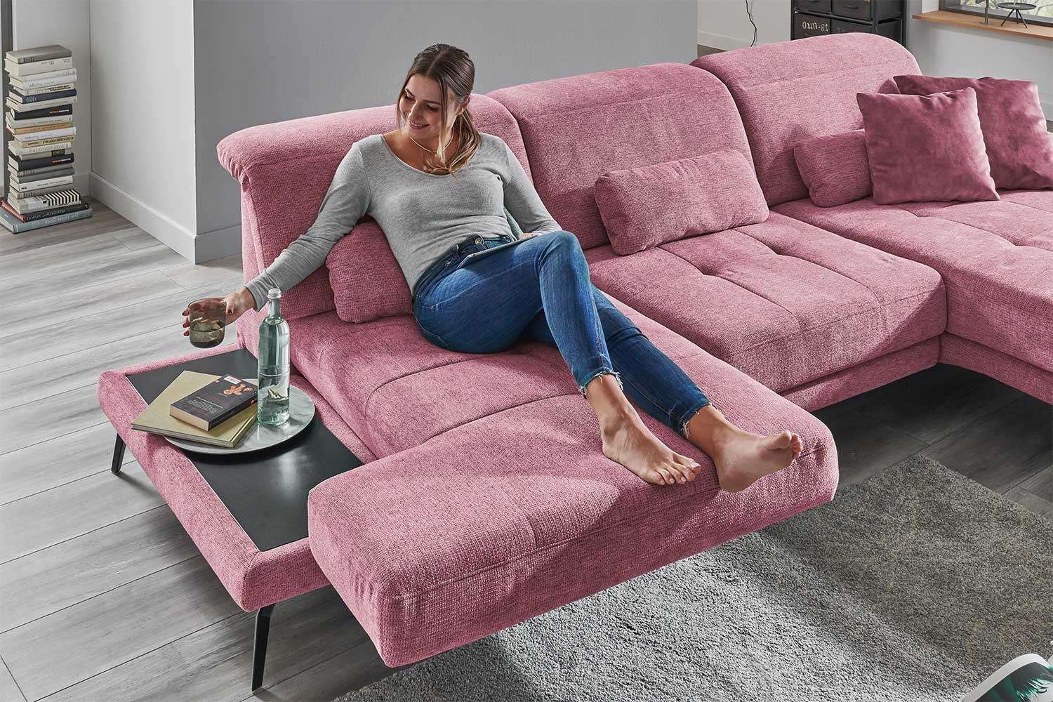 Das Ecksofa sieht mit dem Bezug aus Chenille-Flachgewebe in rosa nicht nur ungewöhnlich aus, es steckt auch voller besonderen Funktionen, die man so nicht oft bei Polstermöbeln zu sehen bekommt. Die rechte Sitzfläche verfügt über eine Drehsitz-Funktion, mit dem das komplette Sitzelement manuell per Hand gedreht werden kann. Durch einfaches drehen der Sitzfläche wird der Hockerabschluss zu einer bequemen Beinauflage mit einer maximalen Belastbarkeit von ca. 30 kg. Zusätzlich wird mit Betätigung der Drehfunktion auch eine kleine Abstellfläche seitlich frei, wo Getränke, Snacks und Zeitschriften abgelegt werden können.