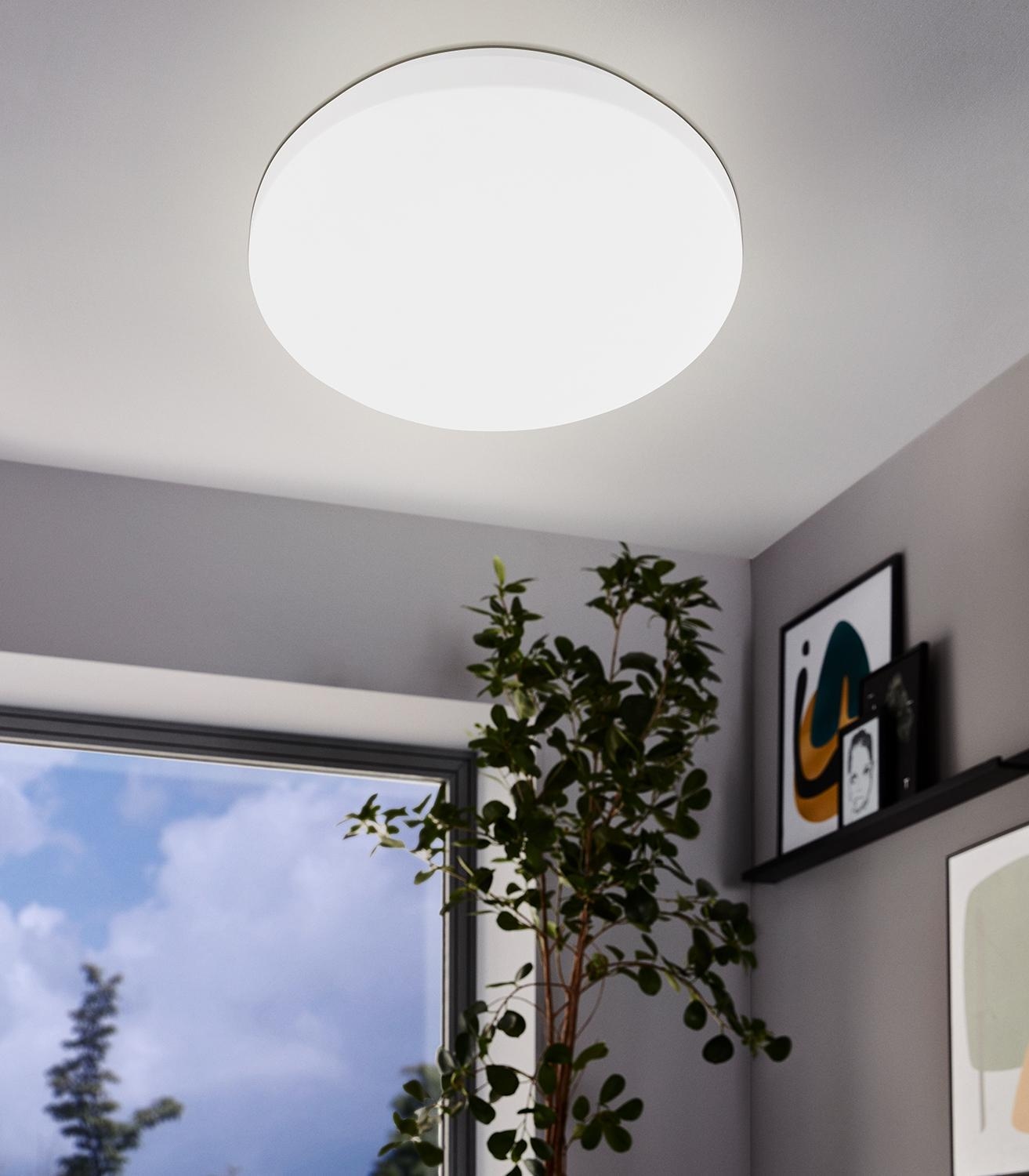 Die LED-Deckenleuchte POGLIOLA der Marke EGLO besteht aus weißem Kunststoff und verfügt über eine Deckenhalterung aus weiß lackiertem Stahl. Sie hat einen Durchmesser von 26 cm und eine Höhe von 5,5 cm. Das fest verbaute LED-Leuchtmittel ist im Lieferumfang enthalten und nicht austauschbar. Mit einer Leistung von 11 Watt erzeugt die Leuchte ein warmweißes Licht von 3000 Kelvin und erreicht eine Helligkeit von 1200 Lumen.
