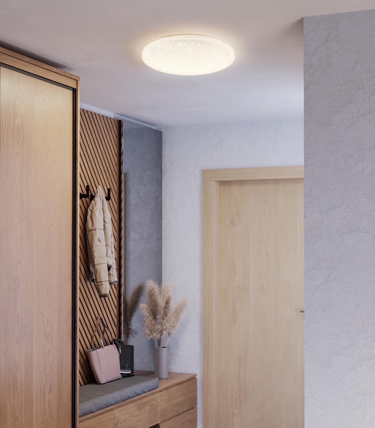 Die LED-Deckenleuchte POGLIOLA der Marke EGLO besteht aus weißem Kunststoff und verfügt über eine Deckenhalterung aus weiß lackiertem Stahl. Sie bietet die Möglichkeit, die Farbtemperatur individuell anzupassen und ist mit einem Sternenhimmelleffekt ausgestattet. Die Leuchte hat einen Durchmesser von 43 cm und eine Höhe von 7 cm. Das fest verbaute LED-Leuchtmittel mit einer Leistung von 25 Watt erzeugt eine Lichtfarbe im Bereich von 3000 bis 6500 Kelvin und erreicht eine Helligkeit von 3000 Lumen.