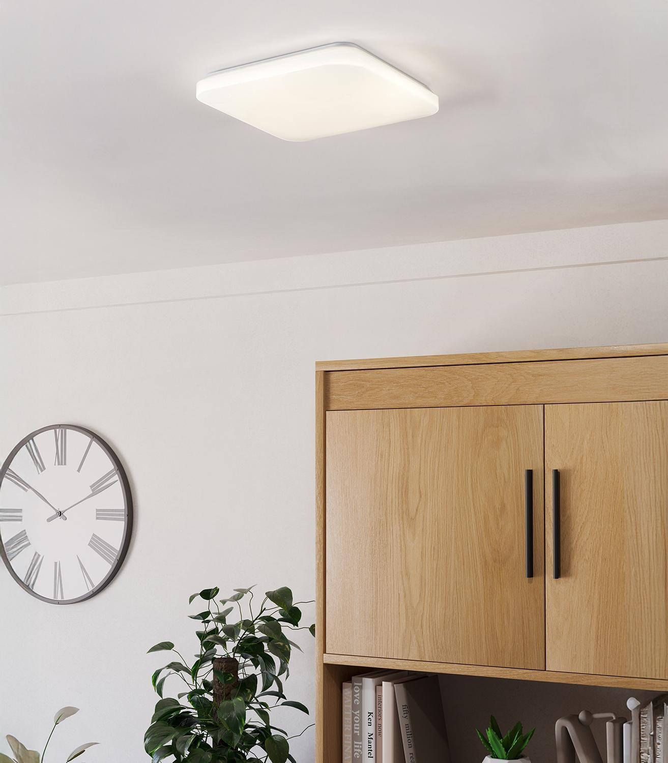 Die LED-Deckenleuchte POGLIOLA der Marke EGLO besteht aus weißem Kunststoff und verfügt über eine Deckenhalterung aus weiß lackiertem Stahl. Sie misst 33 cm in der Breite und Tiefe sowie 7 cm in der Höhe. Die Leuchte ist mit einem fest verbauten LED-Leuchtmittel ausgestattet, das im Lieferumfang enthalten und nicht austauschbar ist. Mit einer Leistung von 18 Watt erreicht sie eine Lichtstärke von 2100 Lumen. Die Farbtemperatur kann flexibel zwischen 3000 und 6500 Kelvin angepasst werden.