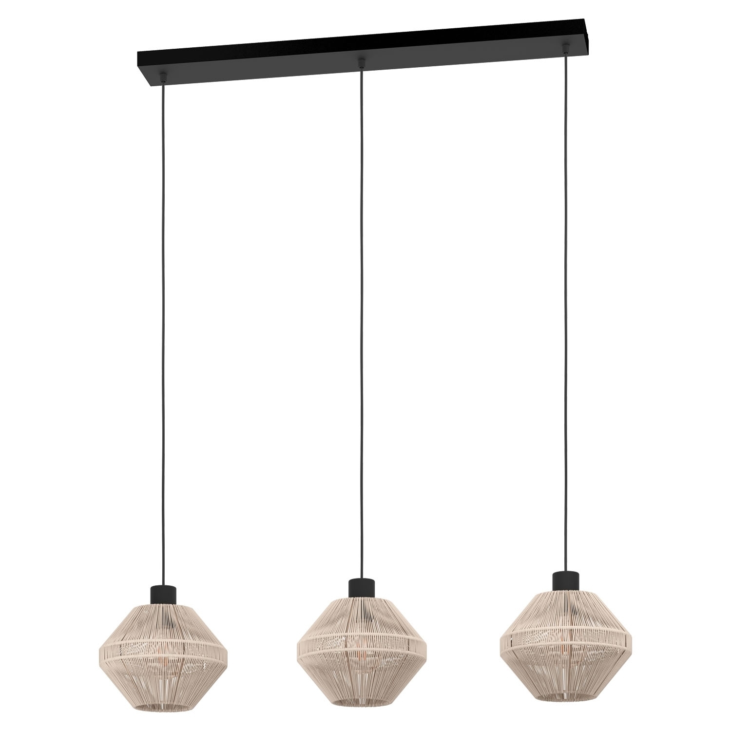 Die Pendelleuchte MIDSUMER von EGLO vereint modernes Design mit rustikalem Charme. Die schwarze Deckenhalterung aus Stahl und die cremefarbenen Lampenschirme mit Seilbespannung schaffen eine einladende Atmosphäre. Mit einer Breite von 92 cm, einer Höhe von 110 cm und einer Tiefe von 22 cm ist sie ideal für längliche Räume. Sie verfügt über drei E27-Leuchtmittel, die jeweils bis zu 40 Watt Leistung haben dürfen, jedoch nicht im Lieferumfang enthalten sind. Die Leuchtmittel sind austauschbar, was die Flexibilität der Beleuchtung erhöht.
