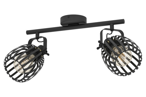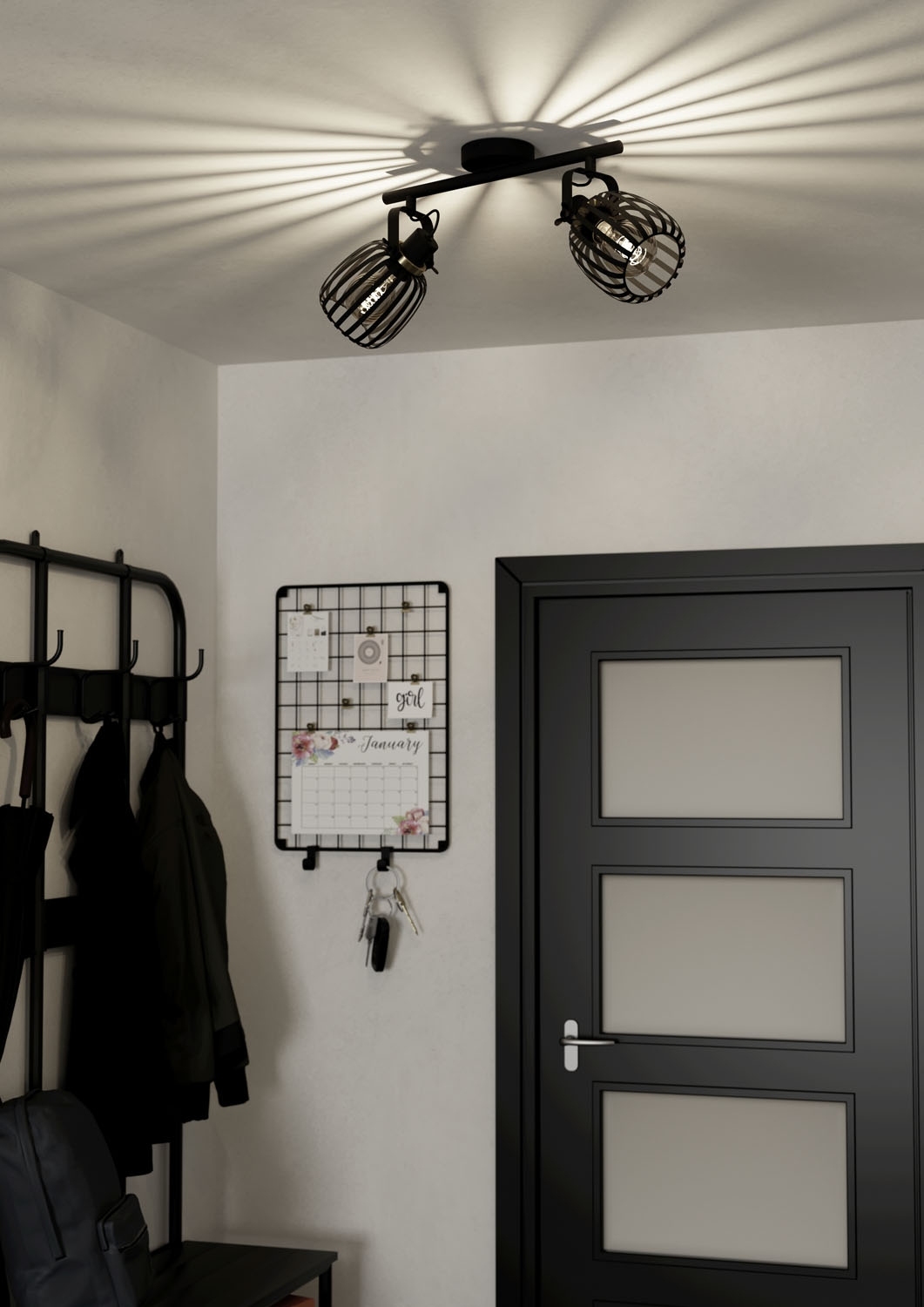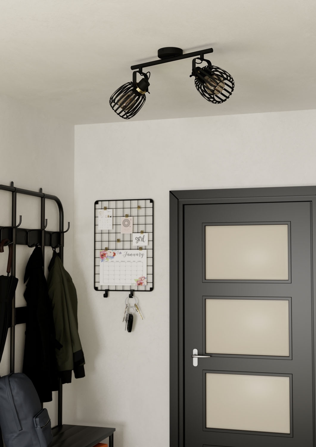 Der imposante schwarze Strahler (44x15x19 cm) wird ohne Leuchtmittel geliefert. Sein Metallgestell und der Drahtschirm verleihen ihm eine moderne Note. Mit 2 austauschbaren E27-Leuchtmitteln (bis 40 Watt) ermöglicht er eine flexible Beleuchtung. Die Bedienung erfolgt über den Wandschalter, und die verstellbare Funktion ermöglicht eine individuelle Lichtausrichtung. Dank IP20-Schutzart ist er für den Einsatz in Innenräumen geeignet – ein perfektes Element für zeitgemäße Raumbeleuchtung.