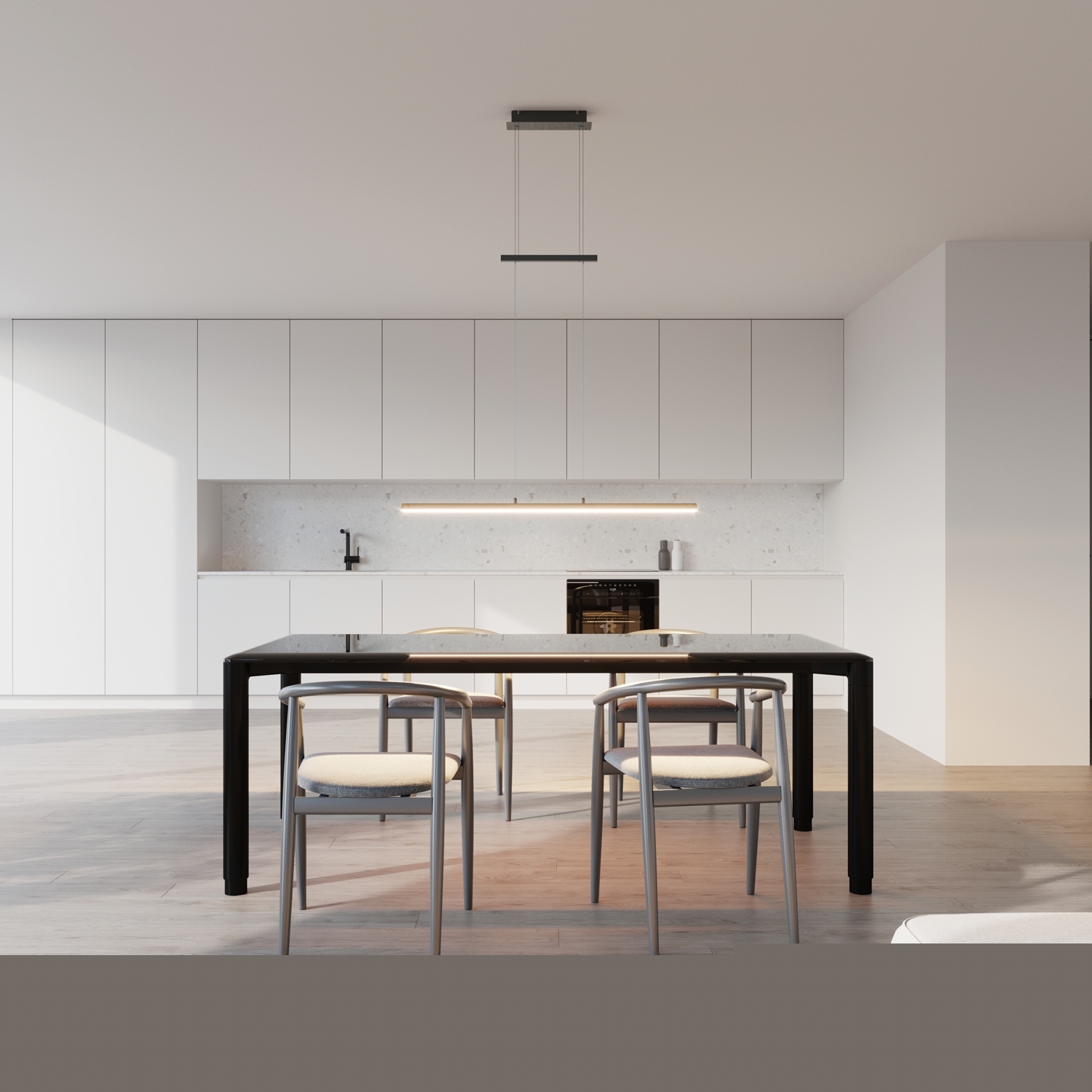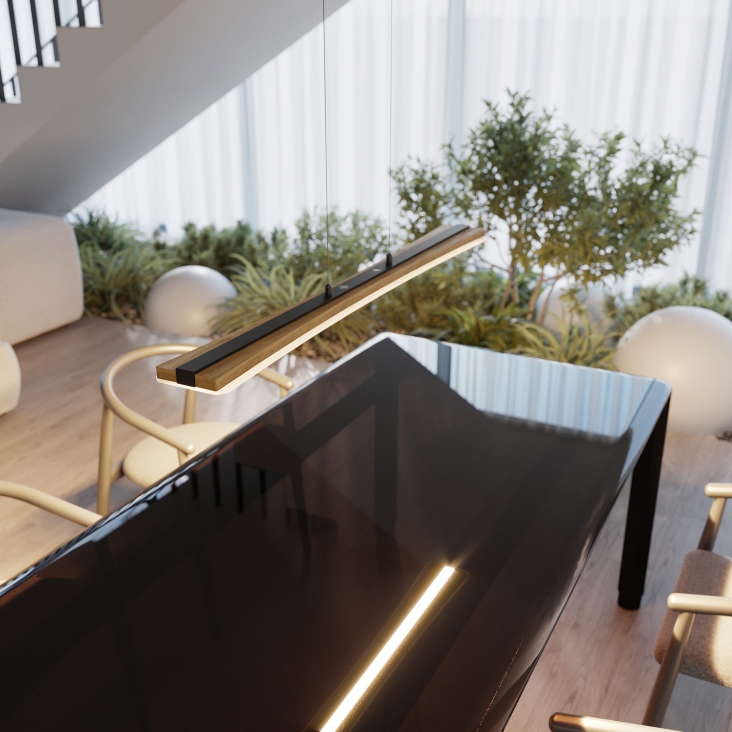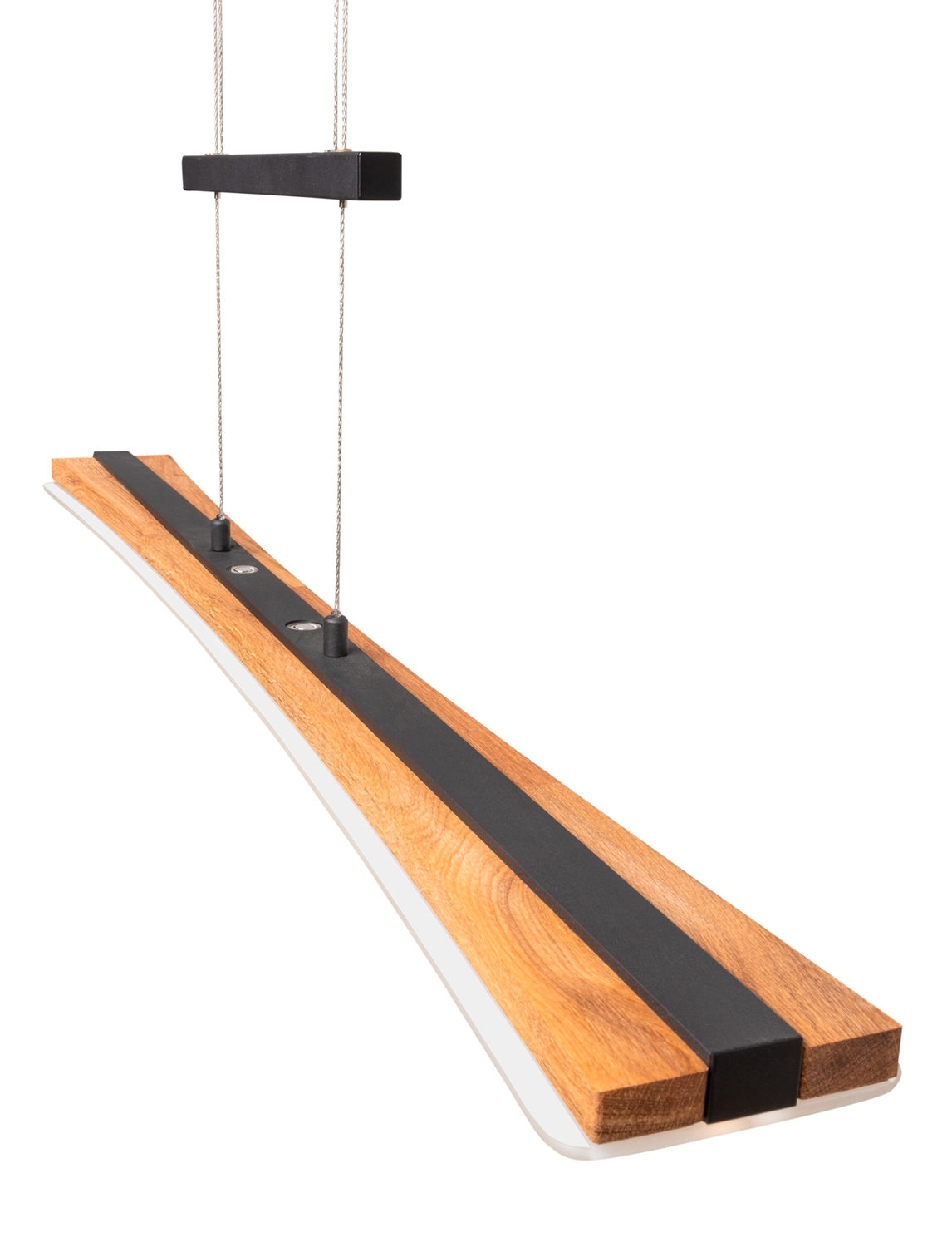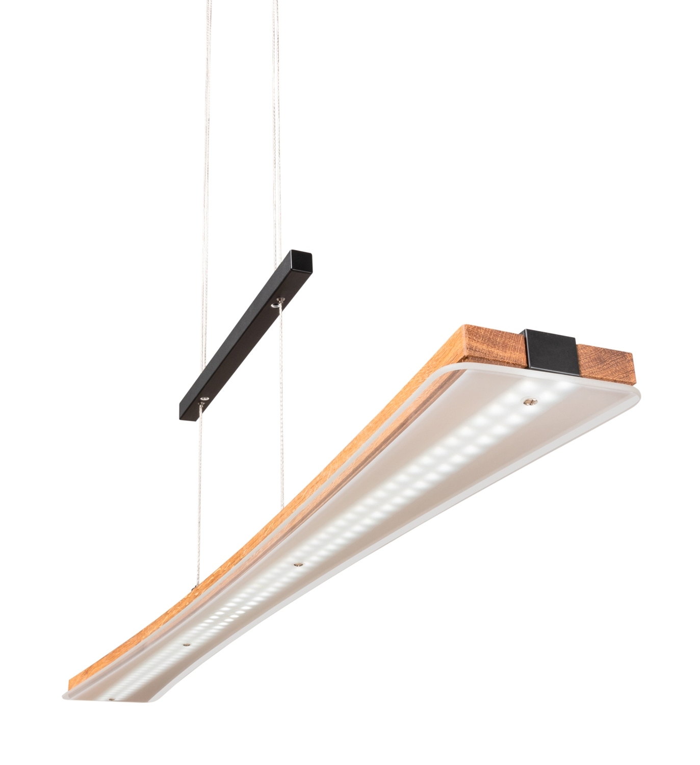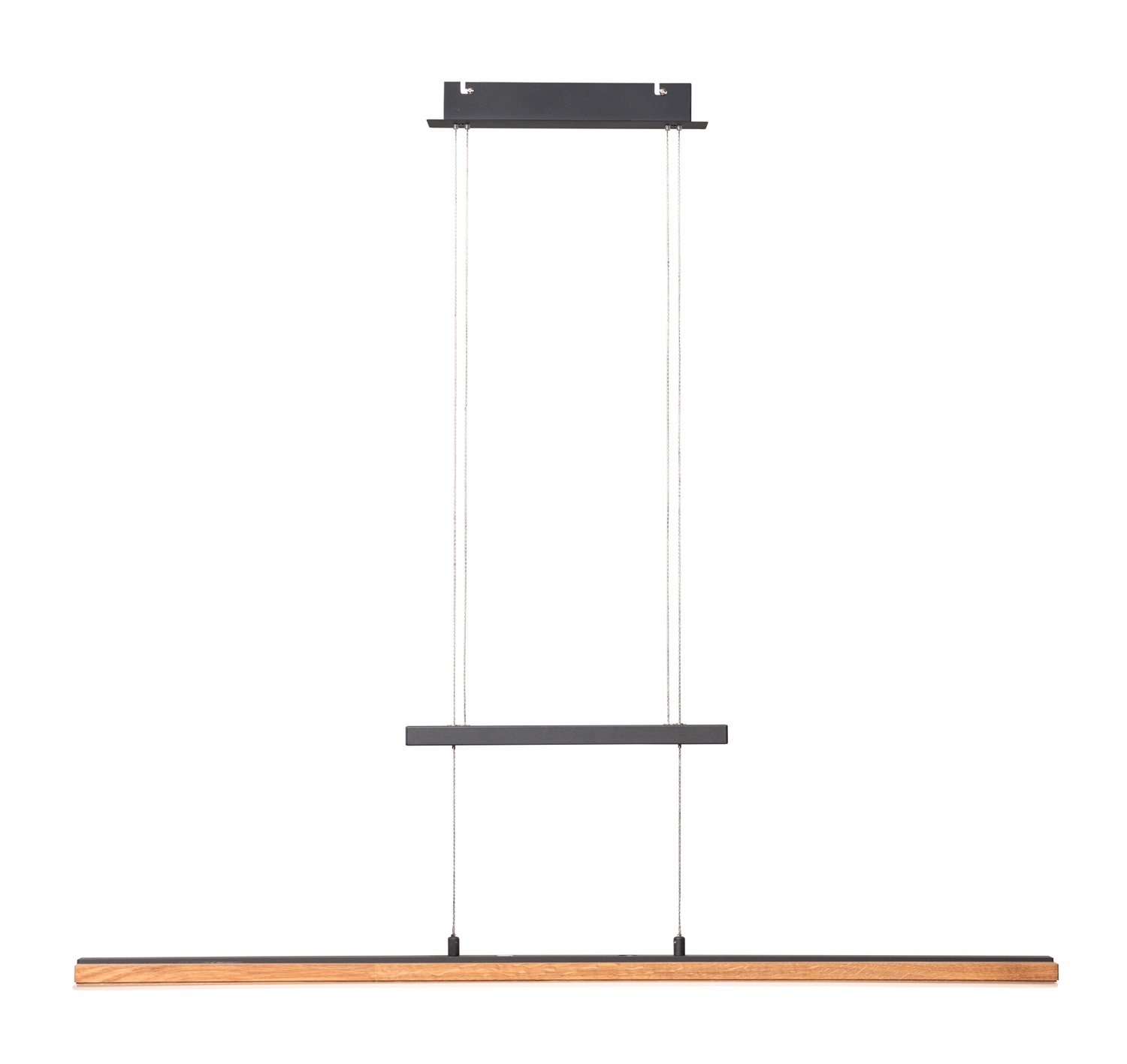 Die LED-Pendelleuchte PANAMA von Elobra besticht durch ihre moderne Kombination aus schwarzem Metall und einem Lampenschirm aus Eichenholz. Diese Pendelleuchte ist individuell höhenverstellbar von 90 bis 165 cm, sodass sie sich an verschiedene Raumhöhen und Beleuchtungsbedürfnisse anpassen lässt. Ein besonderes Highlight ist der integrierte Touchdimmer, der eine einfache Anpassung der Lichtintensität ermöglicht. Mit einer Breite von 100 cm, einer maximalen Höhe von 165 cm und einer Tiefe von 12 cm fügt sich die Leuchte harmonisch in jede Einrichtung ein. Die Leuchte enthält ein LED-Leuchtmittel mit einer Leistung von 18 Watt, das im Lieferumfang enthalten, aber nicht austauschbar ist. Sie bietet eine Farbtemperatur von 3000 bis 6500 Kelvin und eine Helligkeit von 1950 Lumen, wodurch eine angenehme Beleuchtung für verschiedene Stimmungen und Aktivitäten gewährleistet wird.