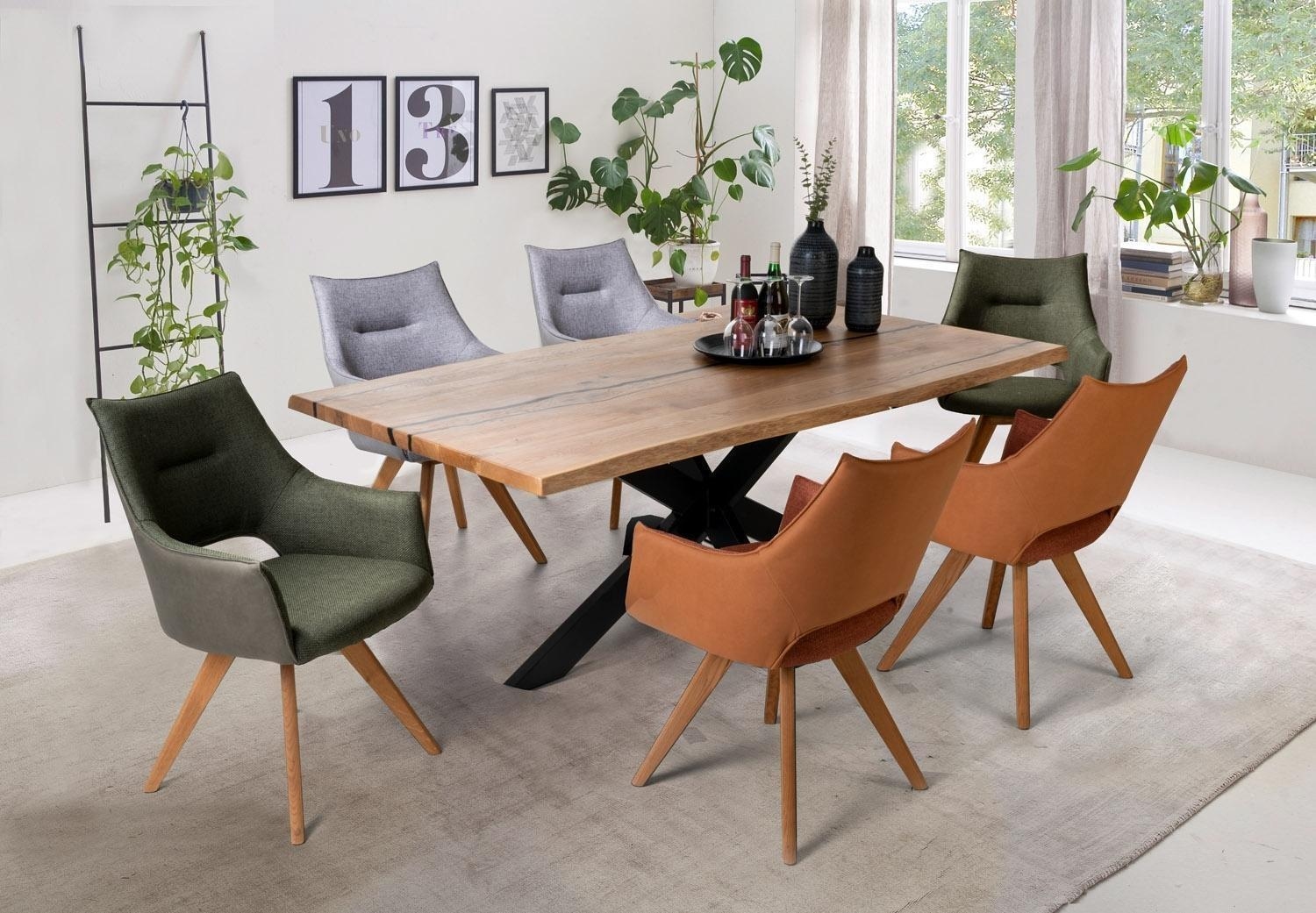 Das Doppel-X-förmige Gestell aus lackiertem Metall in schwarz matt verleiht dem Esstisch eine hohe Stabilität und rundet das Gesamtbild ab.