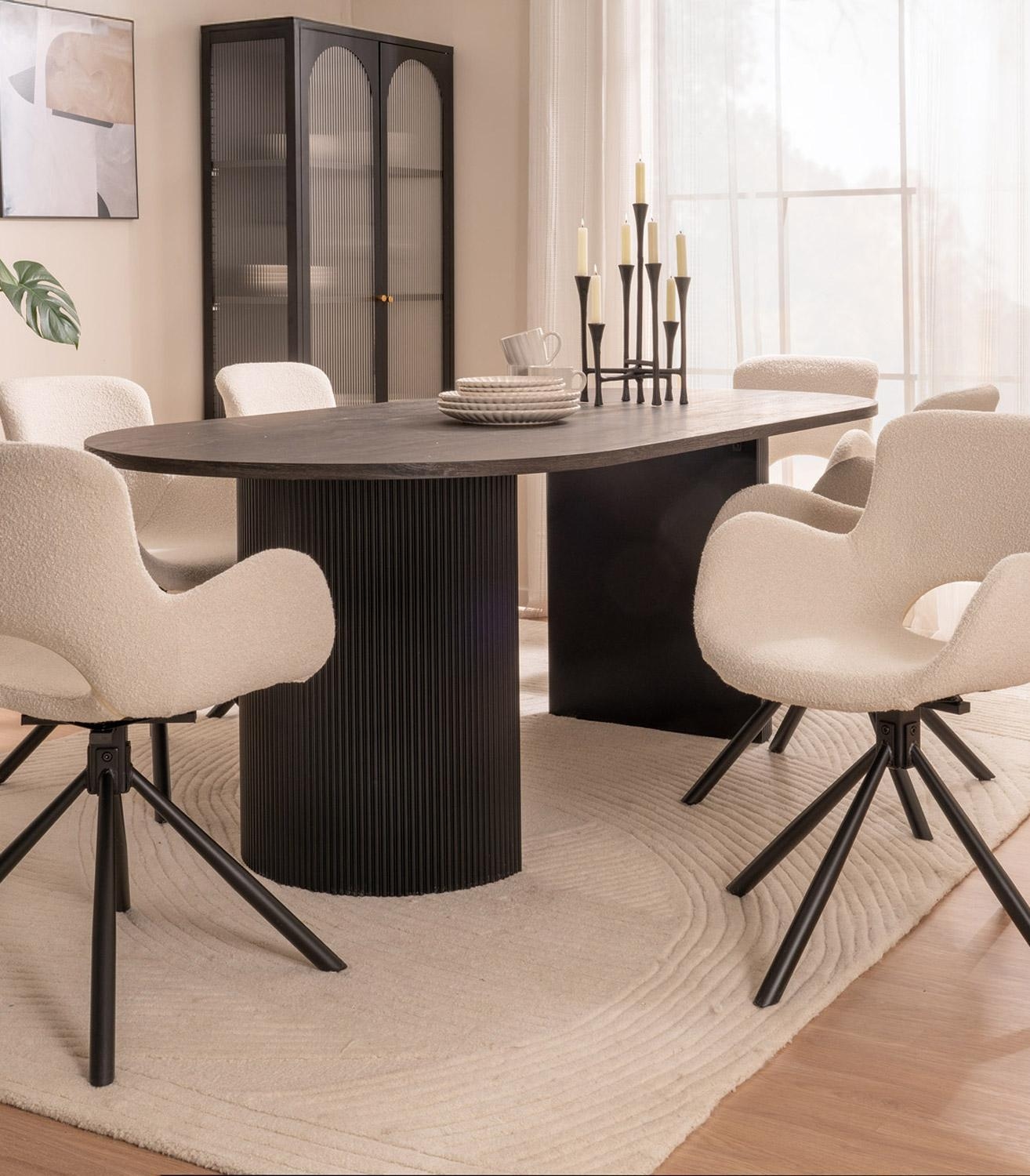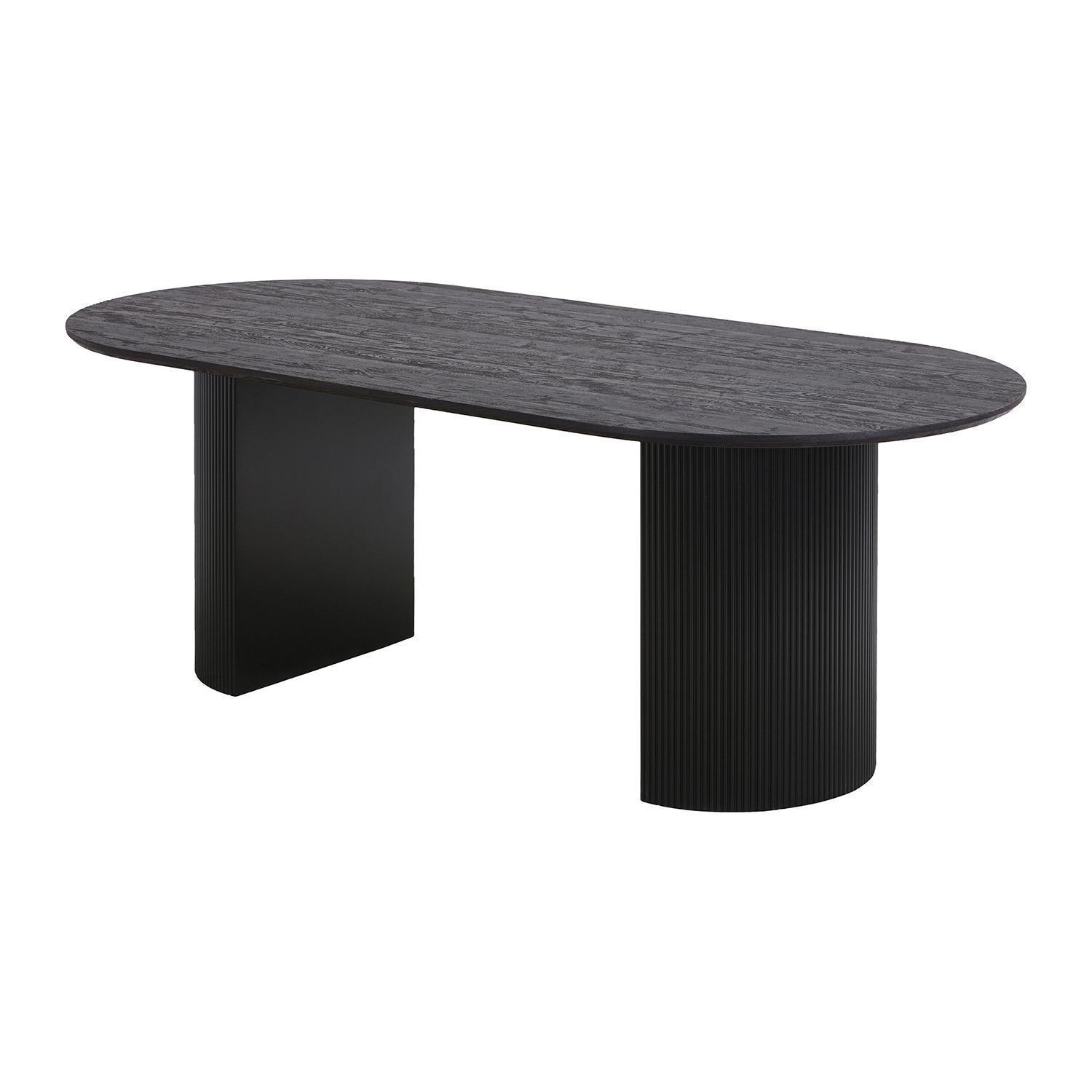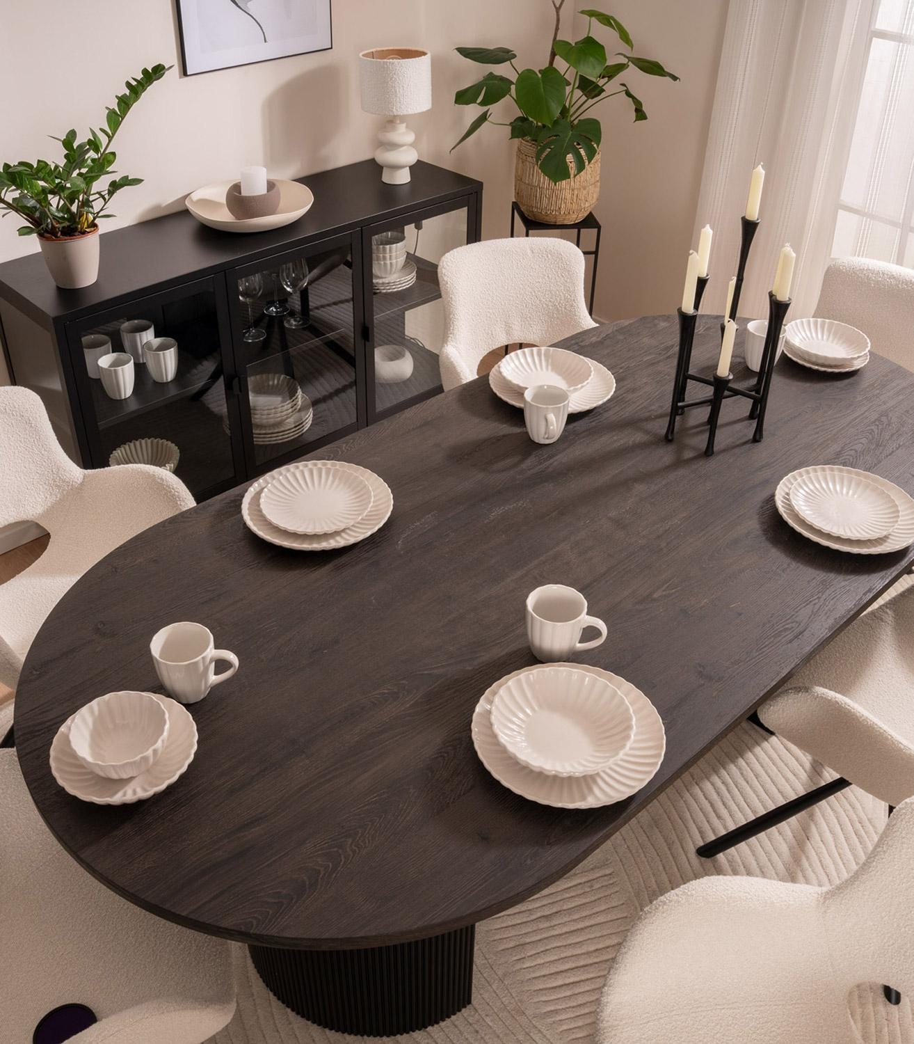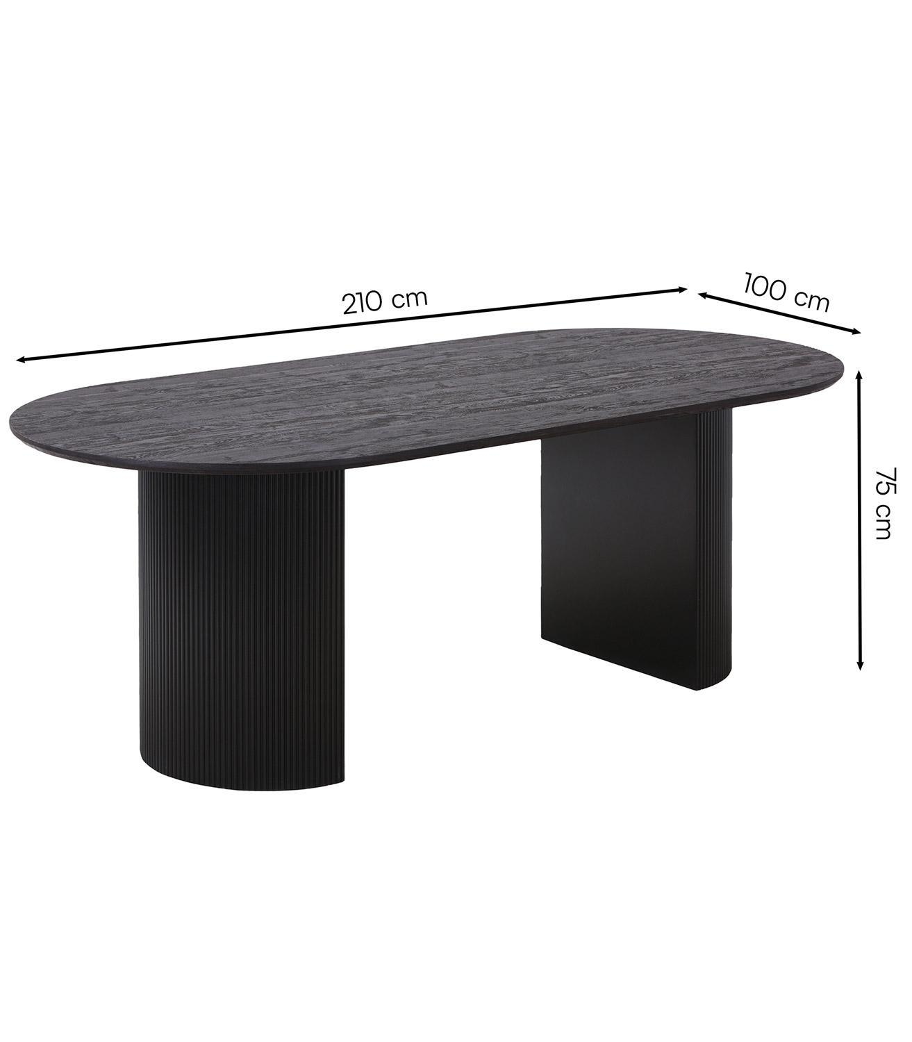 Der Esstisch BAILANDO besteht aus MDF und ist in Dunkelbraun gehalten. Die Tischplatte ist in Holzoptik gestaltet und ruht auf zwei halbrunden Tischgestellen, die dem Tisch seine charakteristische Form geben. Mit einer Breite von 210 cm, einer Tiefe von 100 cm und einer Höhe von 75 cm bietet der Tisch Platz für bis zu sechs Personen.