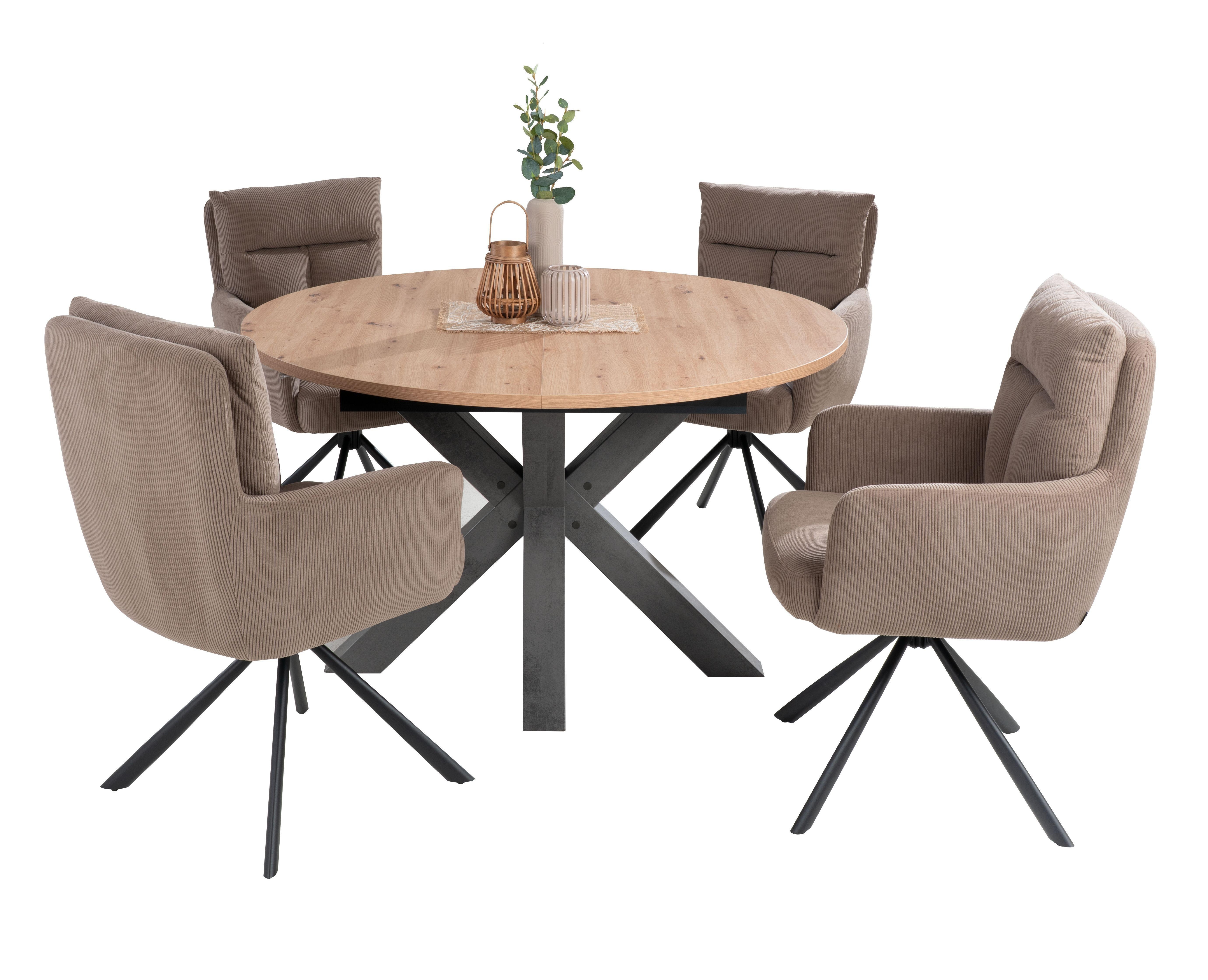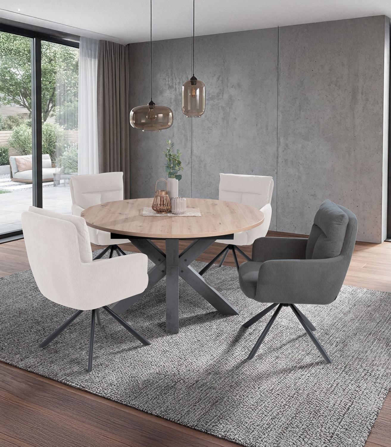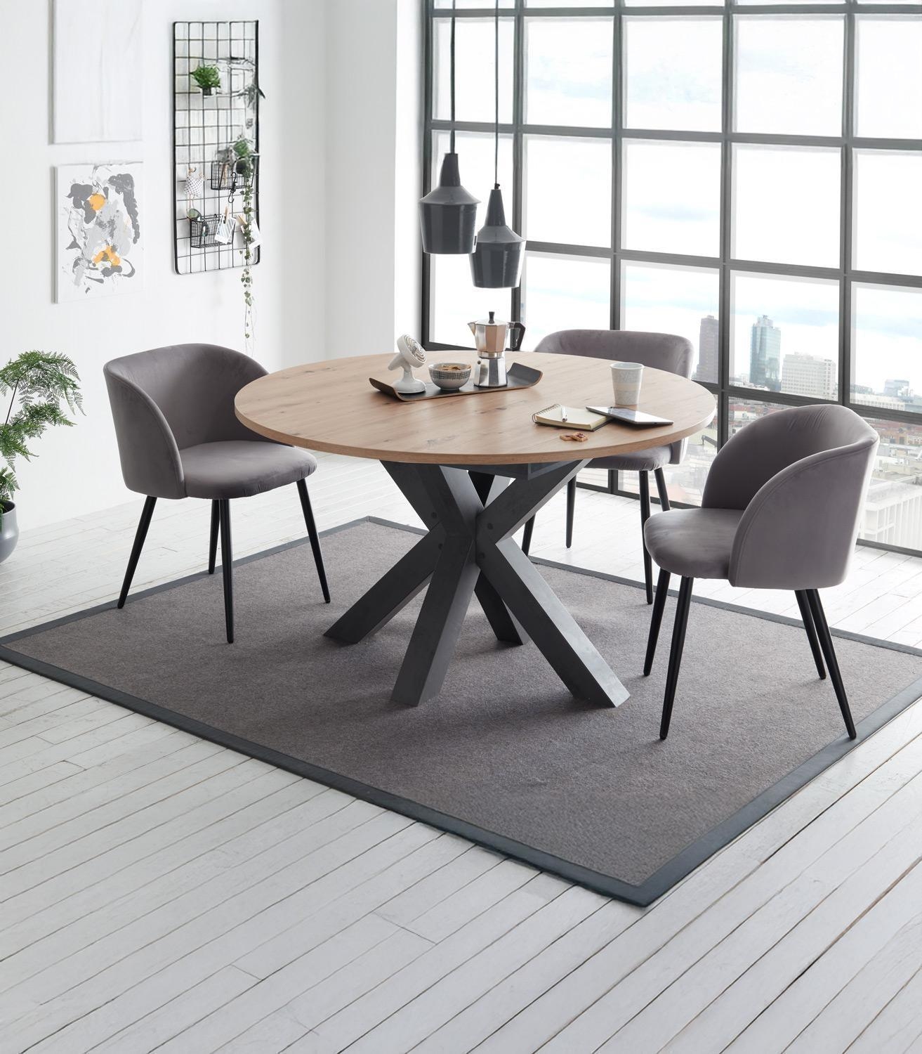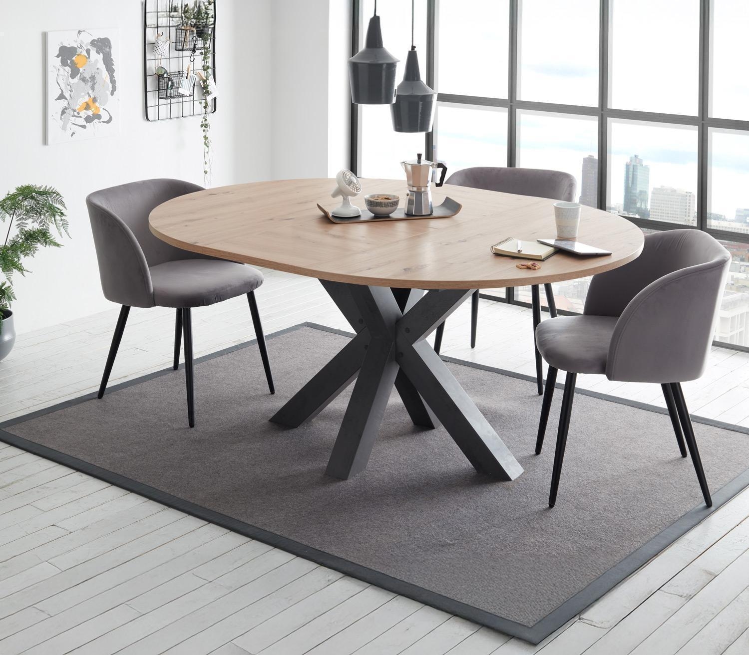 Der ausziehbare Esstisch BERTONE vereint Funktionalität mit stilvollem Design. Seine Tischplatte aus Holzwerkstoff in Asteiche Dekor strahlt natürlichen Charme aus, während das sternförmige Gestell in Graphit Dekor einen modernen Akzent setzt. Perfekt geeignet für Esszimmer und Küche, bietet er mit einem Durchmesser von 130 cm ausreichend Platz. Ausgezogen erreicht er eine Breite von 170 cm, ideal für gesellige Mahlzeiten. Mit einer Höhe von 77,5 cm und einer Tischplattenstärke von 2,5 cm ist er stabil und robust. Hergestellt in Deutschland, überzeugt er zudem mit hervorragender Qualität und Verarbeitung.