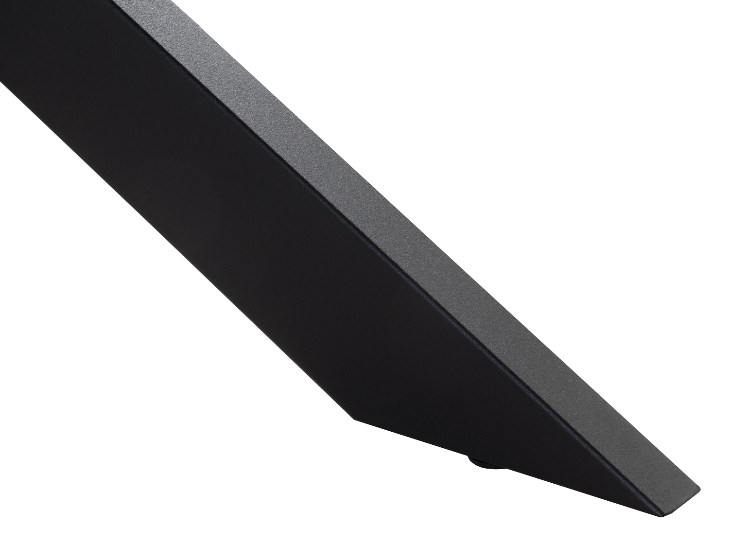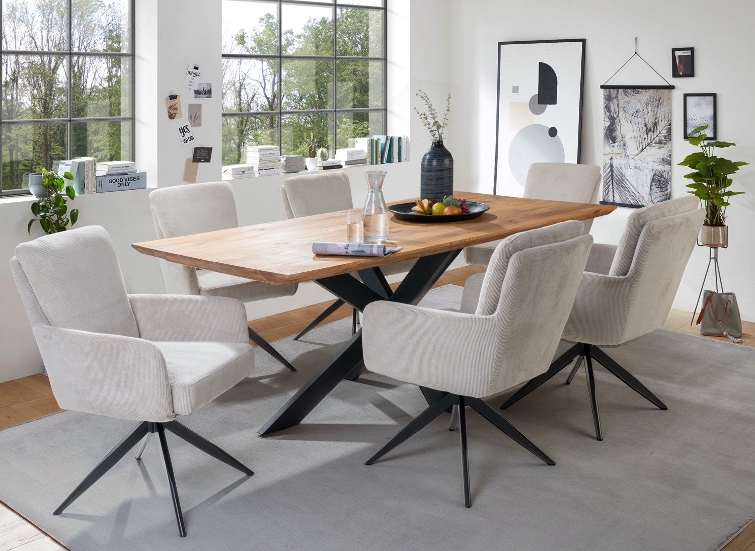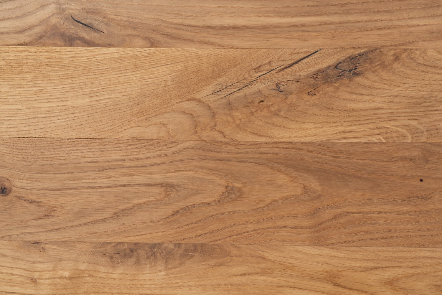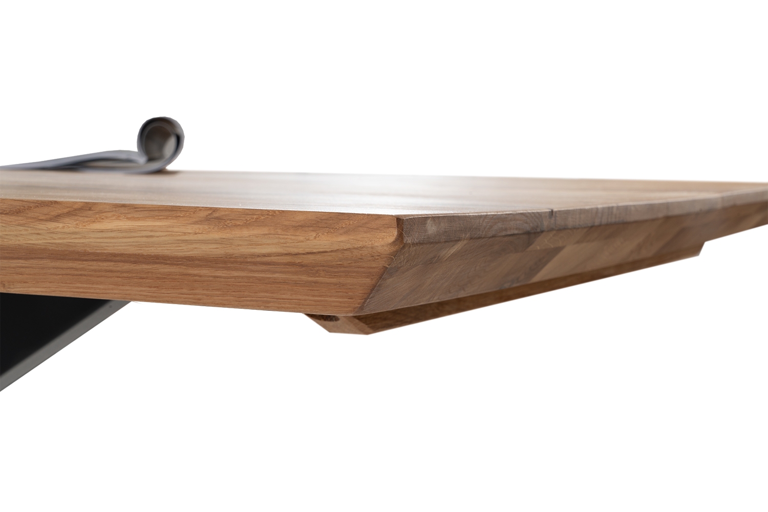 Die Tischplatte aus massiver Wildeiche verfügt über schweizer Kanten. Dabei verlaufen die Kanten nicht gerade nach unten, sondern sind sowohl nach unten als auch nach hinten abgeschrägt.