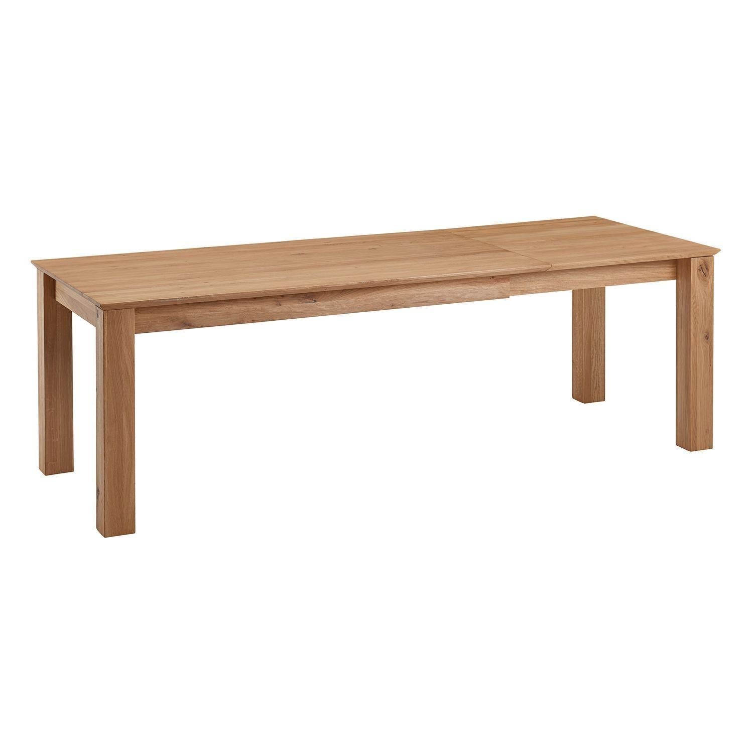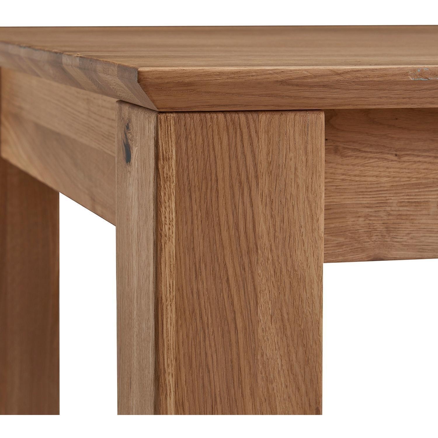 Der Esstisch COLUMBUS ist aus massivem Wildeichenholz gefertigt. Er verfügt über eine Einlegeplatte, mit der die Tischlänge von 160 cm auf bis zu 230 cm erweitert werden kann. Die Höhe beträgt 75 cm, die Tiefe liegt bei 90 cm. Zuletzt sind die Tischplatten mit Schweizer Kanten versehen. Dabei verlaufen die Kanten nicht gerade nach unten, sondern sie sind sowohl nach unten als auch nach hinten abgeschrägt.