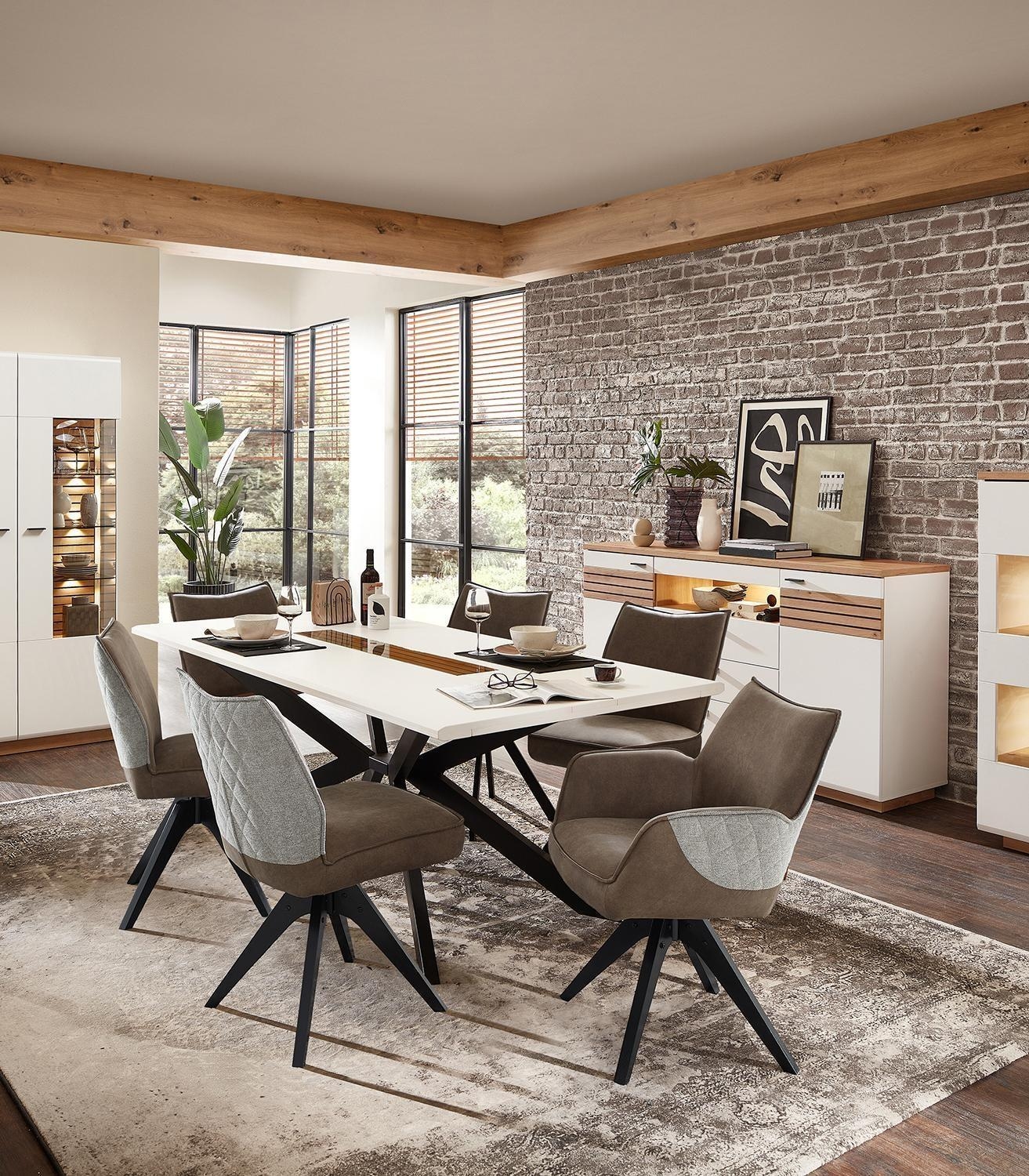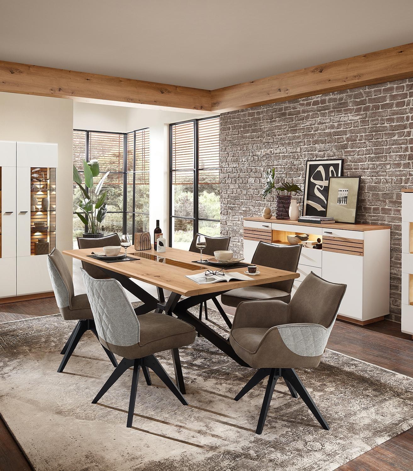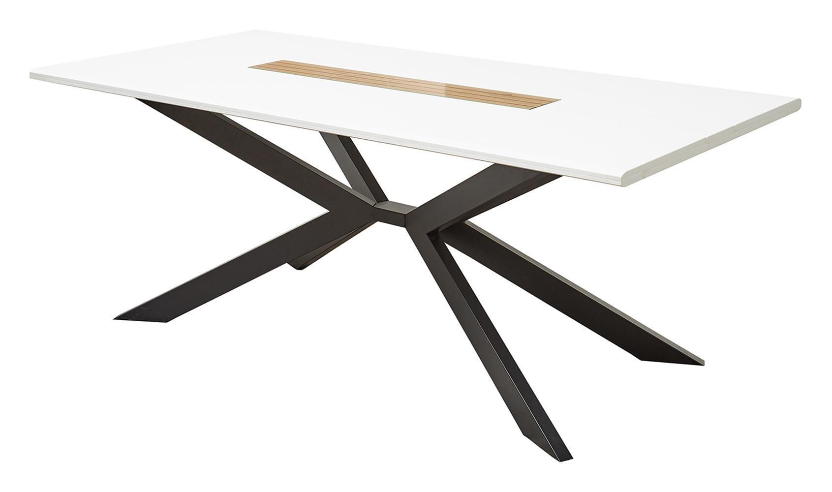 Der Esstisch FANCY verfügt über eine Tischplatte in Weiß matt, die mit Absetzungen in Artisan Eiche Dekor versehen ist. Die Konstruktion ruht auf einem schwarzen Spider-Gestell und weist leicht abgerundete Tischkanten auf. Bei einer Breite von 180 cm, einer Höhe von 76 cm und einer Tiefe von 100 cm bietet die Fläche Platz für vier bis sechs Personen.