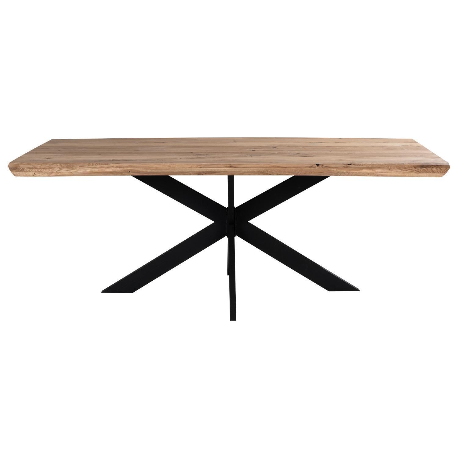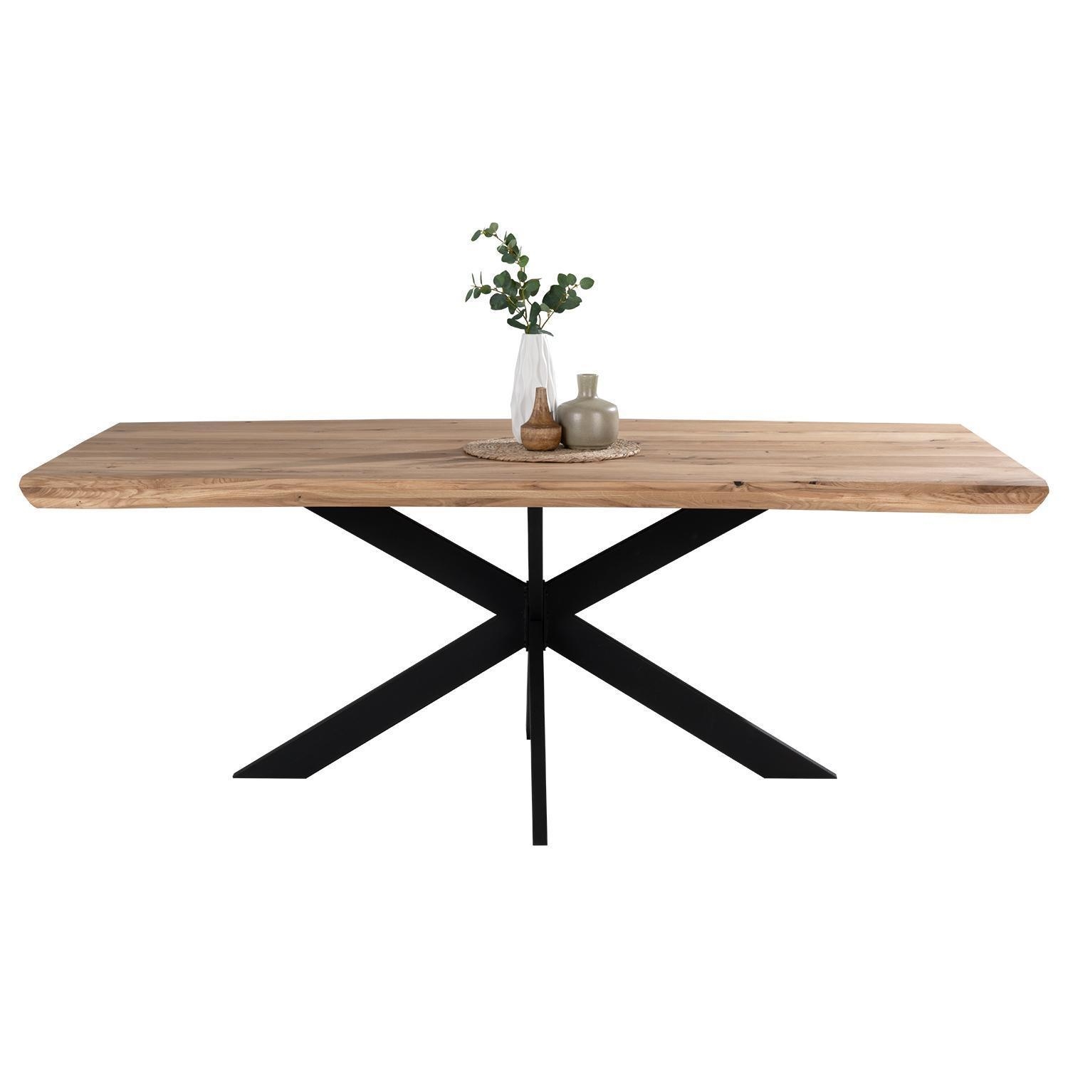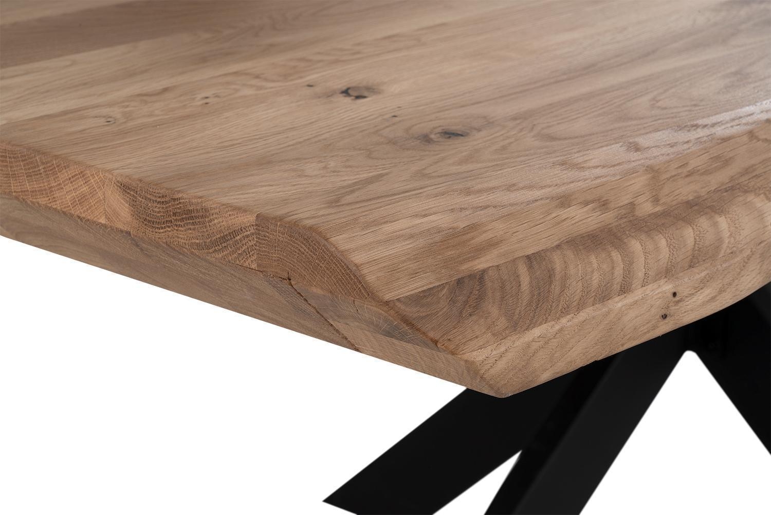 Der Esstisch LENDRO verfügt über eine Tischplatte aus massivem Eichenholz. Die Oberfläche ist geölt, was die natürliche Holzstruktur zur Geltung bringt und pflegeleicht macht. Charakteristisch für das Modell sind die beidseitig gearbeiteten Baumkanten. Das sternförmige Gestell besteht aus schwarzem Metall und verleiht dem Tisch eine stabile Basis. Die Breite des Tisches beträgt 200 cm, die Tiefe 100 cm.