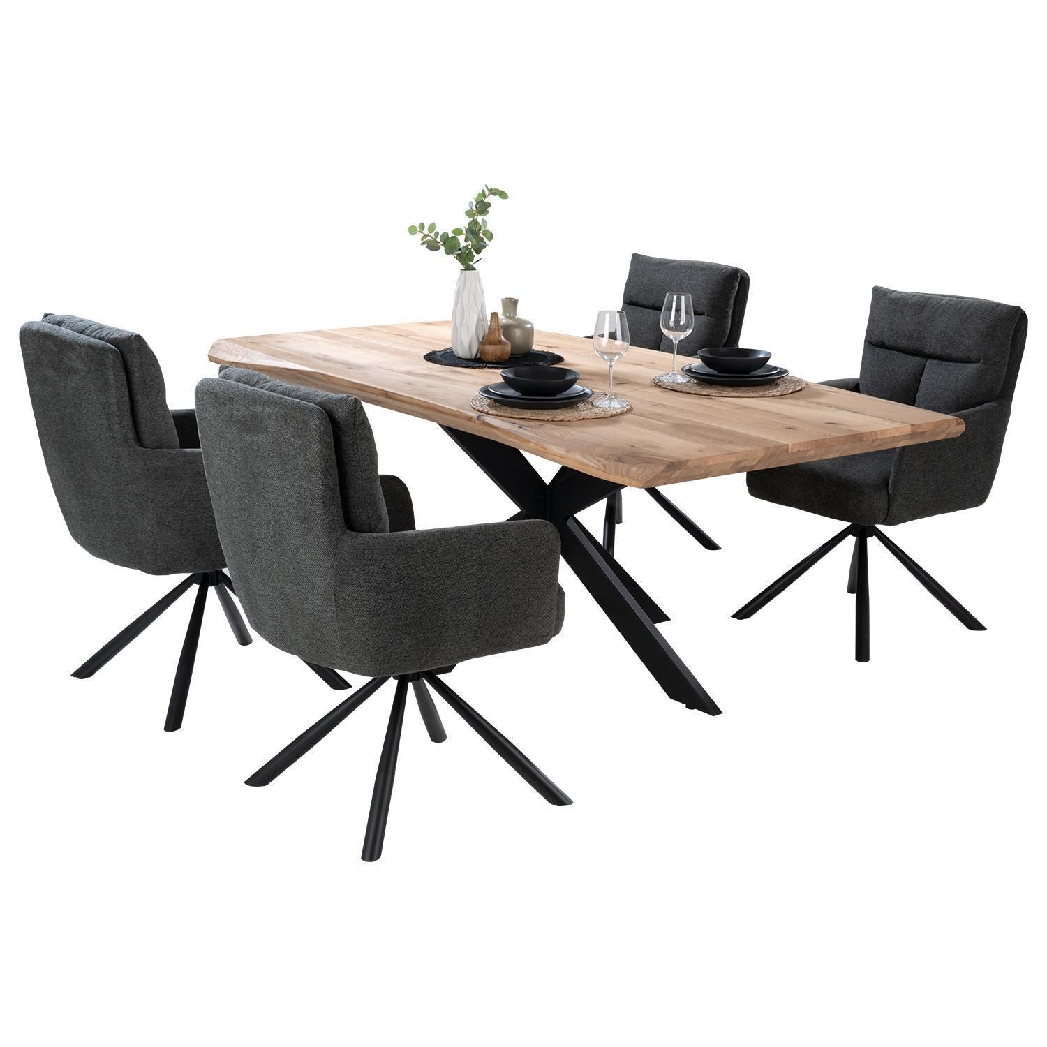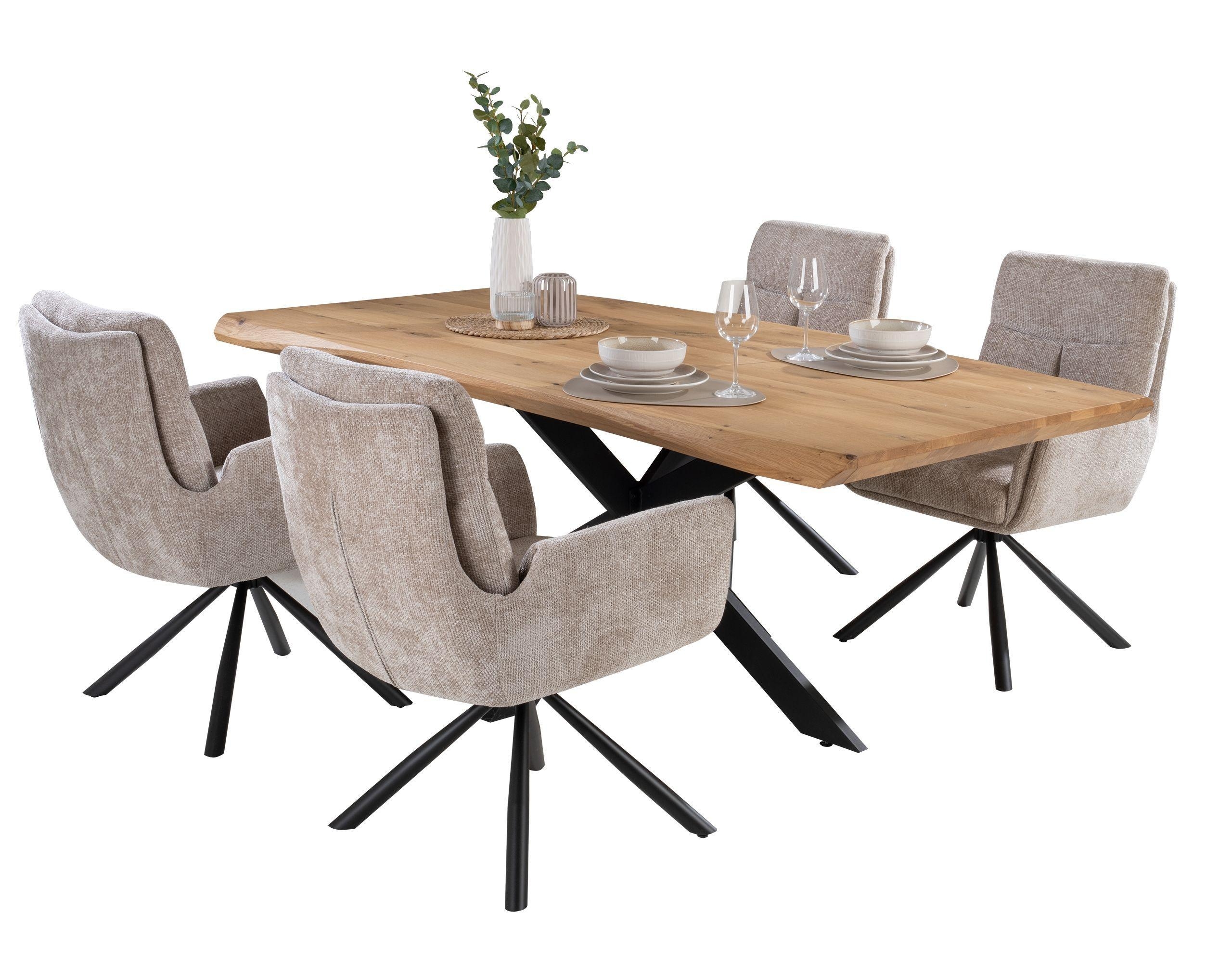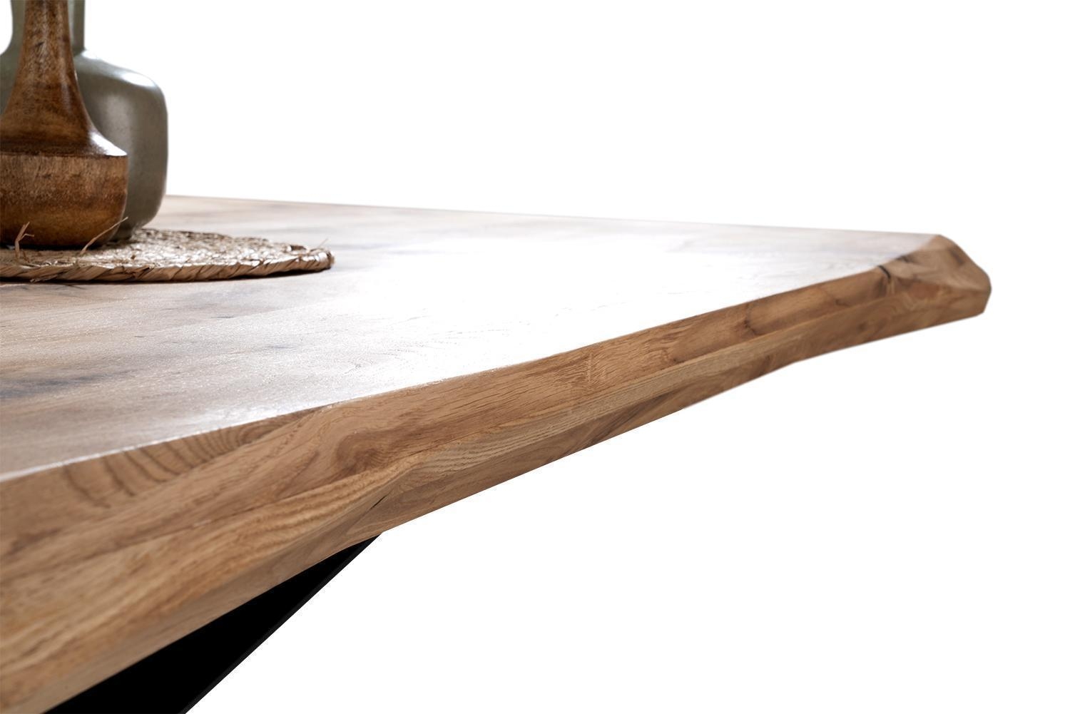 Der Esstisch LENDRO verfügt über eine Tischplatte aus massivem Eichenholz. Die Oberfläche ist geölt, was die natürliche Holzstruktur zur Geltung bringt und pflegeleicht macht. Charakteristisch für das Modell sind die beidseitig gearbeiteten Baumkanten. Das sternförmige Gestell besteht aus schwarzem Metall und verleiht dem Tisch eine stabile Basis. Die Breite des Tisches beträgt 200 cm, die Tiefe 100 cm.