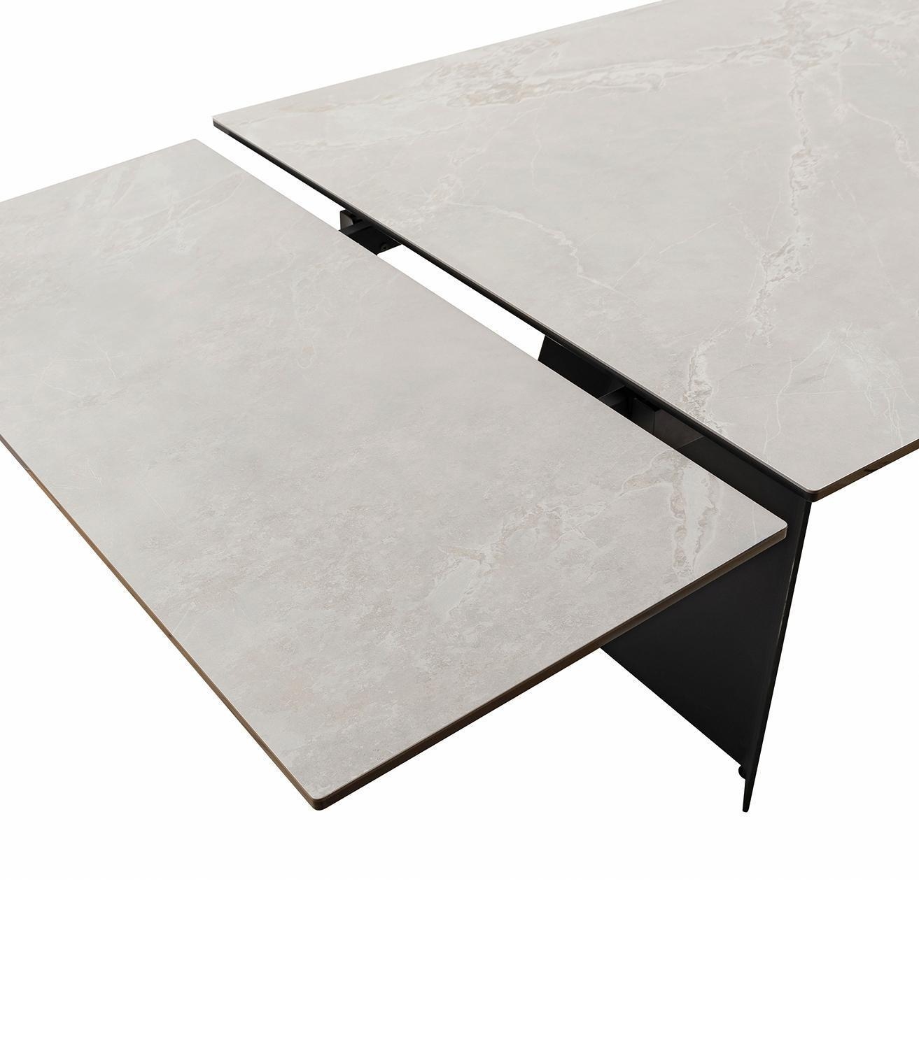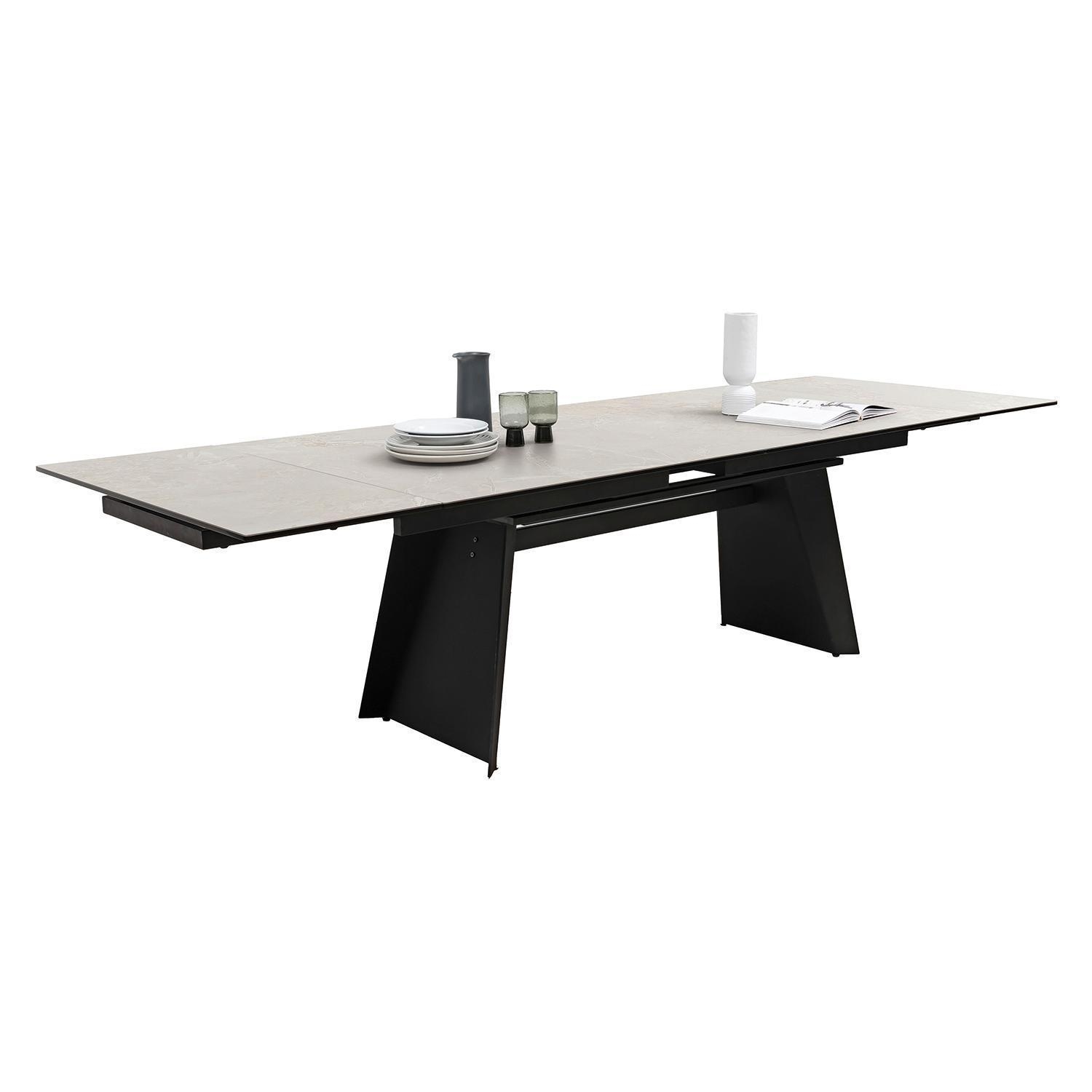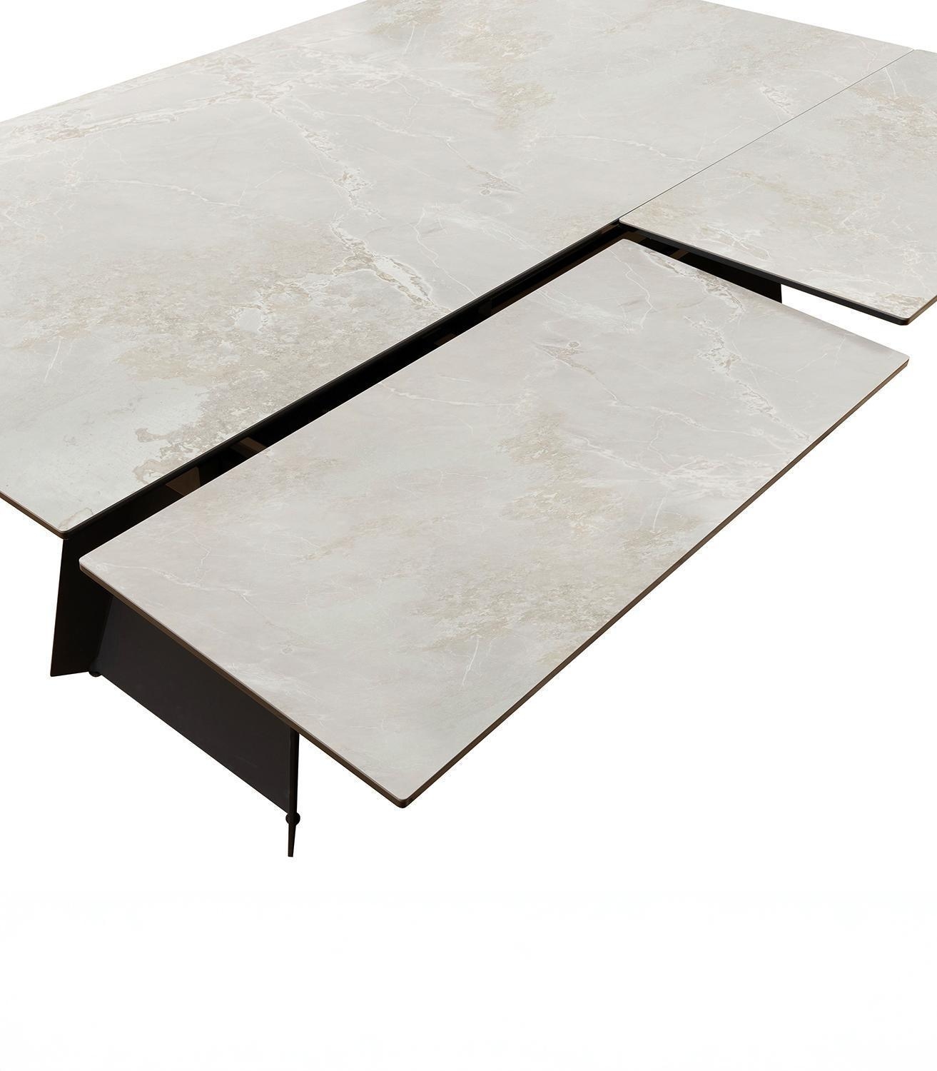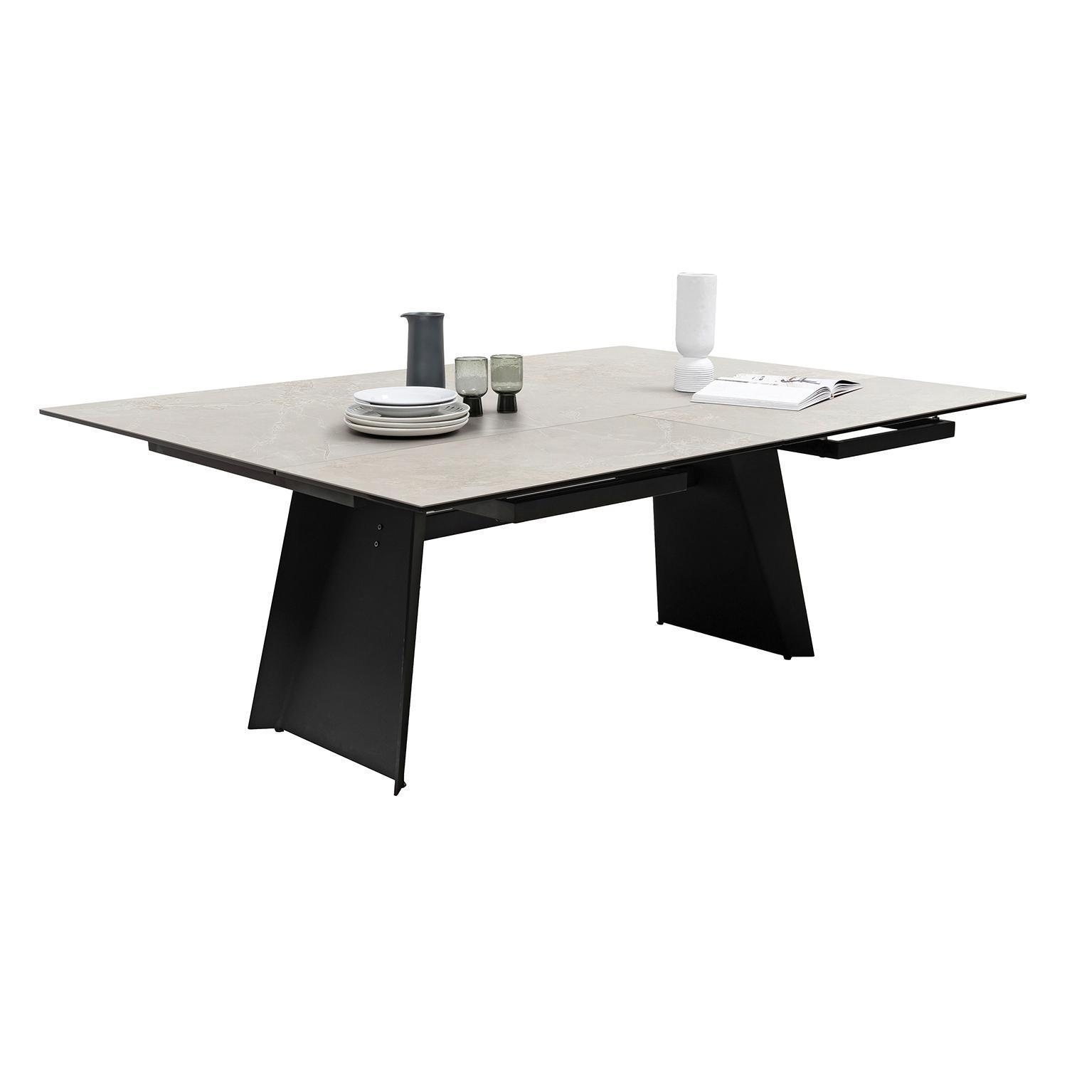 Der Esstisch MAGIUS verfügt über eine Tischplatte aus Keramik und Sicherheitsglas, die eine graue, marmorierte Optik aufweist. Getragen wird die Konstruktion von einem Gestell aus mattschwarz lackiertem Metall. Der Tisch lässt sich in der Tiefe von 100 cm auf 145 cm erweitern oder in der Breite von 200 cm auf bis zu 290 cm ausziehen. In der Grundkonfiguration betragen die Abmessungen 200 cm in der Breite, 76 cm in der Höhe und 100 cm in der Tiefe.