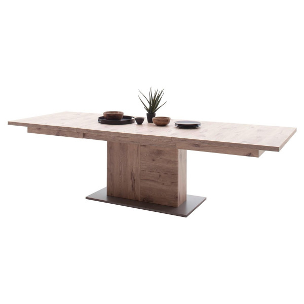Der Esstisch MODENA ist in Viking Eiche Dekor gestaltet. Das Möbelstück verfügt über eine stabile Bodenplatte in Silbergrau und ist mit einem beidseitigen Synchronauszug ausgestattet. Durch diesen lässt sich der Tisch zweifach von einer Ausgangsbreite von 180 cm auf 230 cm oder 280 cm erweitern. Die Höhe beläuft sich auf 77 cm, während die Tiefe 100 cm beträgt.