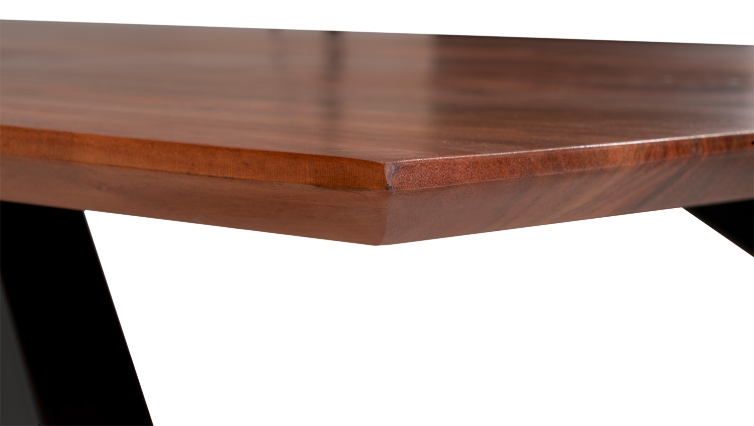 Der Couchtisch verfügt an beiden Längsseiten über eine schweizer Kante. Dabei verlaufen die Tischkanten nicht gerade nach unten, sondern sind sowohl nach unten als auch nach hinten abgeschrägt.