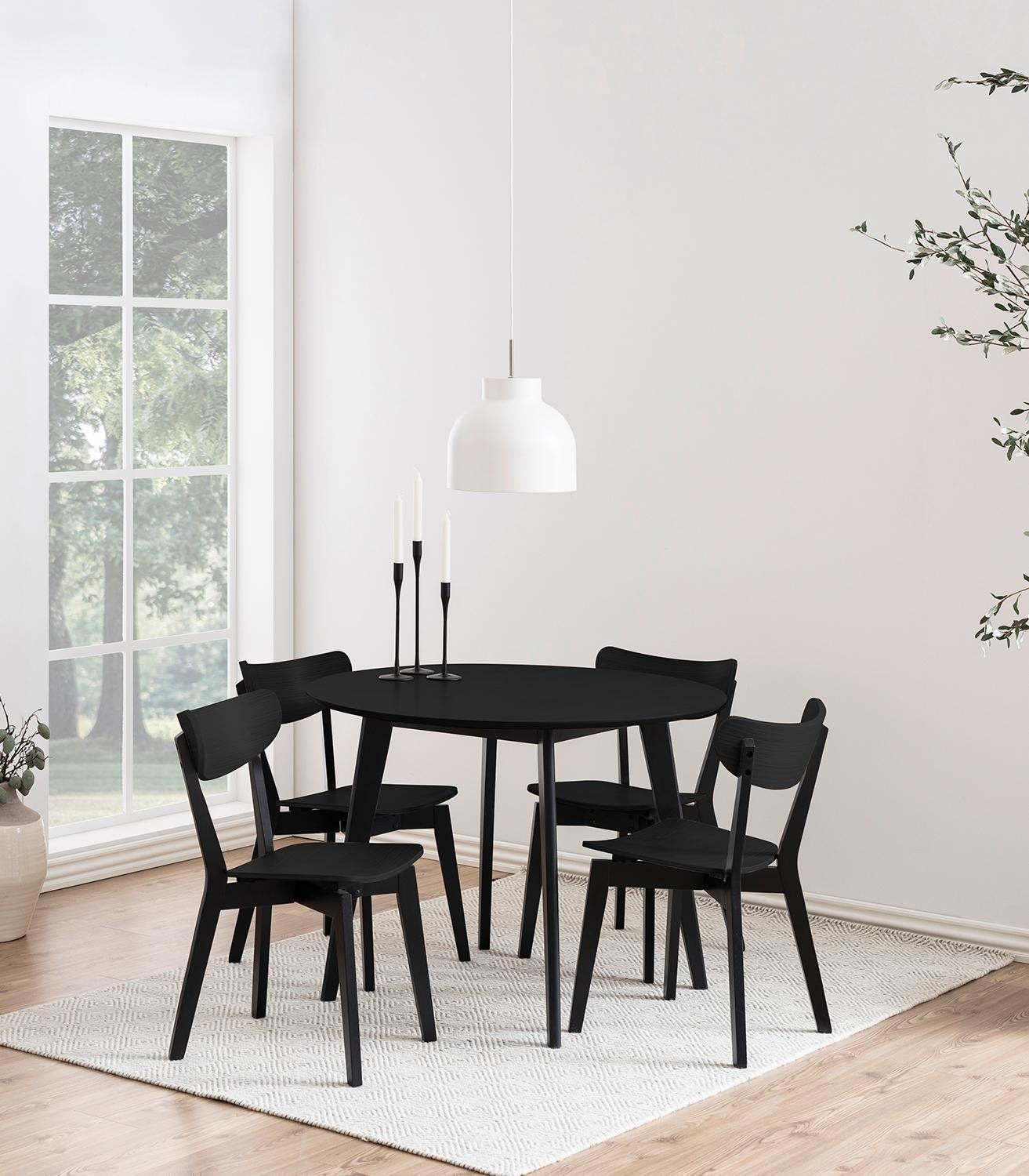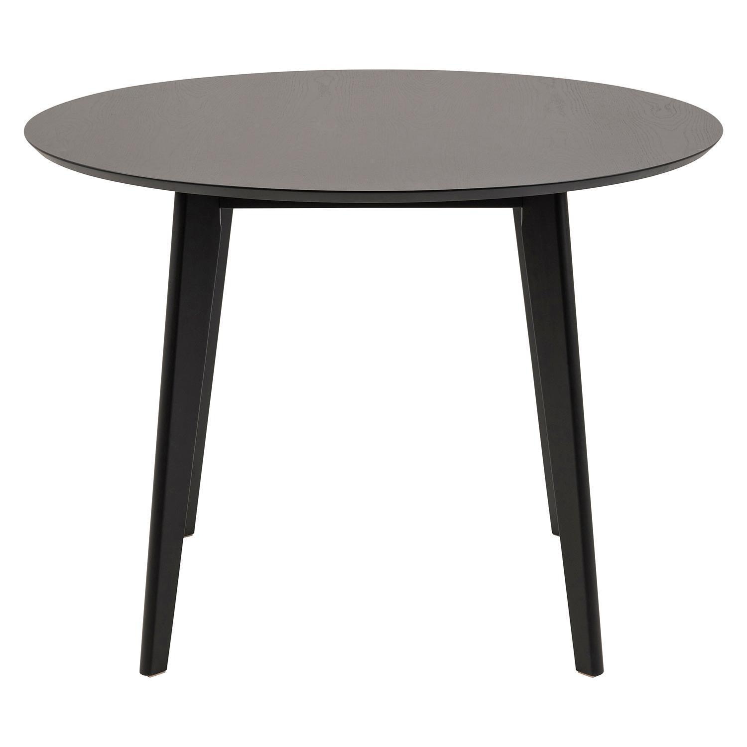 Der Esstisch REYNOLD verfügt über eine runde Tischplatte aus schwarz furniertem Eichenholz. Das Gestell besteht aus massivem Gummibaumholz und ist ebenfalls in Schwarz gehalten. Der Tisch bietet Platz für bis zu vier Personen und eignet sich für den Einsatz in Küche, Esszimmer oder Wohnzimmer. Der Durchmesser beträgt 105 cm, die Höhe liegt bei 70 cm.